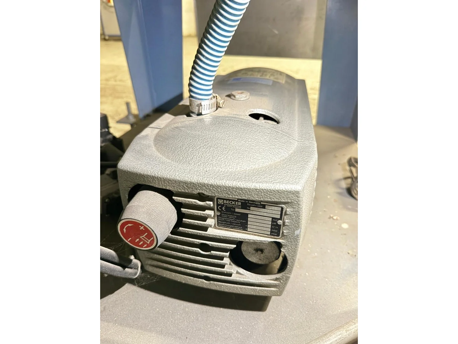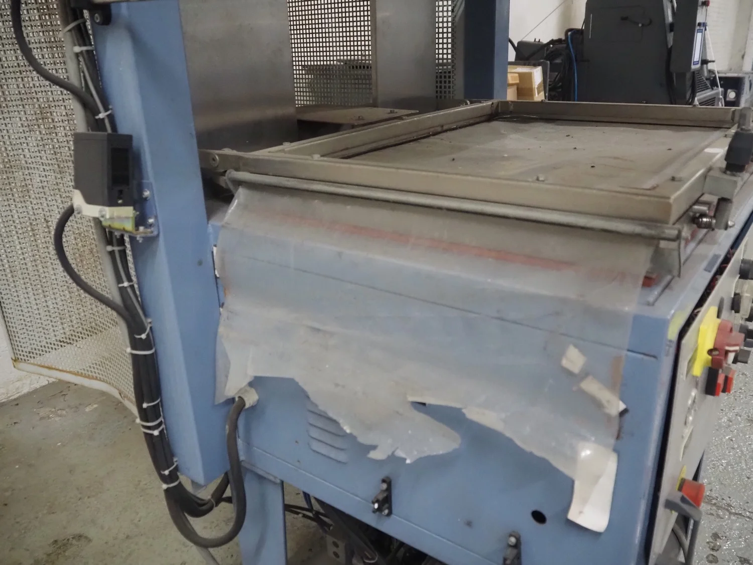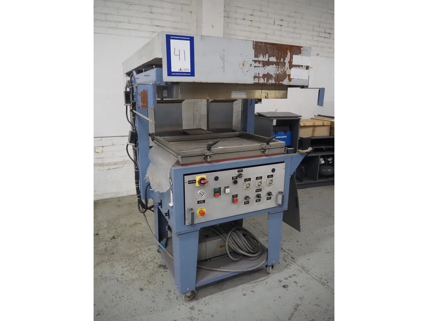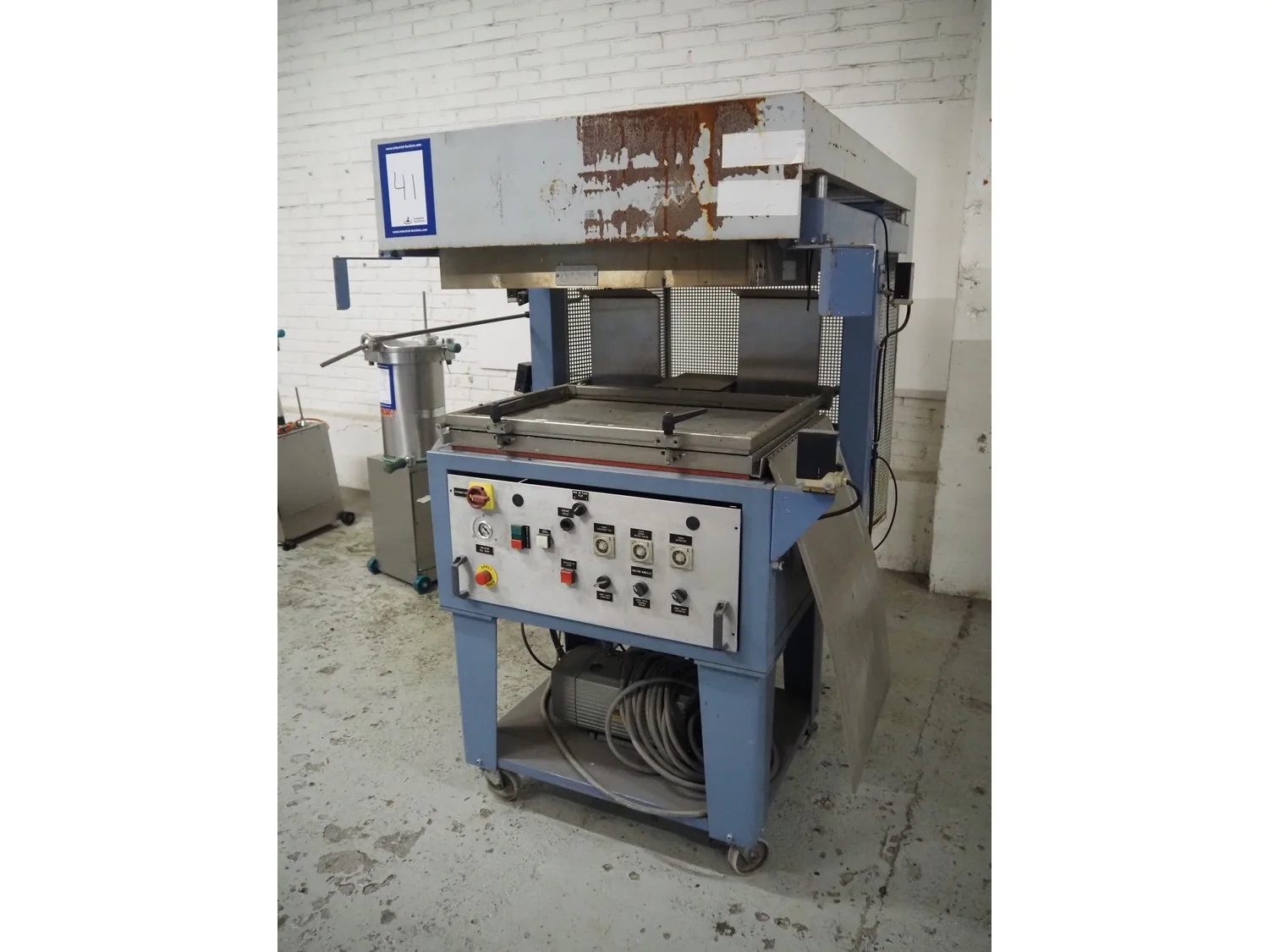 CB Emballage S.A. mobile tray forming machine, type: MSA 5070M, serial number: 59115 M, year of construction: 2000, 380 V, 14 A, 8500 Watt, working width: 750 mm and 550 mm, film width: 550 mm, with Becker vacuum pump, type: VT 4.16, number: 1507556, year of construction: 1998, capacity: 16/19 m³ per hour, total dimensions: 1600 mm x 1200 mm x 1700 mm.