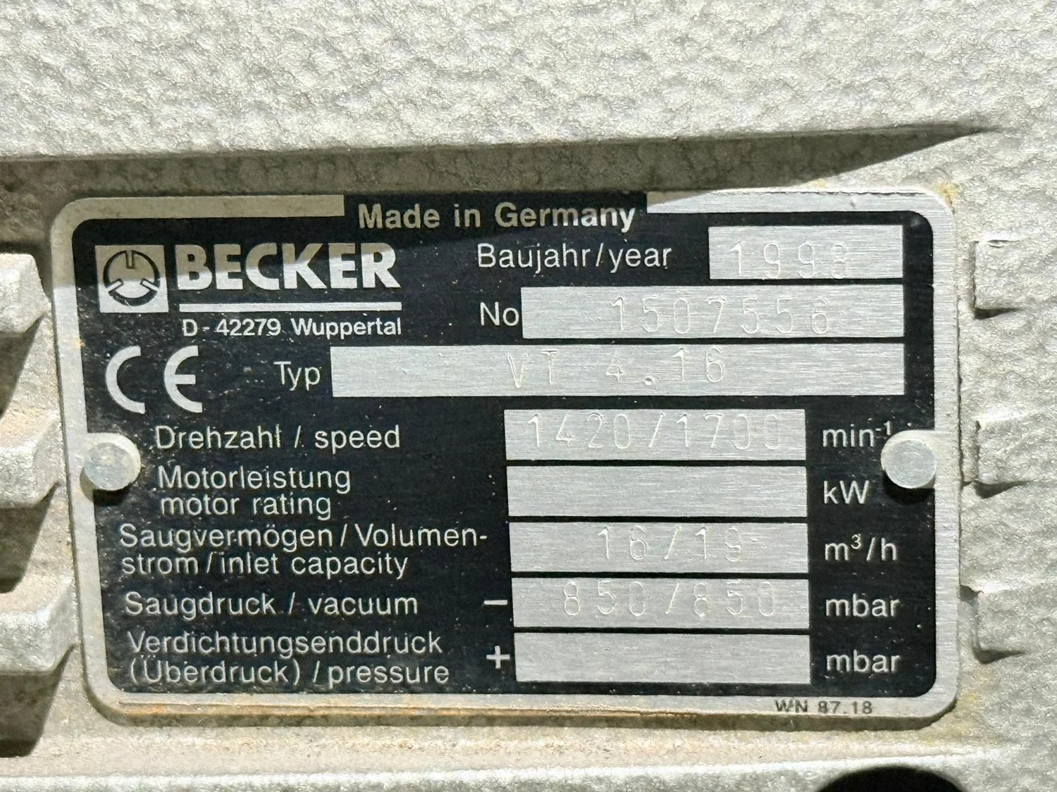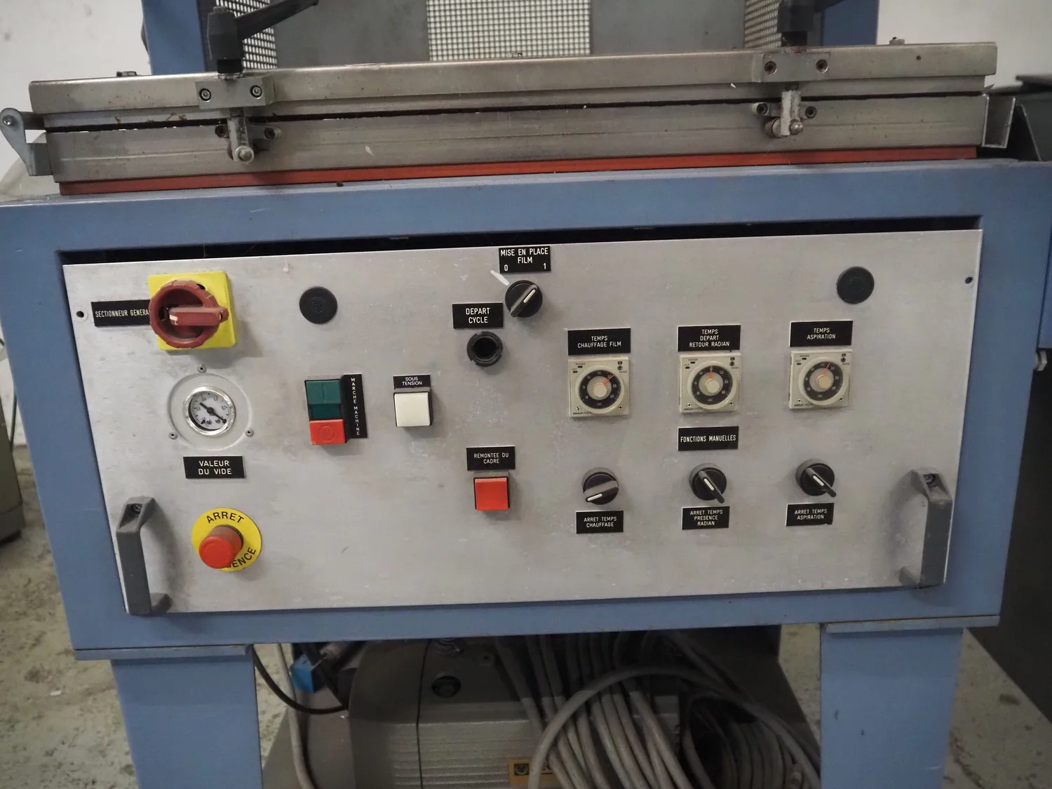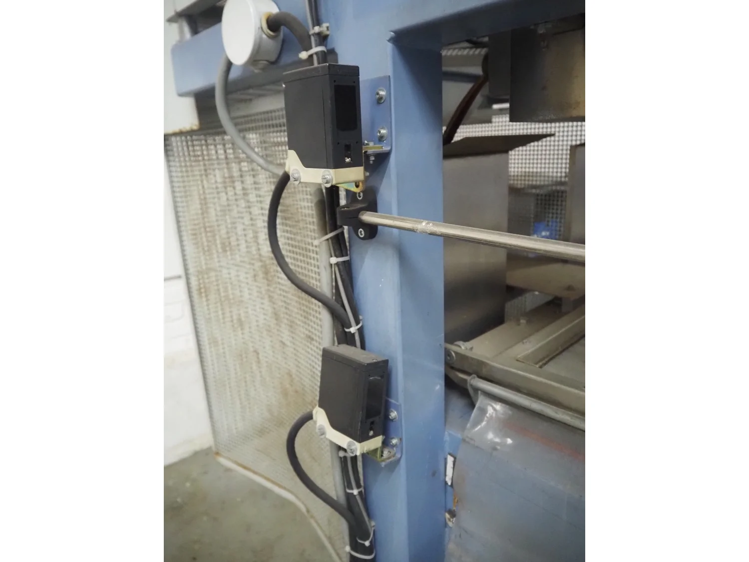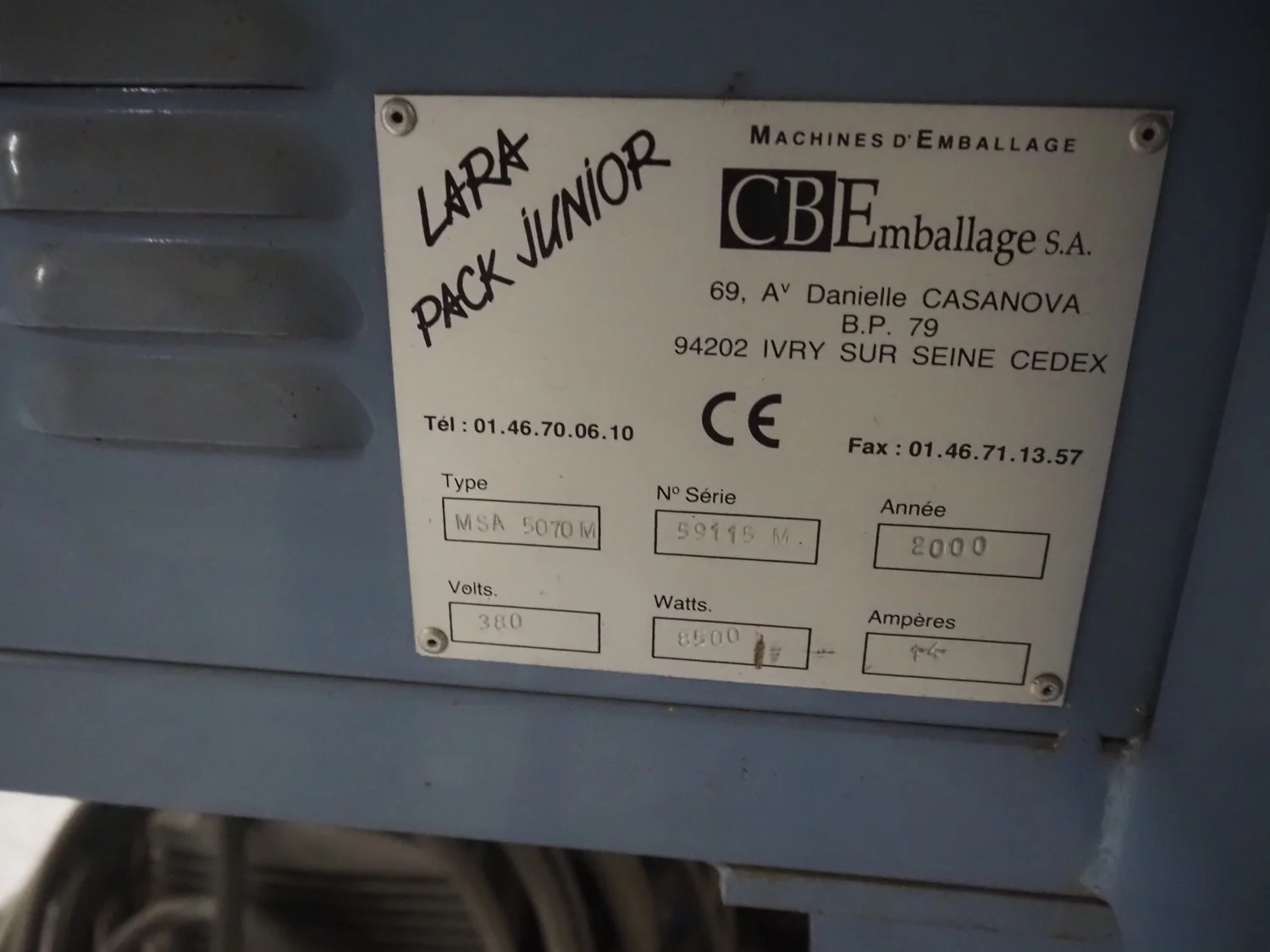 CB Emballage S.A. mobile tray forming machine, type: MSA 5070M, serial number: 59115 M, year of construction: 2000, 380 V, 14 A, 8500 Watt, working width: 750 mm and 550 mm, film width: 550 mm, with Becker vacuum pump, type: VT 4.16, number: 1507556, year of construction: 1998, capacity: 16/19 m³ per hour, total dimensions: 1600 mm x 1200 mm x 1700 mm.
