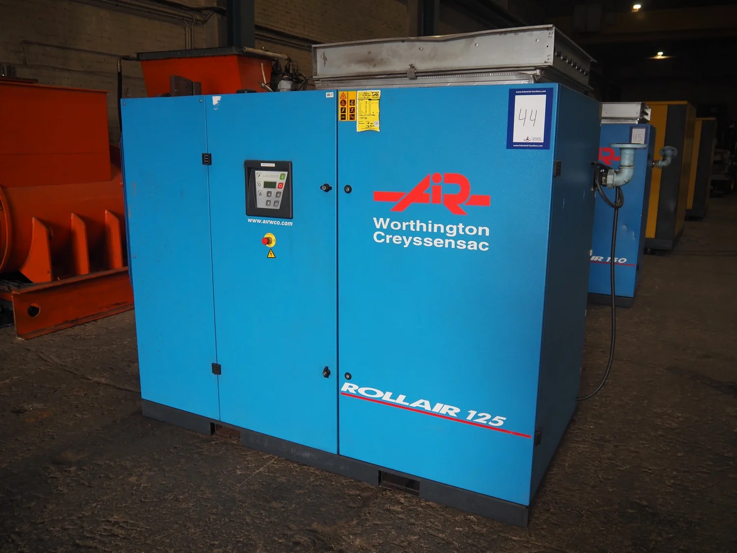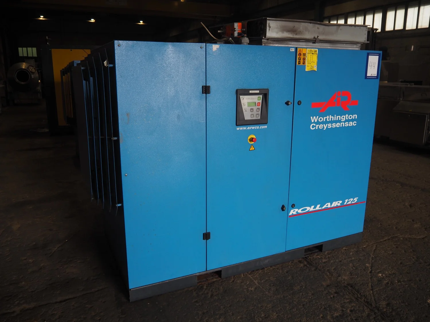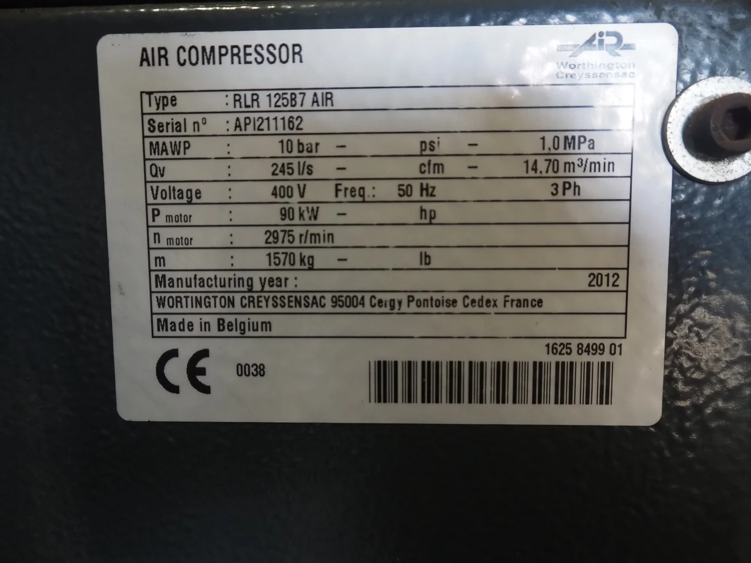 Worthington Creyssensac air compressor, type: RLR 125B7 AIR, serial number: API211162, year of construction: 2012, 400 V, 3 Ph, 50 Hz, 90 kW, weight: 1570 kg, dimensions: 2300 mm x 1100 mm x 1800 mm. Including switch cabinet, dimensions: 600 mm x 400 mm x 800 mm.