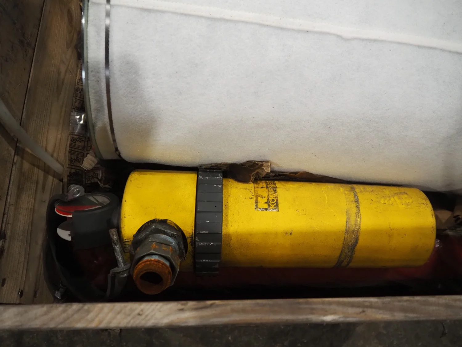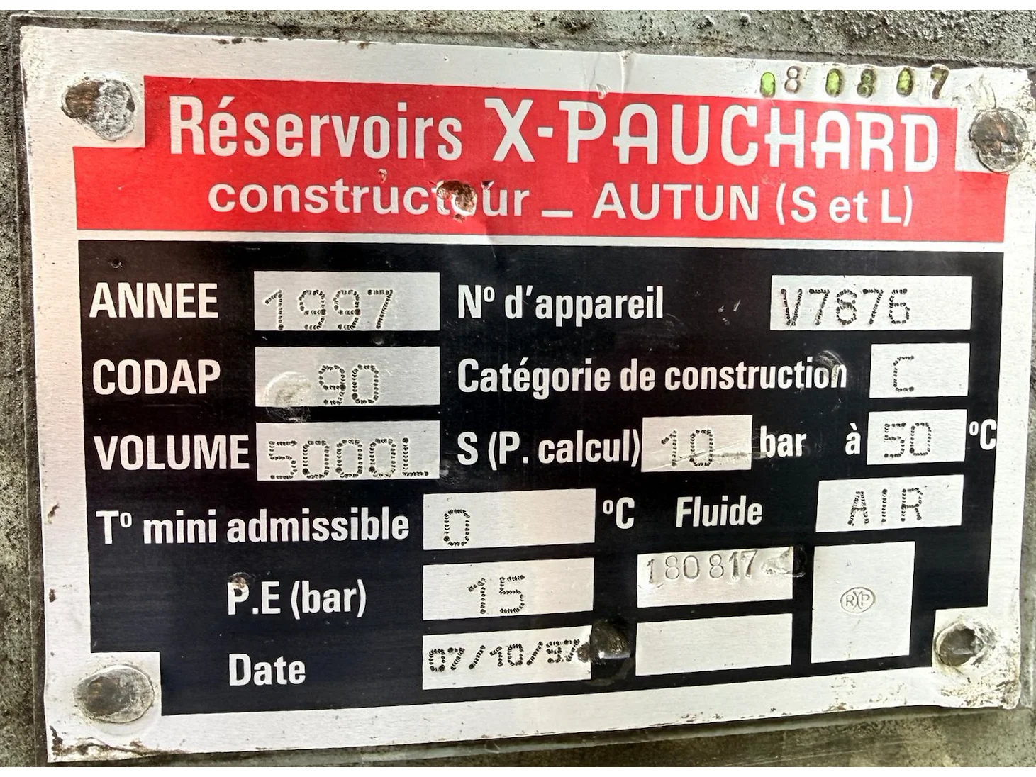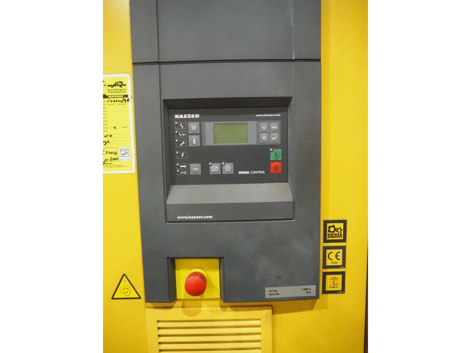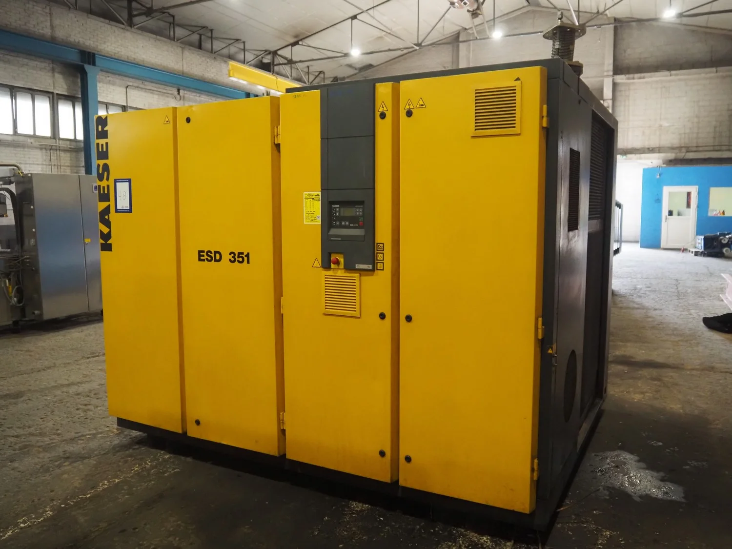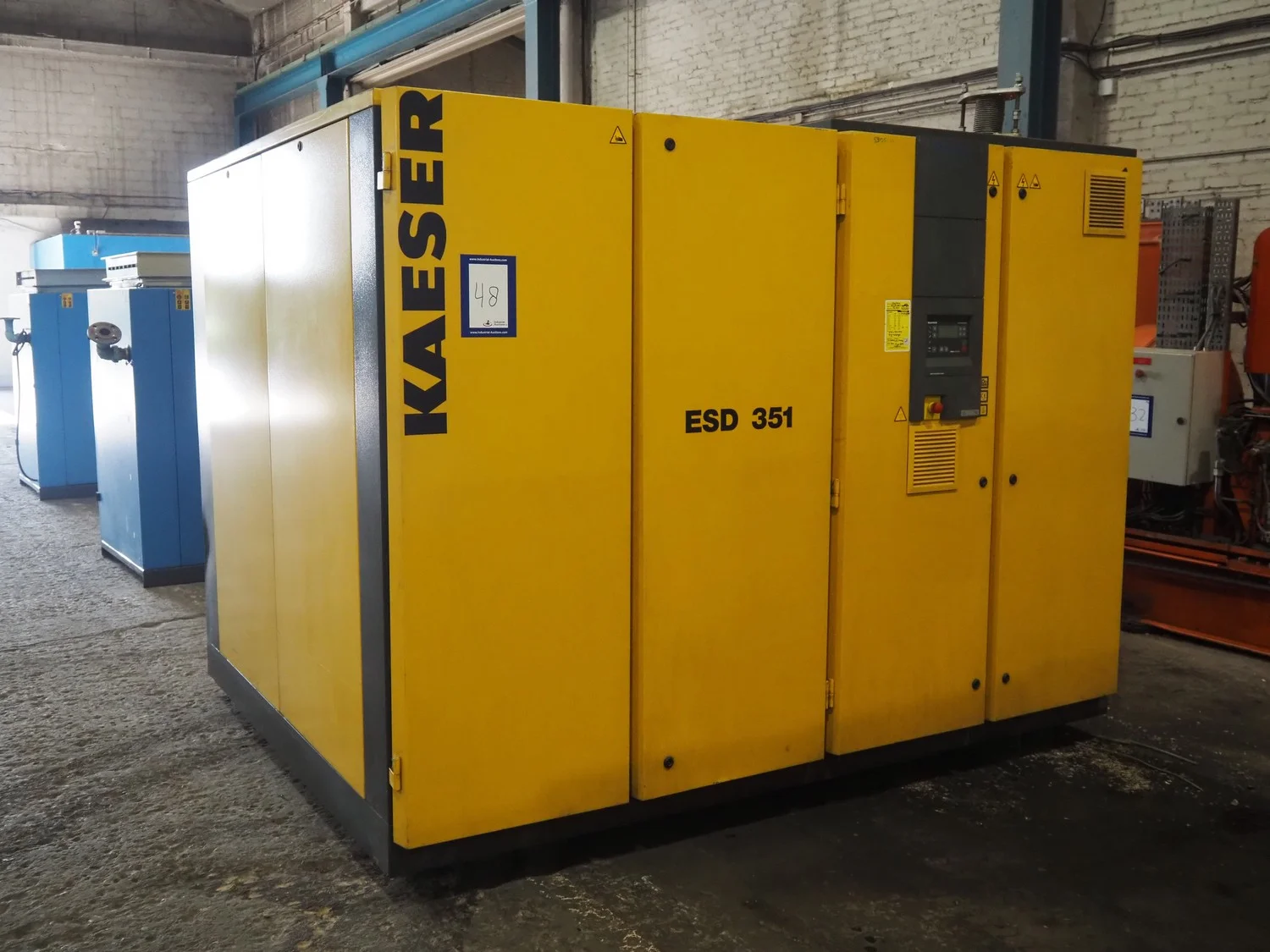 Kaeser kompressoren GmbH screw air compressor, model: ESD 351, serial number: 1073, year of construction: 2007, 400 V, 3 Ph, 50 Hz, 410 A, 200 kW, dimensions: 2650 mm x 2200 mm x 2350 mm. Including steel pressure vessel, number: 136 195, volume: 5000 liter, dimensions: ⌀ 1400 mm x 3900 mm, pallet with parts and switch cabinet, dimensions: 600 mm x 400 mm x 800 mm.