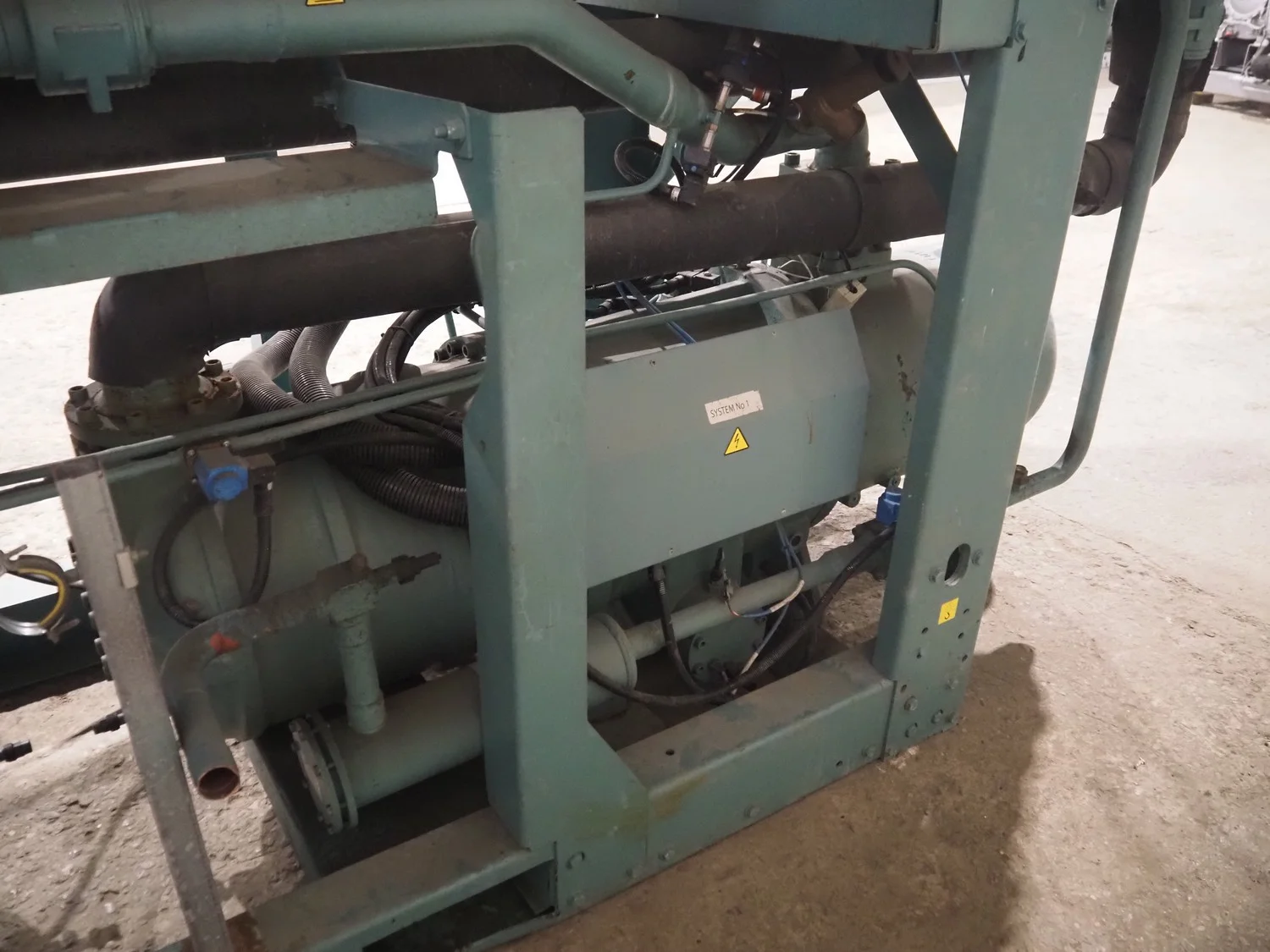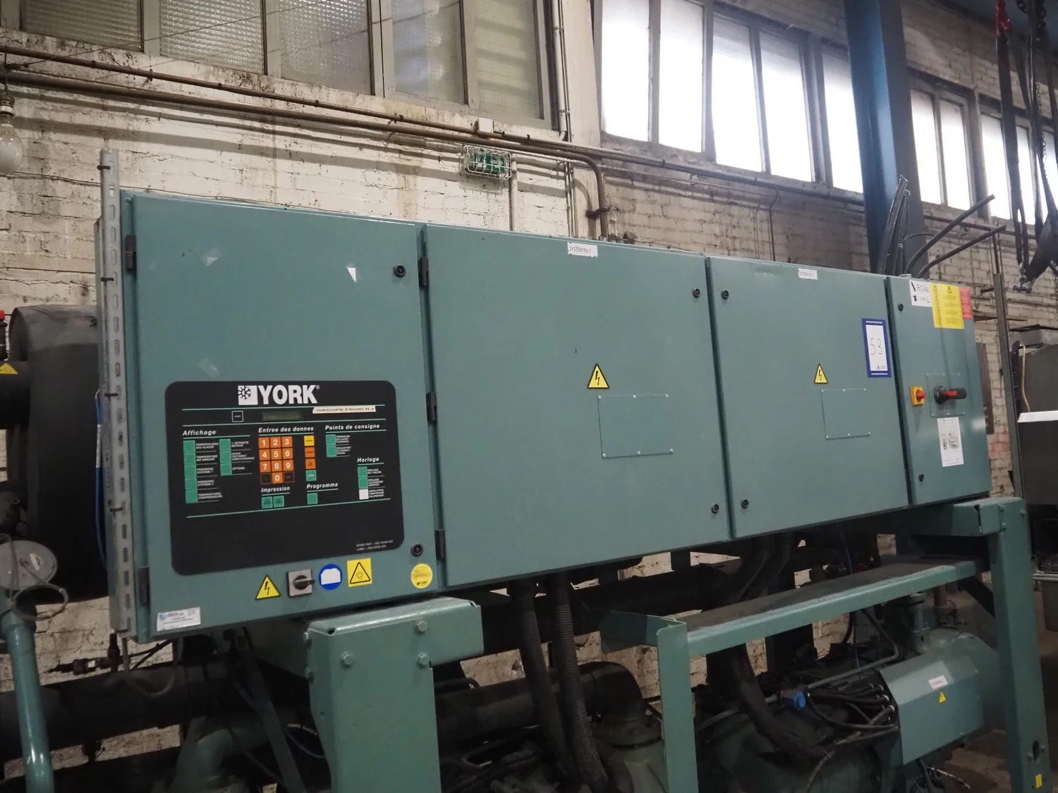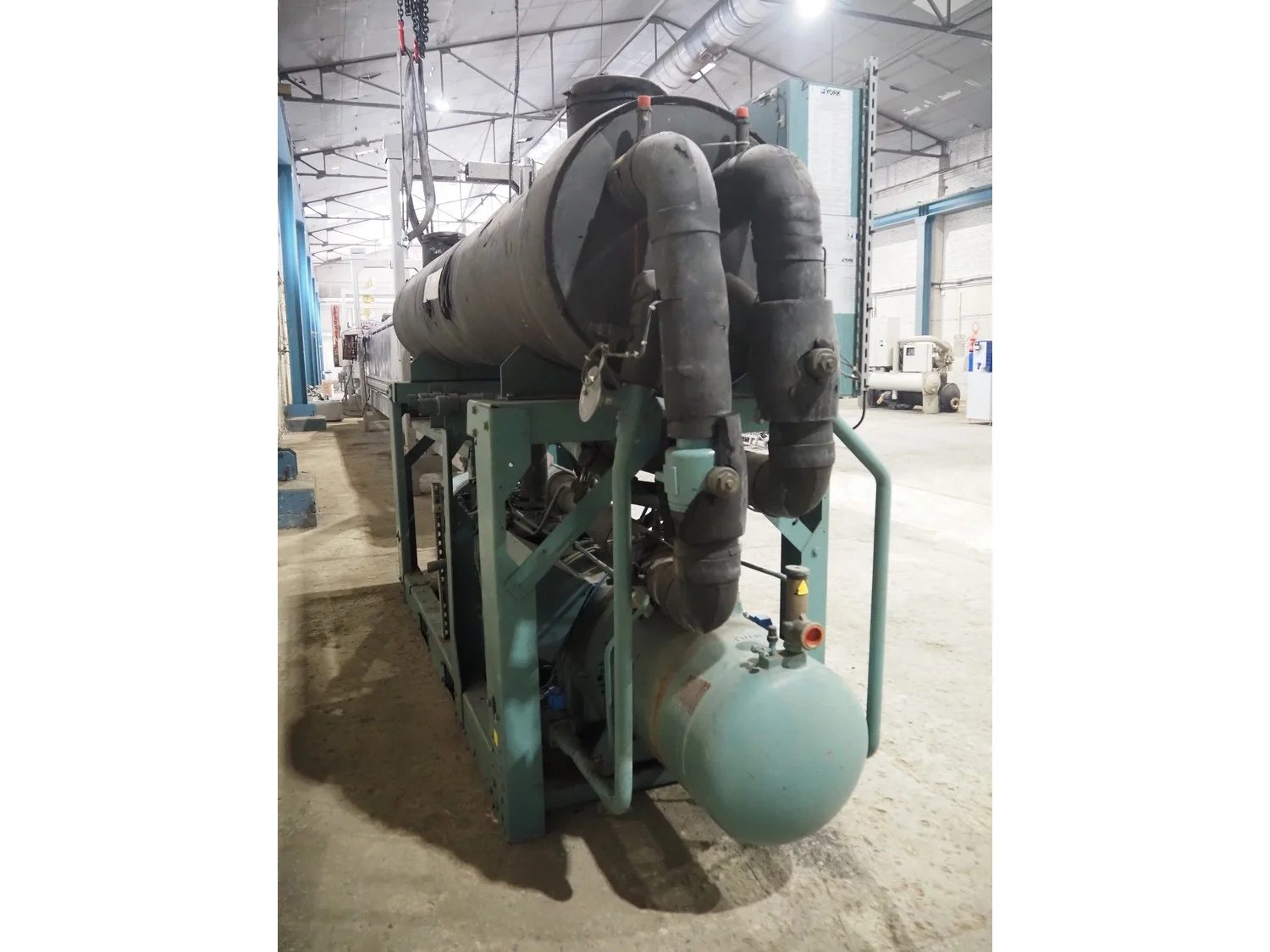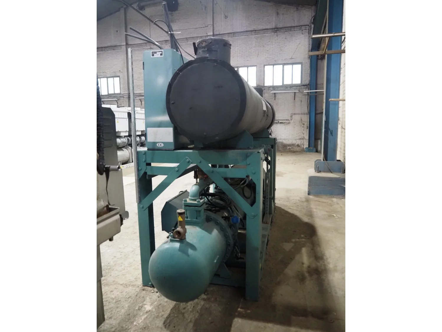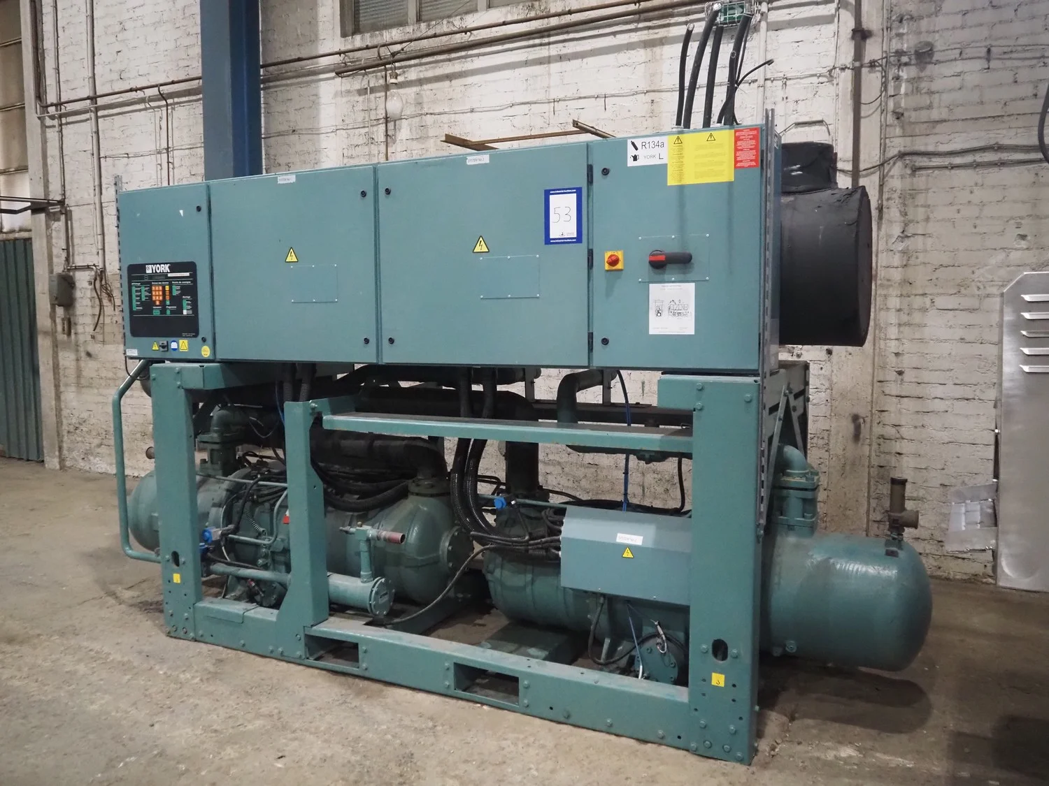 York YLCS water cooled screw chiller, with 2 York screw compressors, type: YLCS 0840AA, model: L-A-H and M-A-I, serial number: 7A9316 and 6AA927, year of construction: 2007 and 2006, 400/460 V, 3 Ph, 50/60 Hz, capacity: 598/735 and 774/952 m³ per hour, refrigerant: R134a, cooling capacity: 788 kW, dimensions: 4100 mm x 1100 mm x 2170 mm. Including pallet with liquid vessel, type: FS902, serial number: 1172403249, year of construction: 2007, volume: 89 liter, dimensions: 1500 mm x 800 mm x 450 mm.