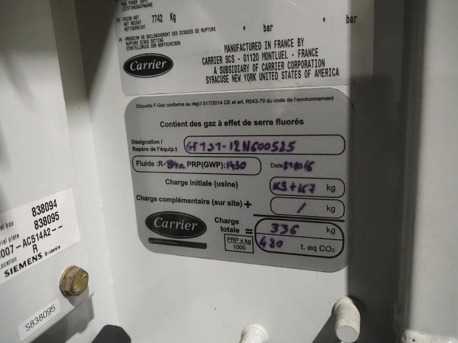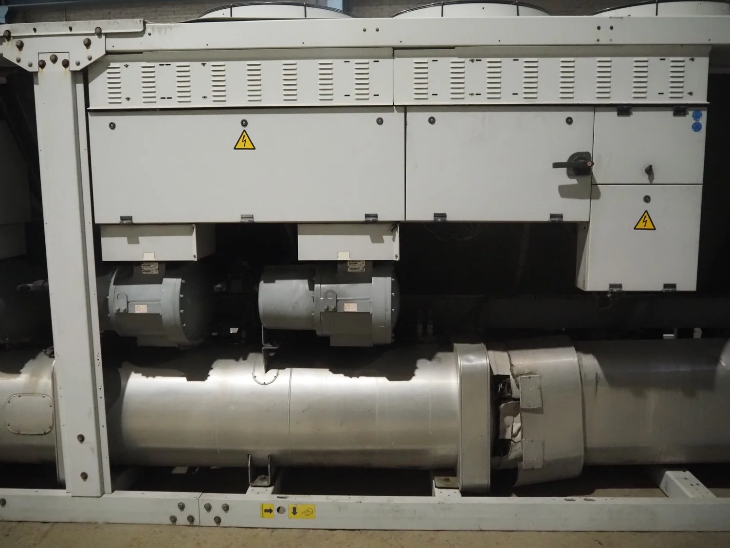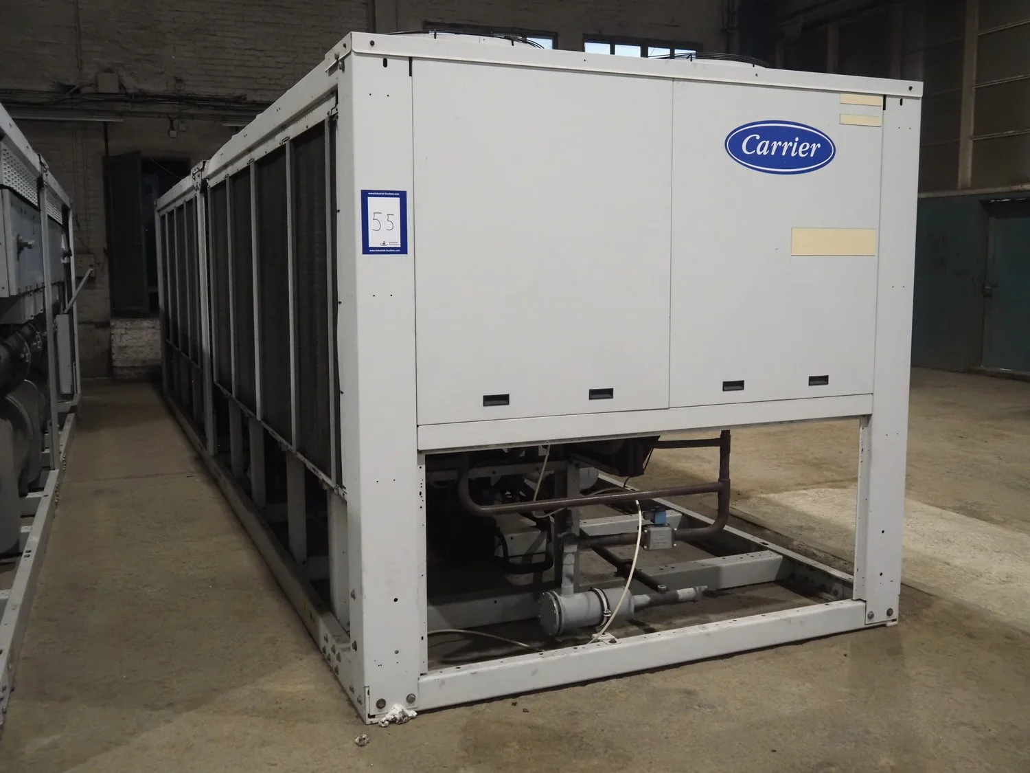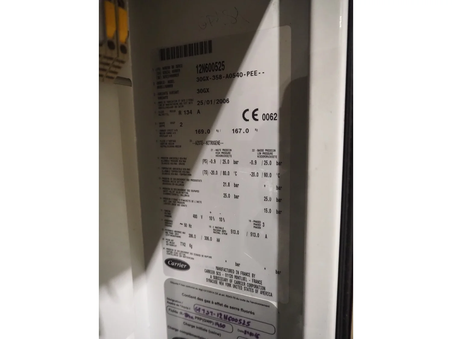 Carrier chiller, model: 30GX-358-A0540-PEE, serial number: 12N600525, year of construction: 25-01-2006, refrigerant: R134A, 400 V, 3 Ph, 50 Hz, 513 A, 306 kW, capacity: 1203 kW, dimensions: 9350 mm x 2300 mm x 2300 mm.