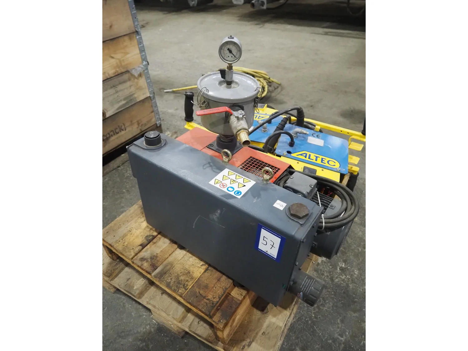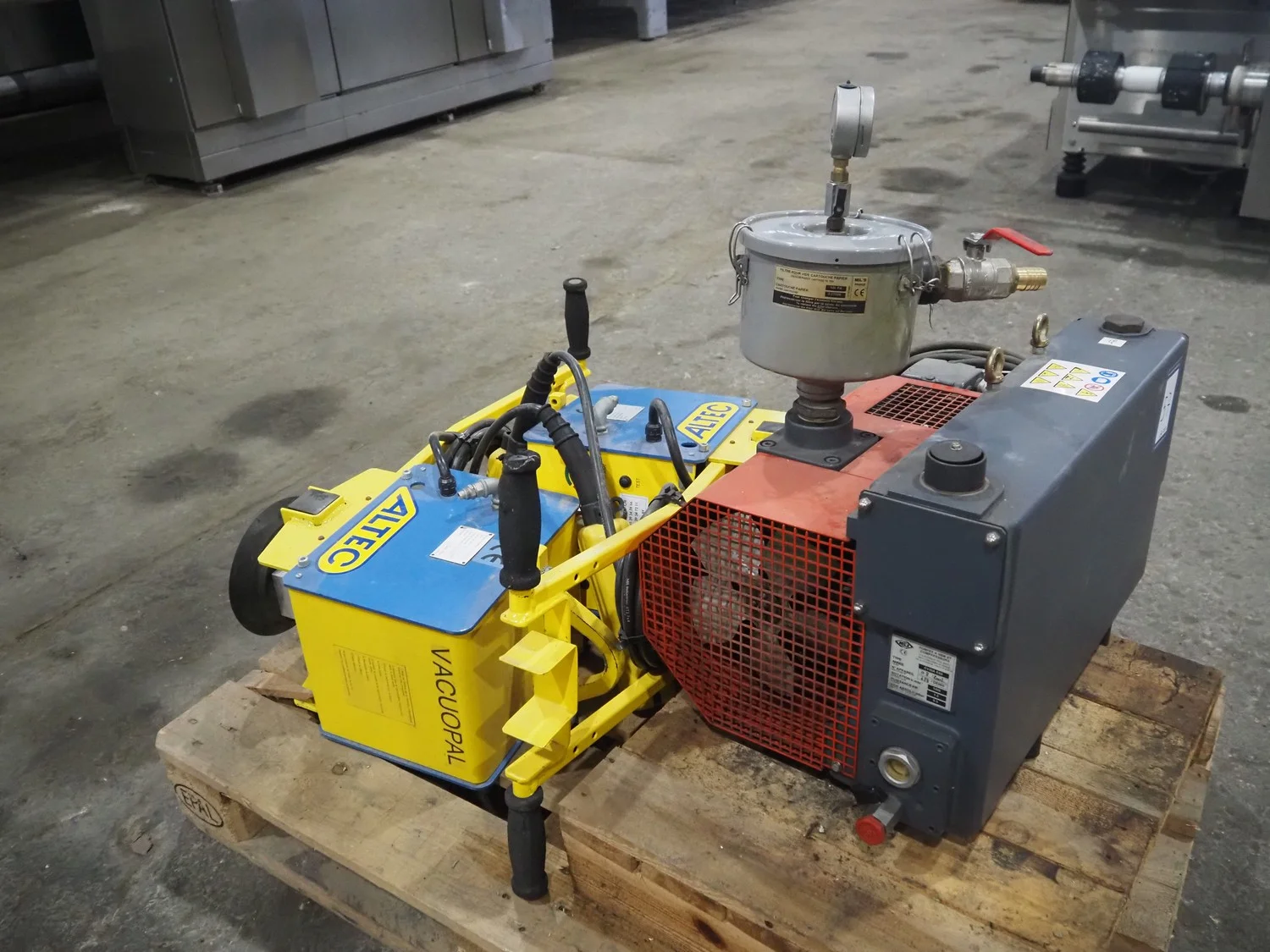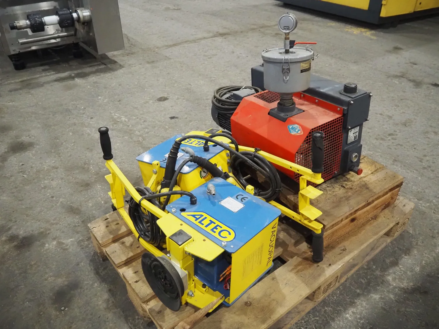 Altec vacuum gripper, consisting of 2 Altec suction cups, model: (2x) VAC11PH, serial number: 920111 and 922111, year of construction: 26-11-2001, with Mil's vacuum pump, type: EVISA E65, machine number: 488/GE065, year of construction: 08/2002, 1450 r.p.m, 0.5 mbar, ⌀ suction nap: (2x) 200 mm, total dimensions: 1200 mm x 800 mm x 1200 mm.