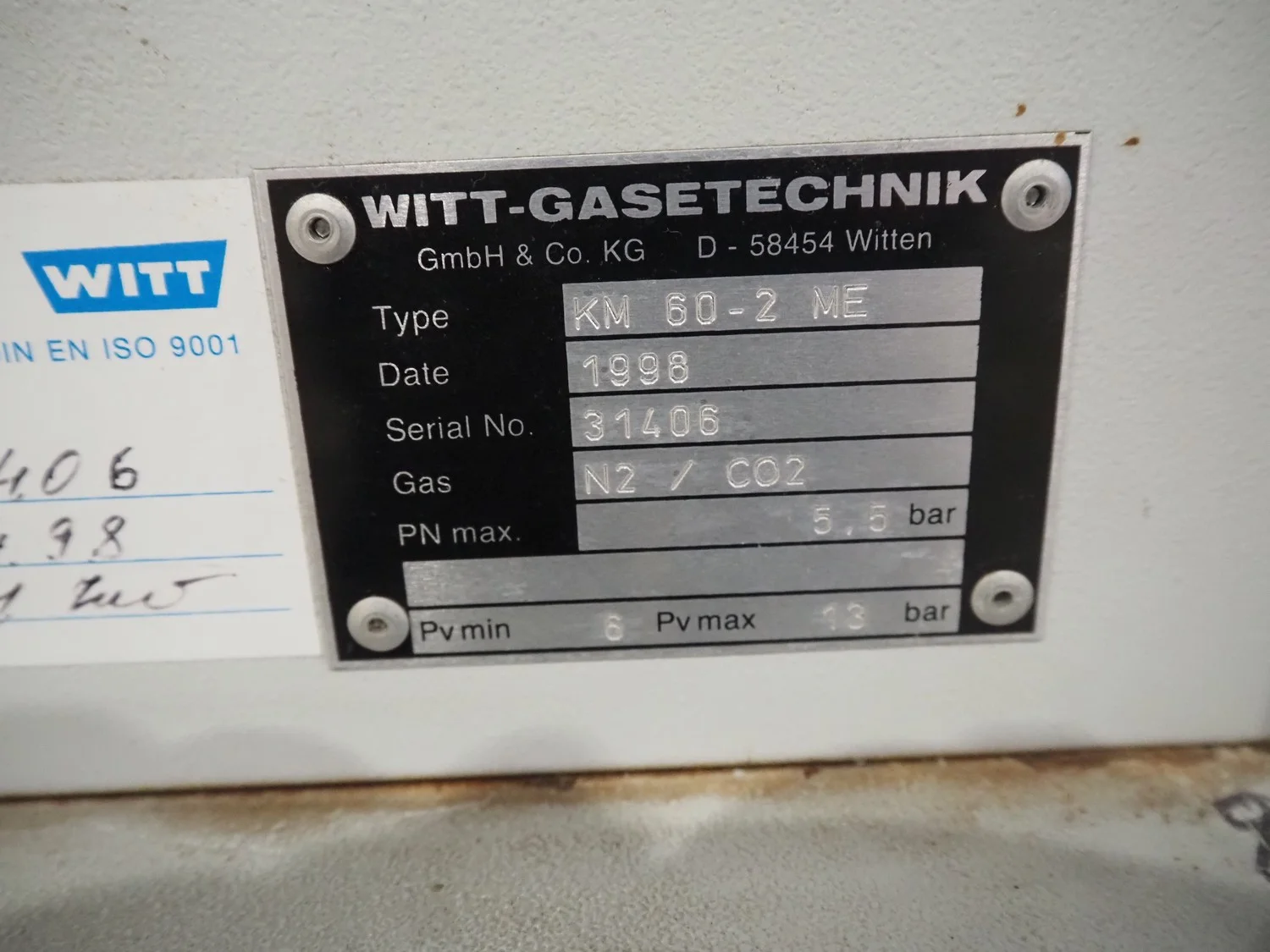 Witt-Gastechnik gas mixing station with tank, type: KM 60-2 ME, serial number: 31406, year of construction: 1998, gas: N2/Co2, dimensions: 1350 mm x 750 mm x 1050 mm.