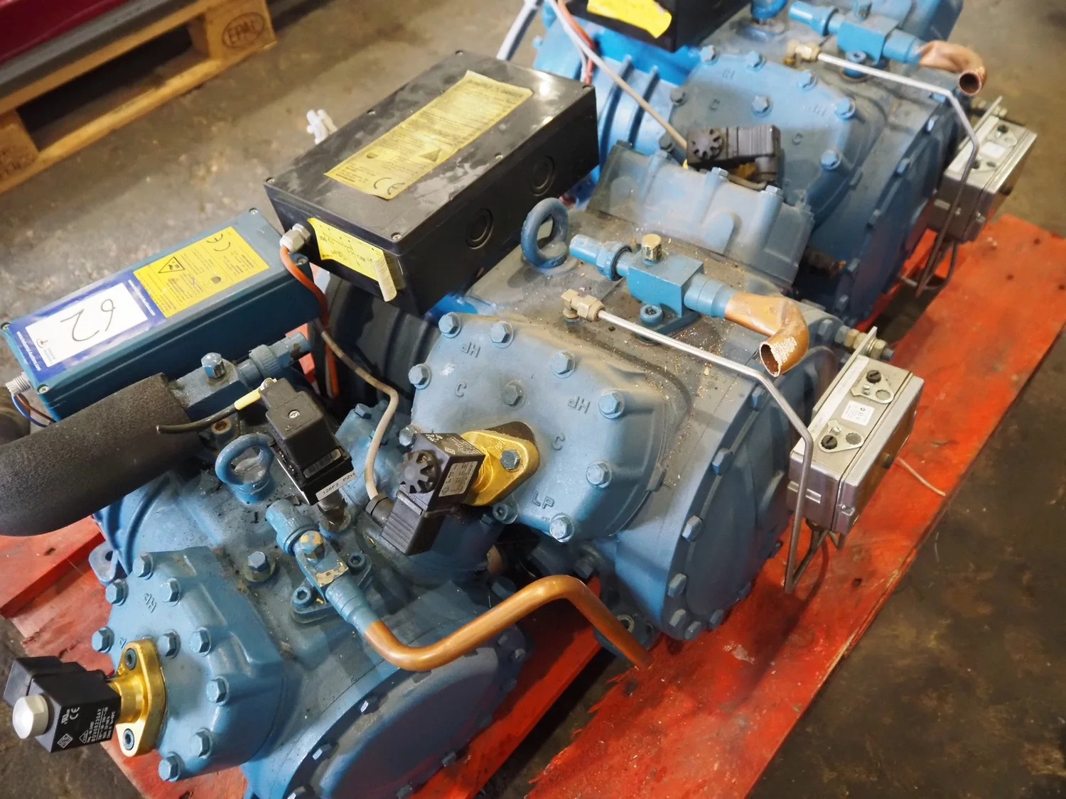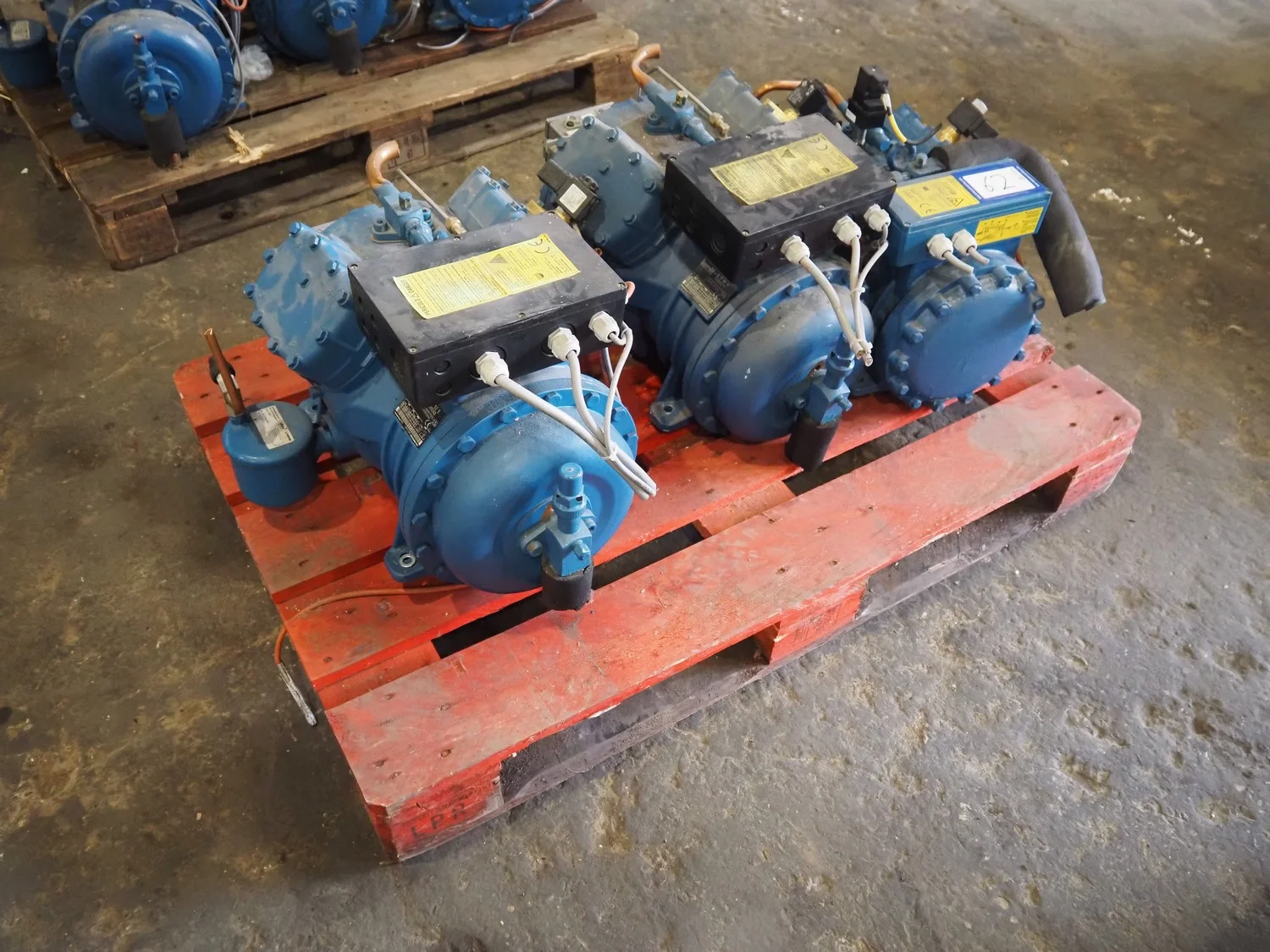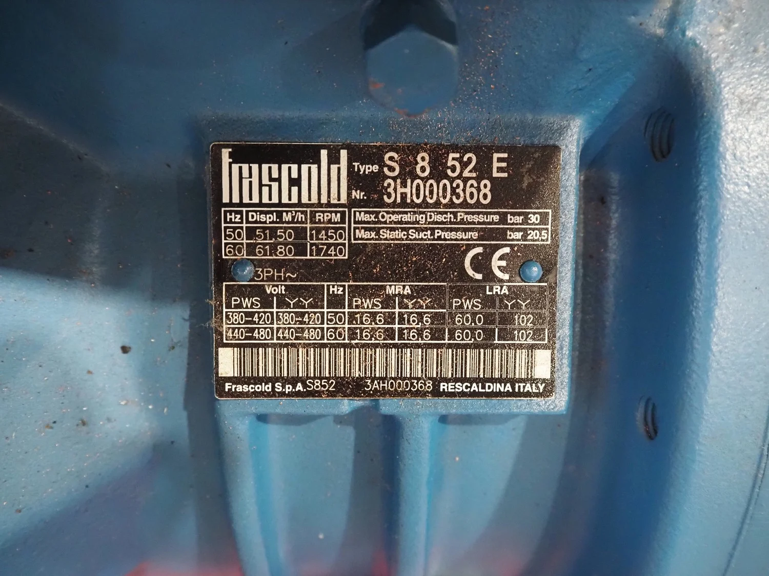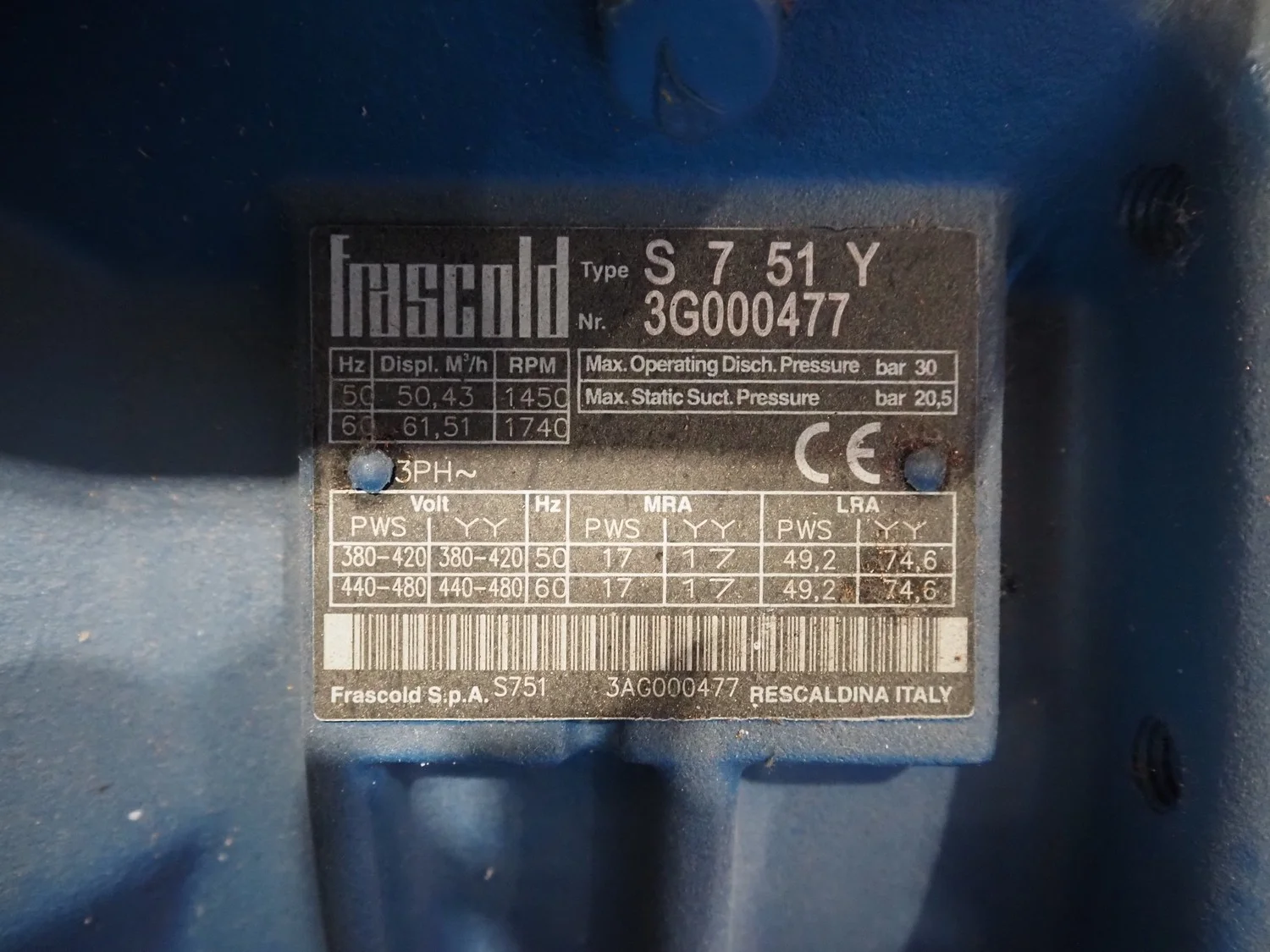 3 Frascold cooling compressors, type: S 8 52 E, capacity: 51.5/61.8 m³ per hour and type: S 7 51 Y, capacity: 50.43/61.51 m³ per hour and type: Q 5 28.1 Y 1000, capacity: 28.02/33.62 m³ per hour, dimensions: (2x) 630 mm x 500 mm x 400 mm and (1x) 530 mm x 400 mm x 400 m.