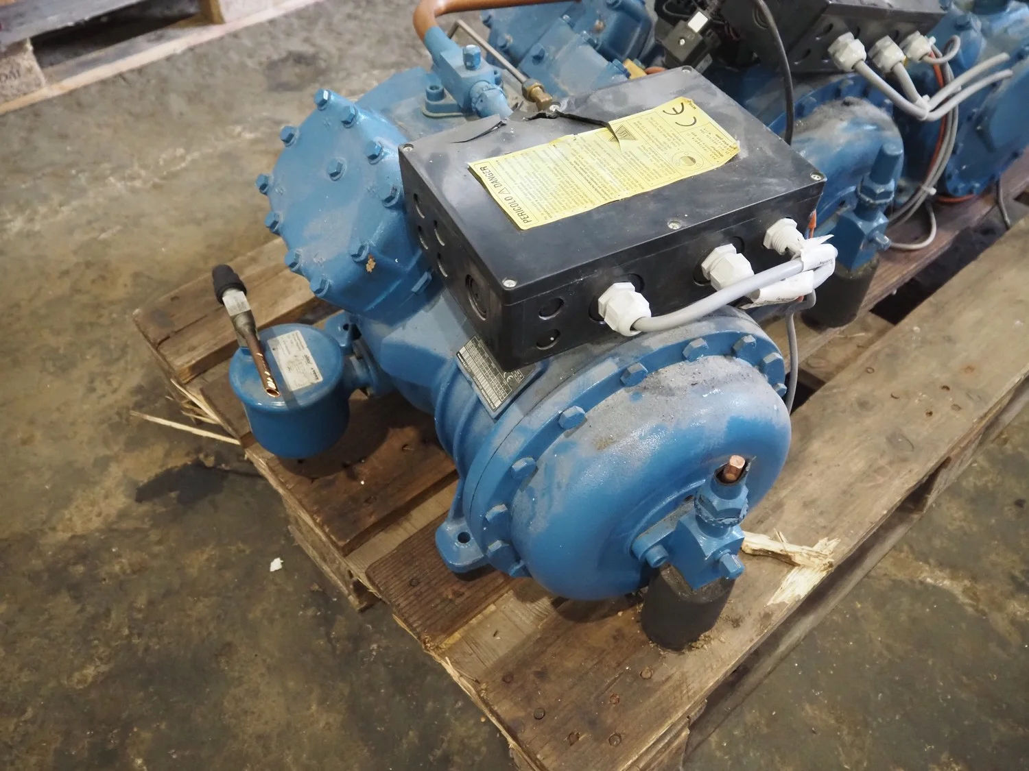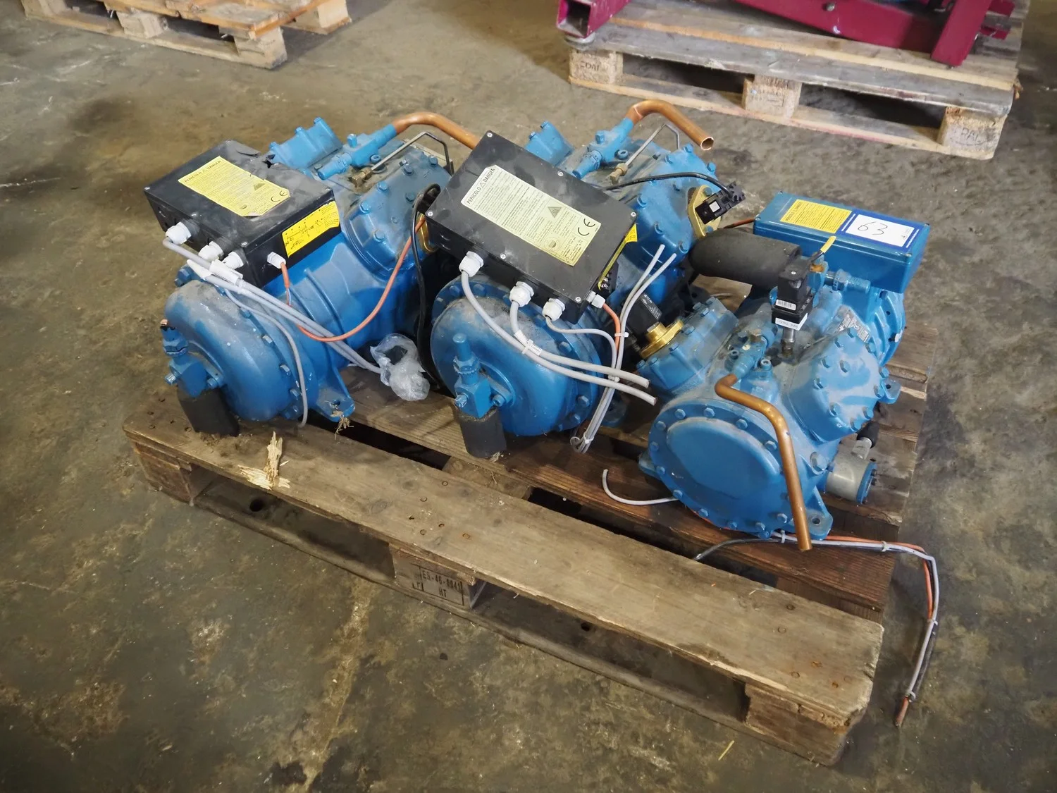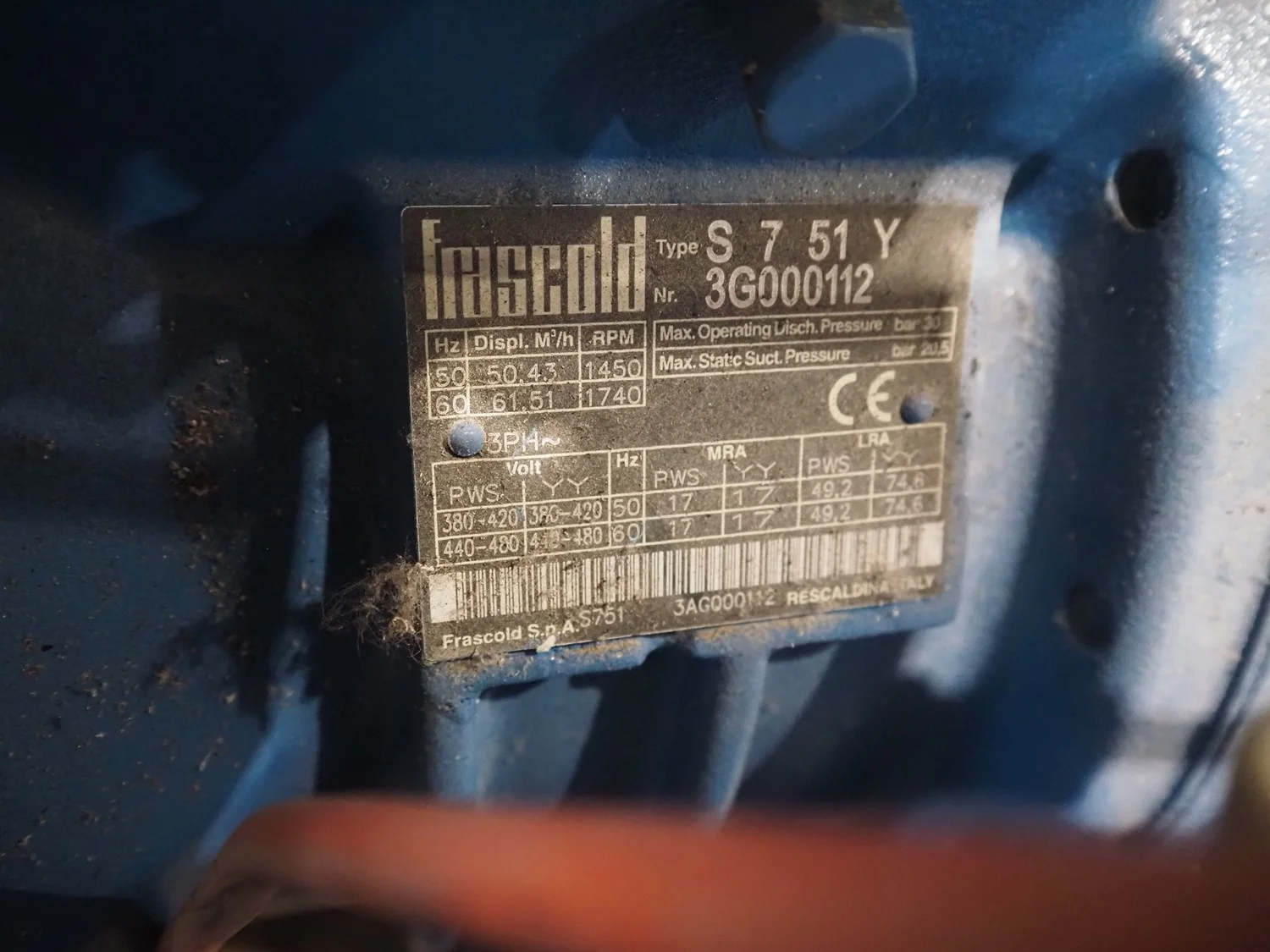 3 Frascold cooling compressors, type: (2x) S 7 51 Y, capacity: 50.43/61.51 m³ per hour and type: (1x) Q 5 28.1 Y 1000, capacity: 28.02/33.62 m³ per hour, dimensions: (2x) 630 mm x 500 mm x 400 mm and (1x) 530 mm x 400 mm x 400 m.