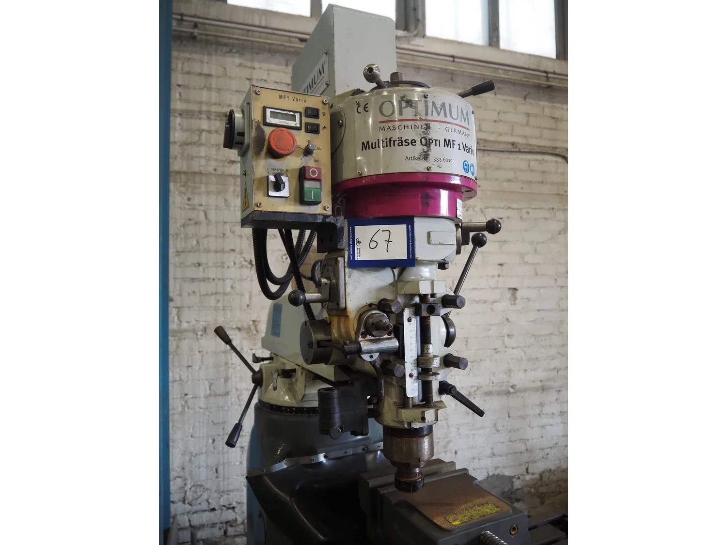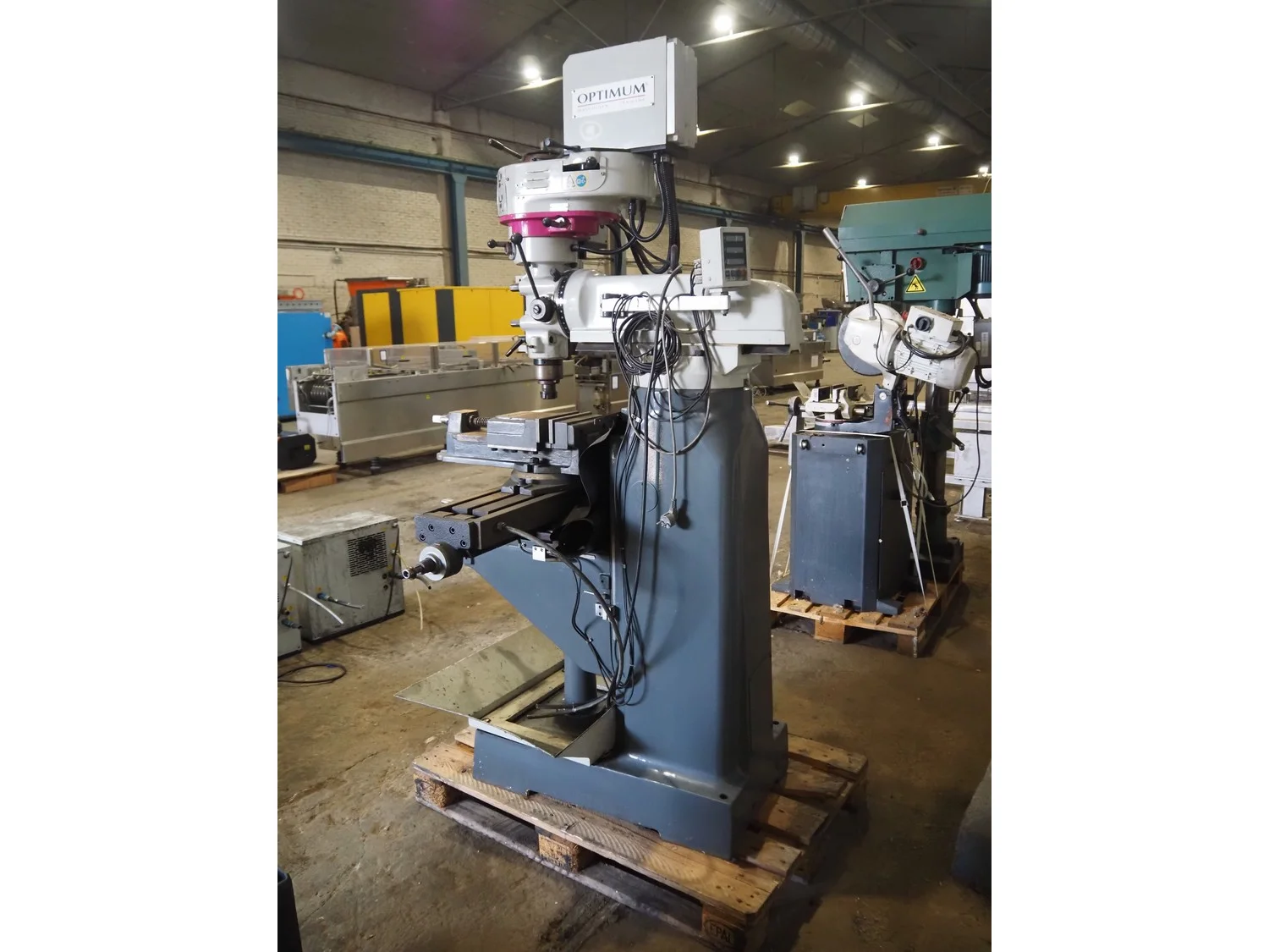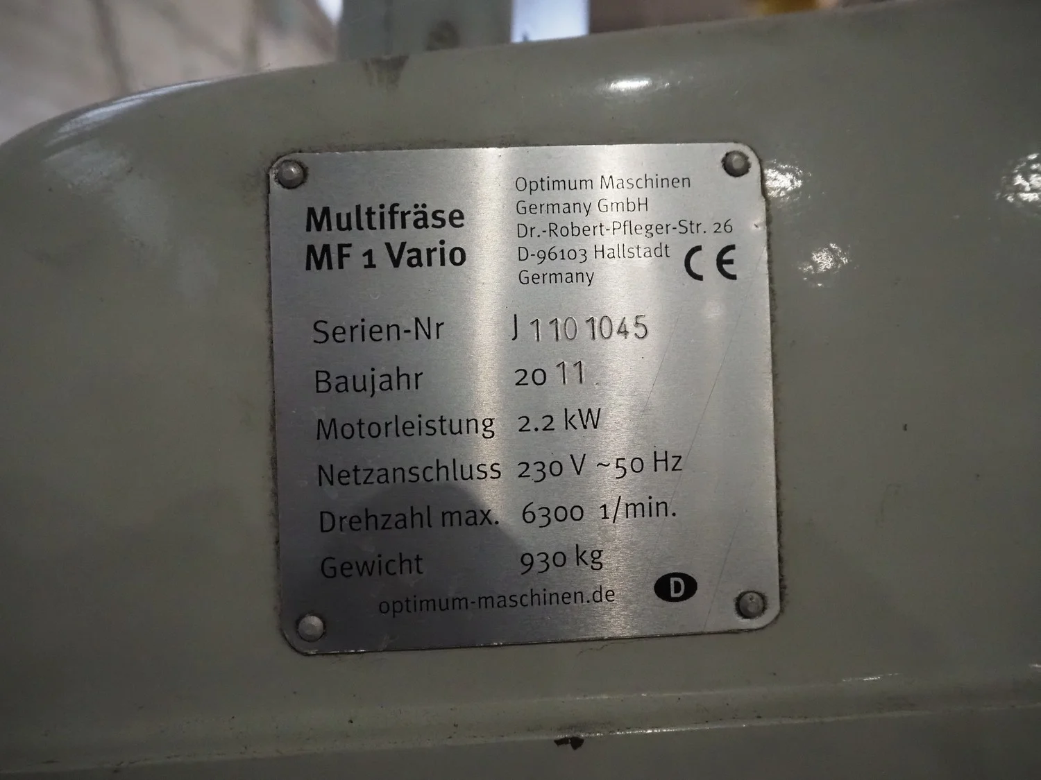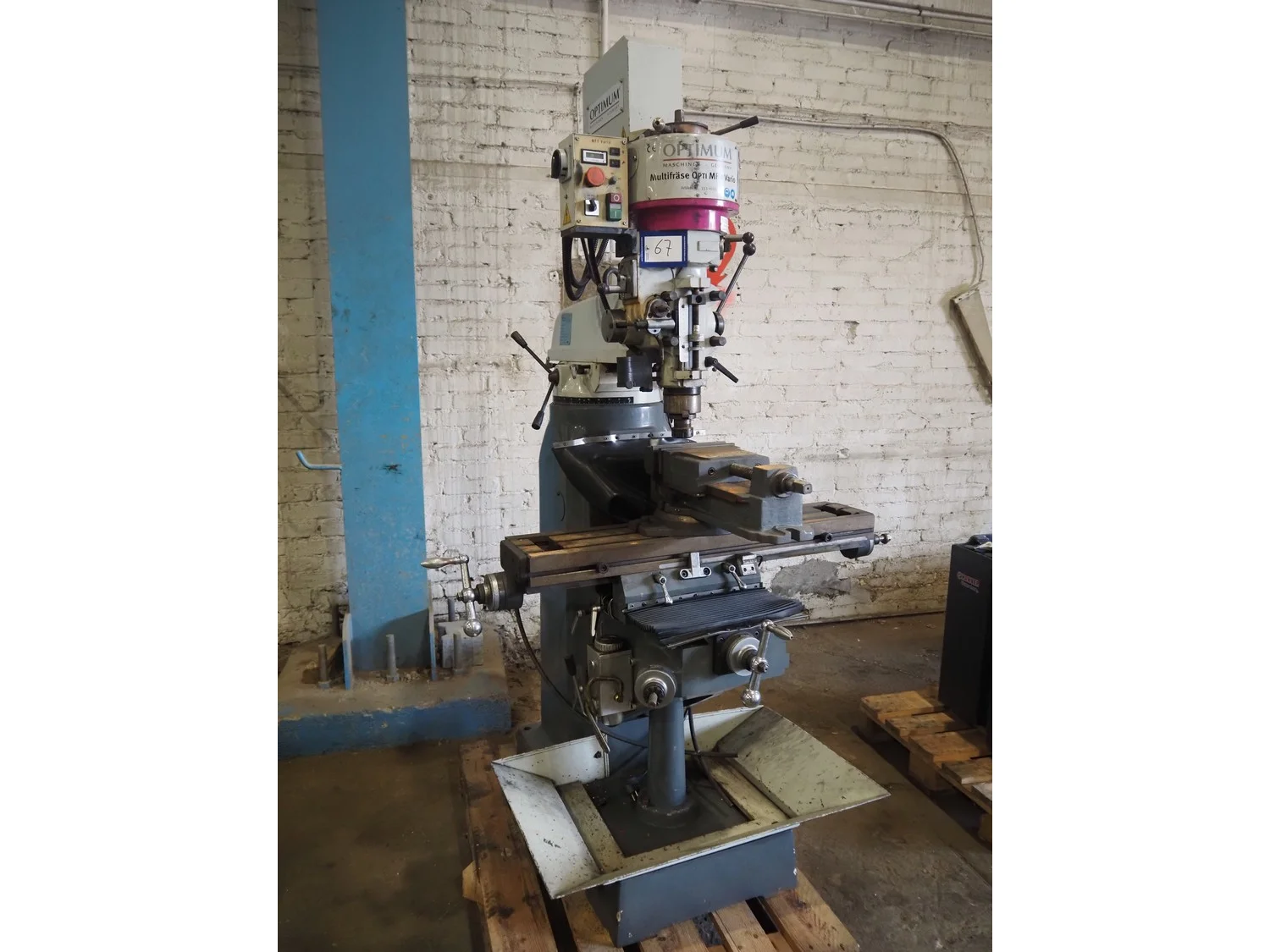 Optimum Maschinen column drill, serial number: J1101045, year of construction: 2011, 230 V, 50 Hz, 2.2 kW, weight: 930 Kg, dimensions: 1250 mm x 1100 mm x 2000 mm.