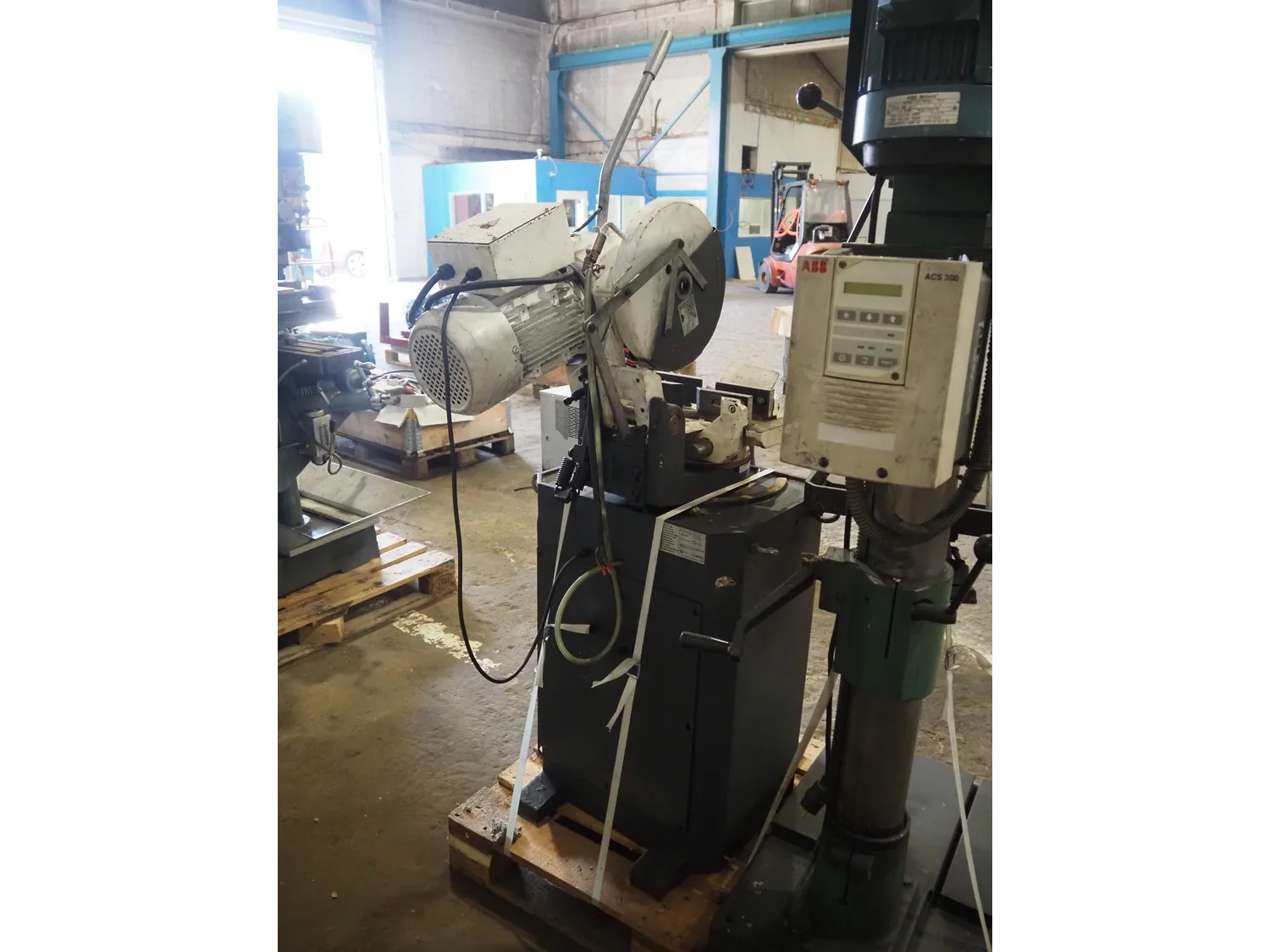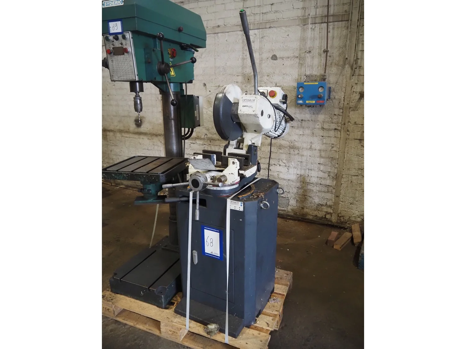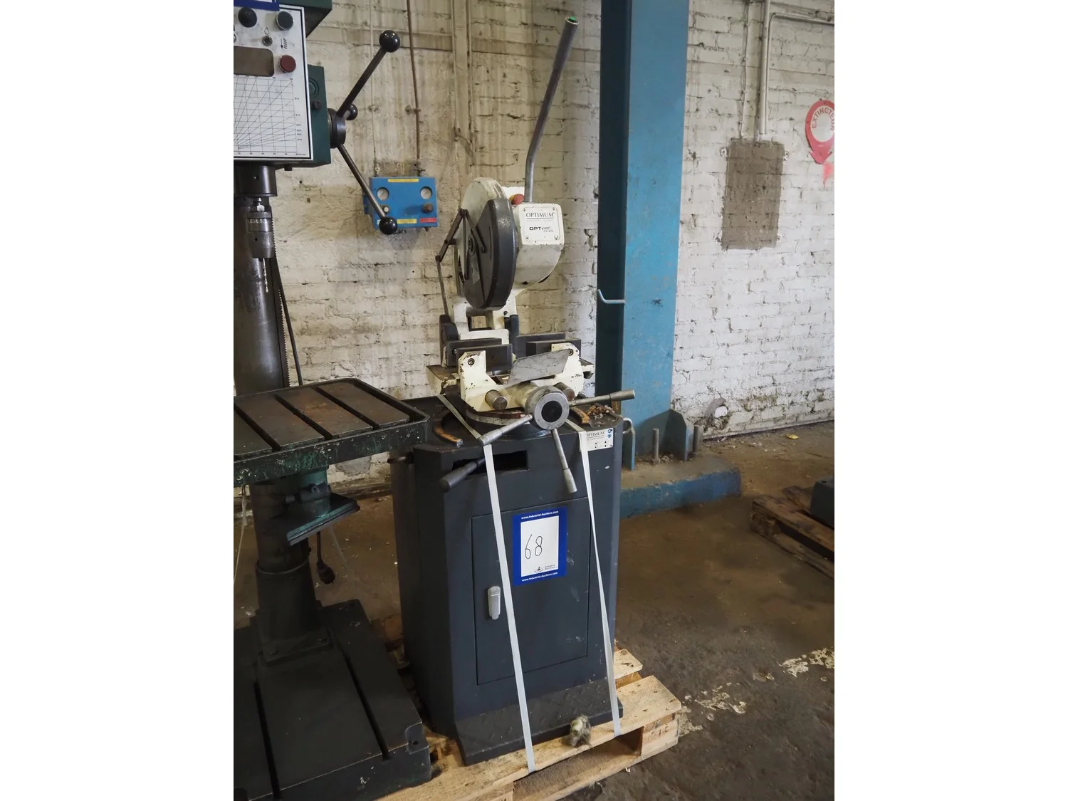 Optimum Maschinen metal saw, number: 330 2300, serial number: 221018 09049, year of construction: 2018, 400 V, 50 Hz, 1.75/1.5 kW, weight: 235 Kg, ⌀ saw blade: 300 mm, total dimensions: 630 mm x 950 mm x 1750 mm.