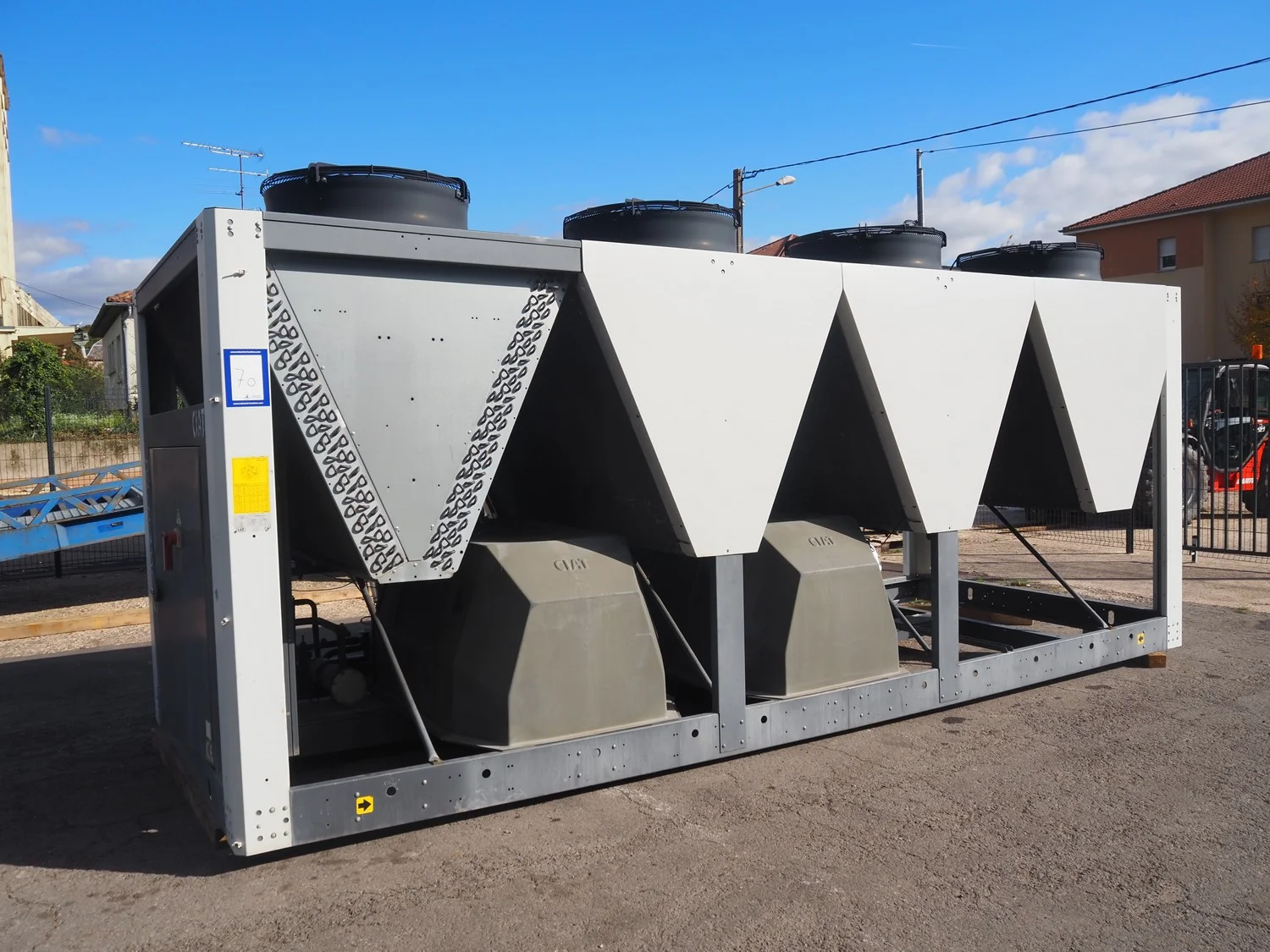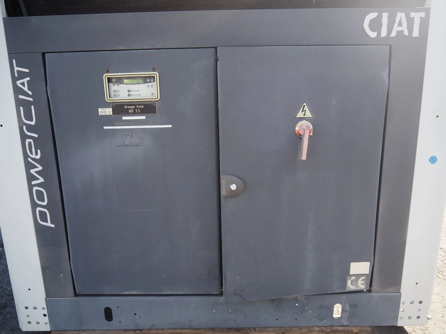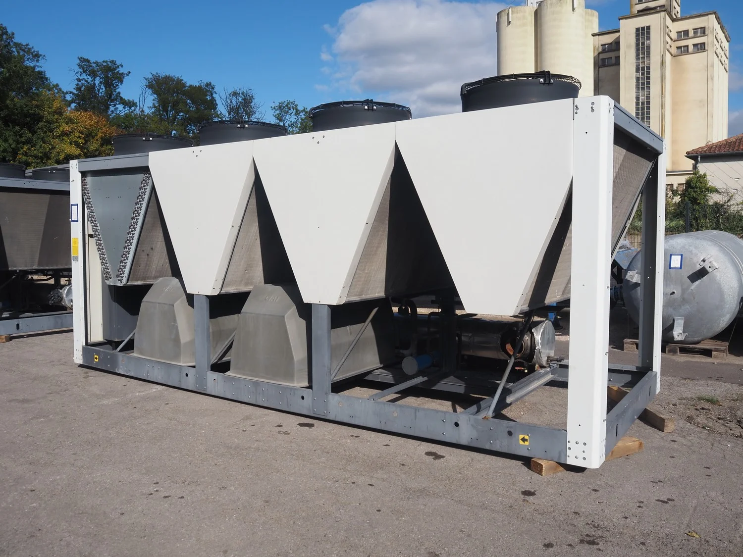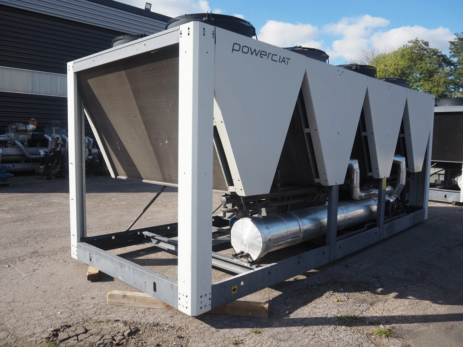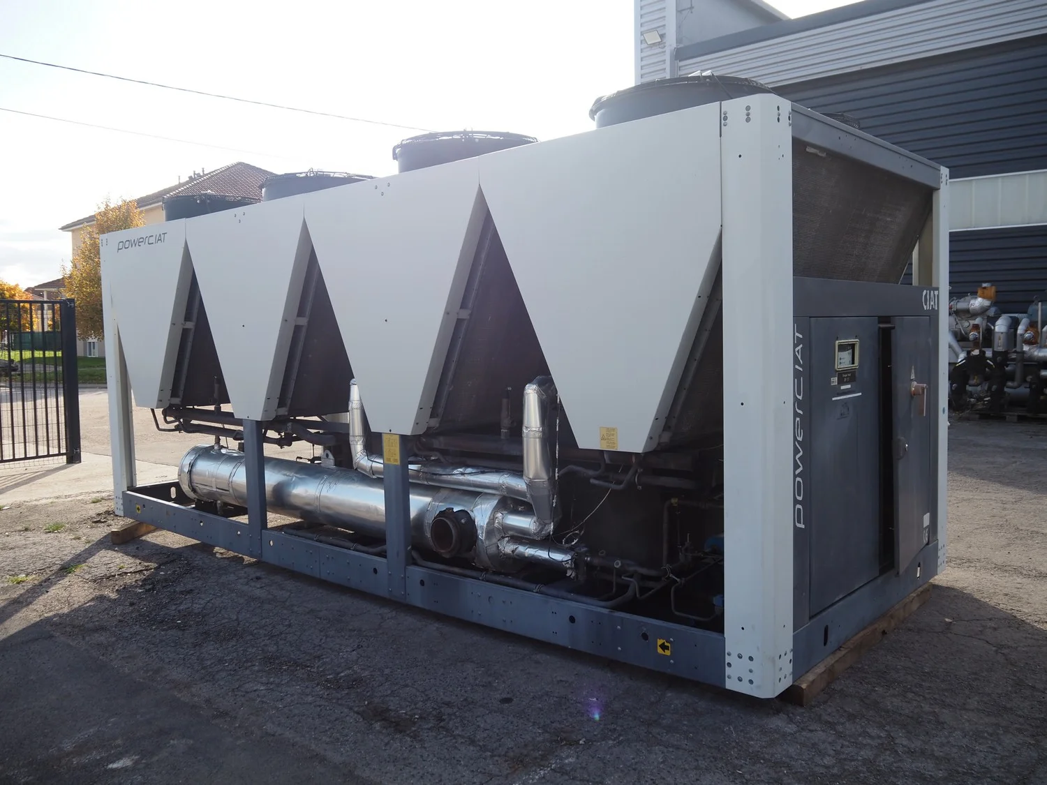 Ciat air cooled chiller, model: LX 2500Z-HPS R407C, serial number: 00555645/0002, year of construction: 2004, 400 V, 3 Ph, 50 Hz, 462 A, cooling capacity: 594 kW, heating capacity: 242.3 kW, weight: 5327 kg, refrigerant: R407C, gas inside, 60+60 kg, 4 fans, with 2 Bitzer Kühlmaschinenbau GmbH cooling compressors, type: (2x) CSH8561-125Y-40P, capacity: 359/433 m³ per hour, total dimensions: 5550 mm x 2200 mm x 2550 mm.