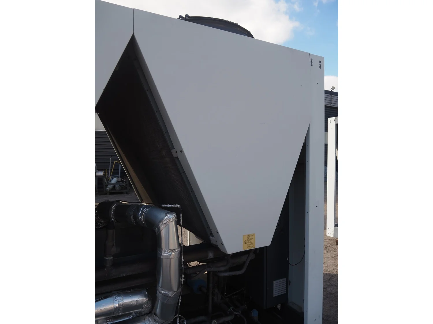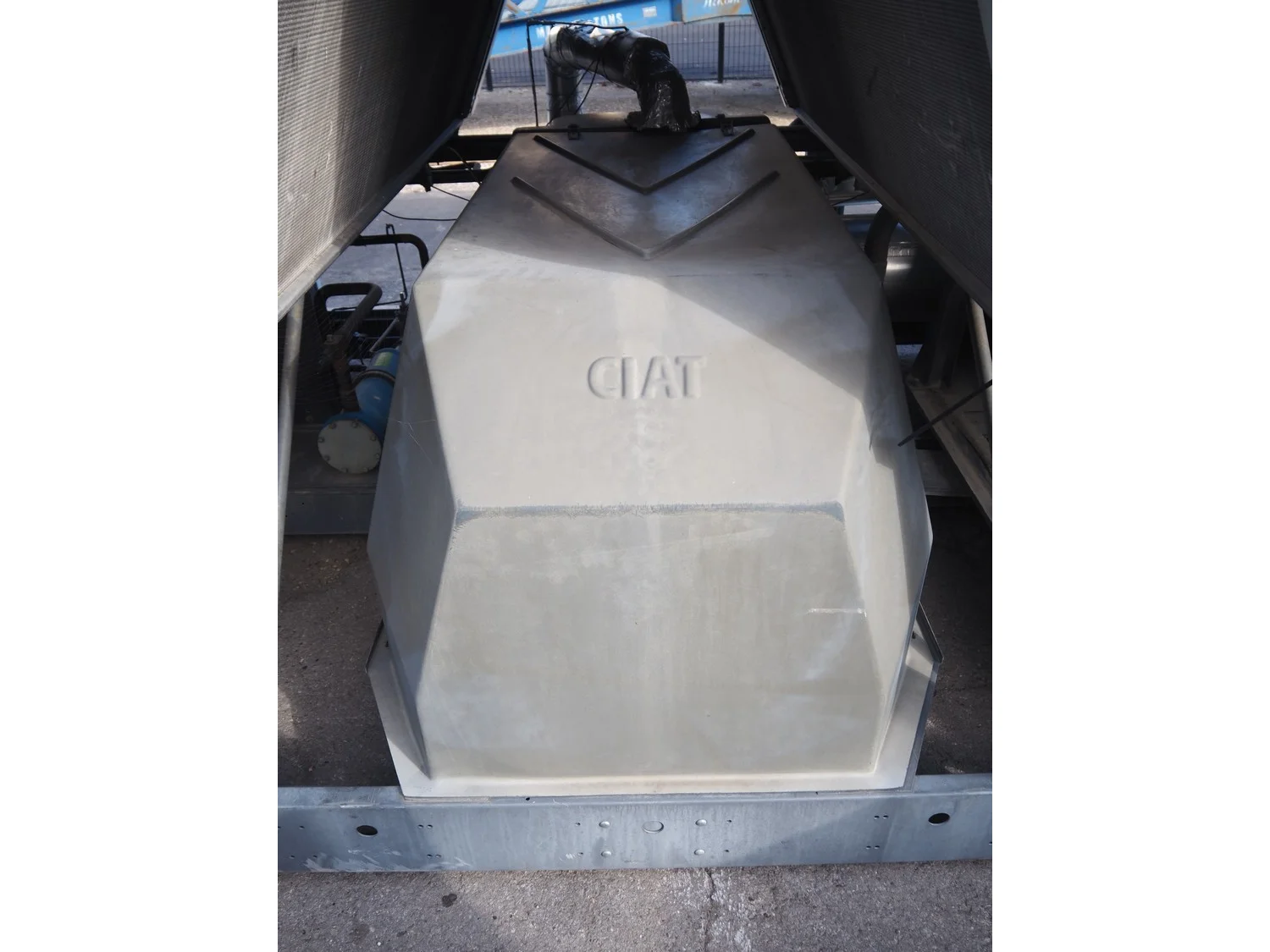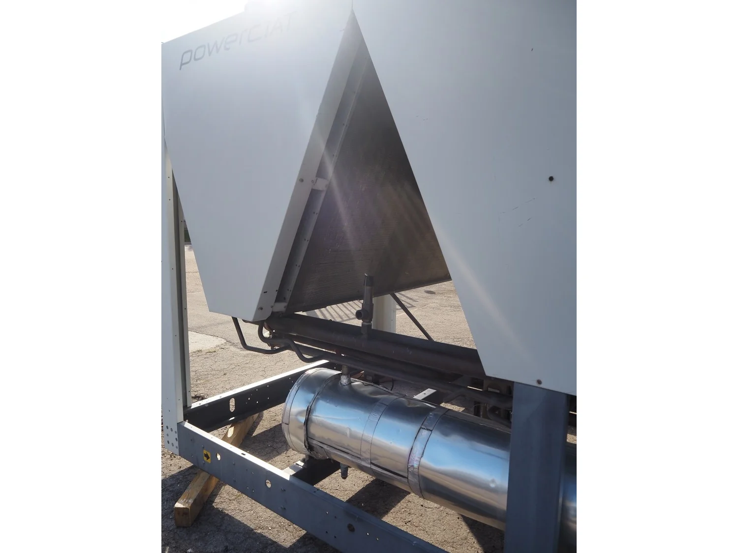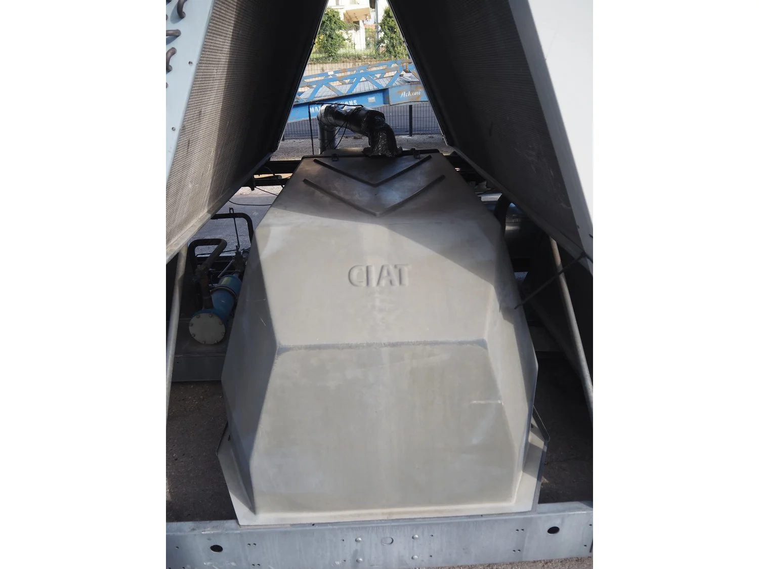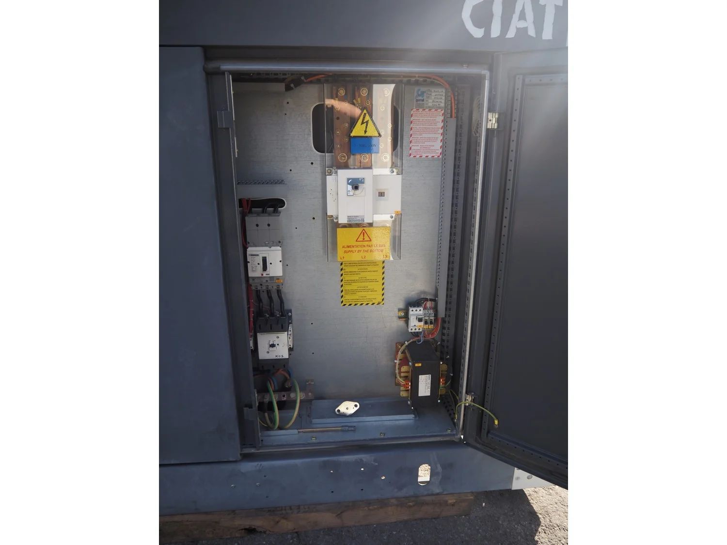 Ciat air cooled chiller, model: LX 2500Z-HPS R407C, serial number: 00555645/0002, year of construction: 2004, 400 V, 3 Ph, 50 Hz, 462 A, cooling capacity: 594 kW, heating capacity: 242.3 kW, weight: 5327 kg, refrigerant: R407C, gas inside, 60+60 kg, 4 fans, with 2 Bitzer Kühlmaschinenbau GmbH cooling compressors, type: (2x) CSH8561-125Y-40P, capacity: 359/433 m³ per hour, total dimensions: 5550 mm x 2200 mm x 2550 mm.