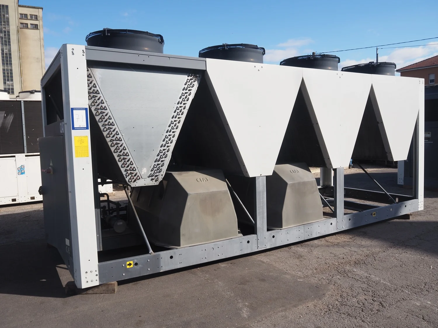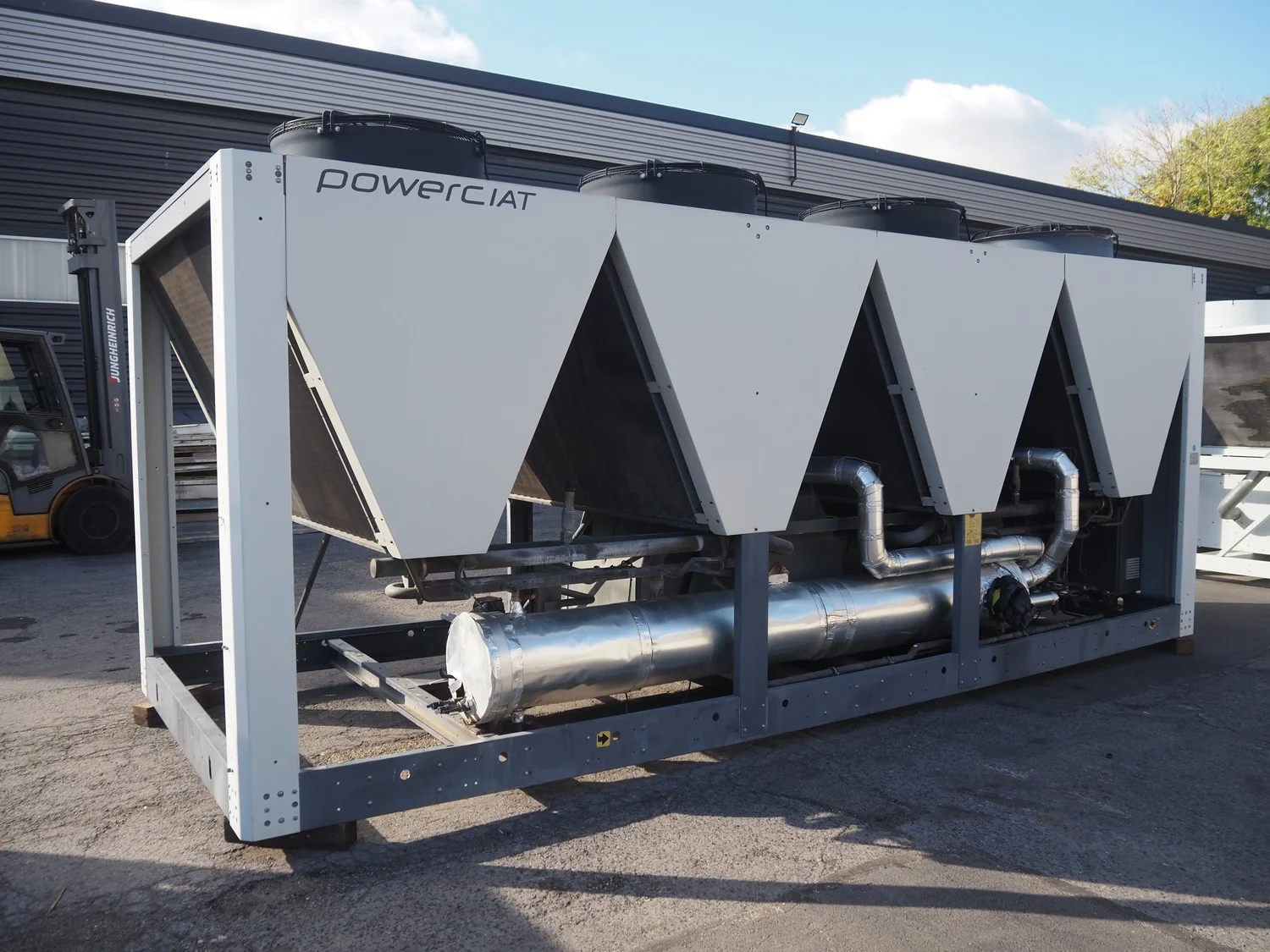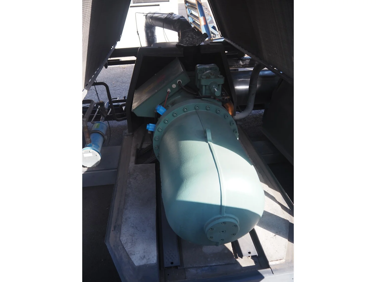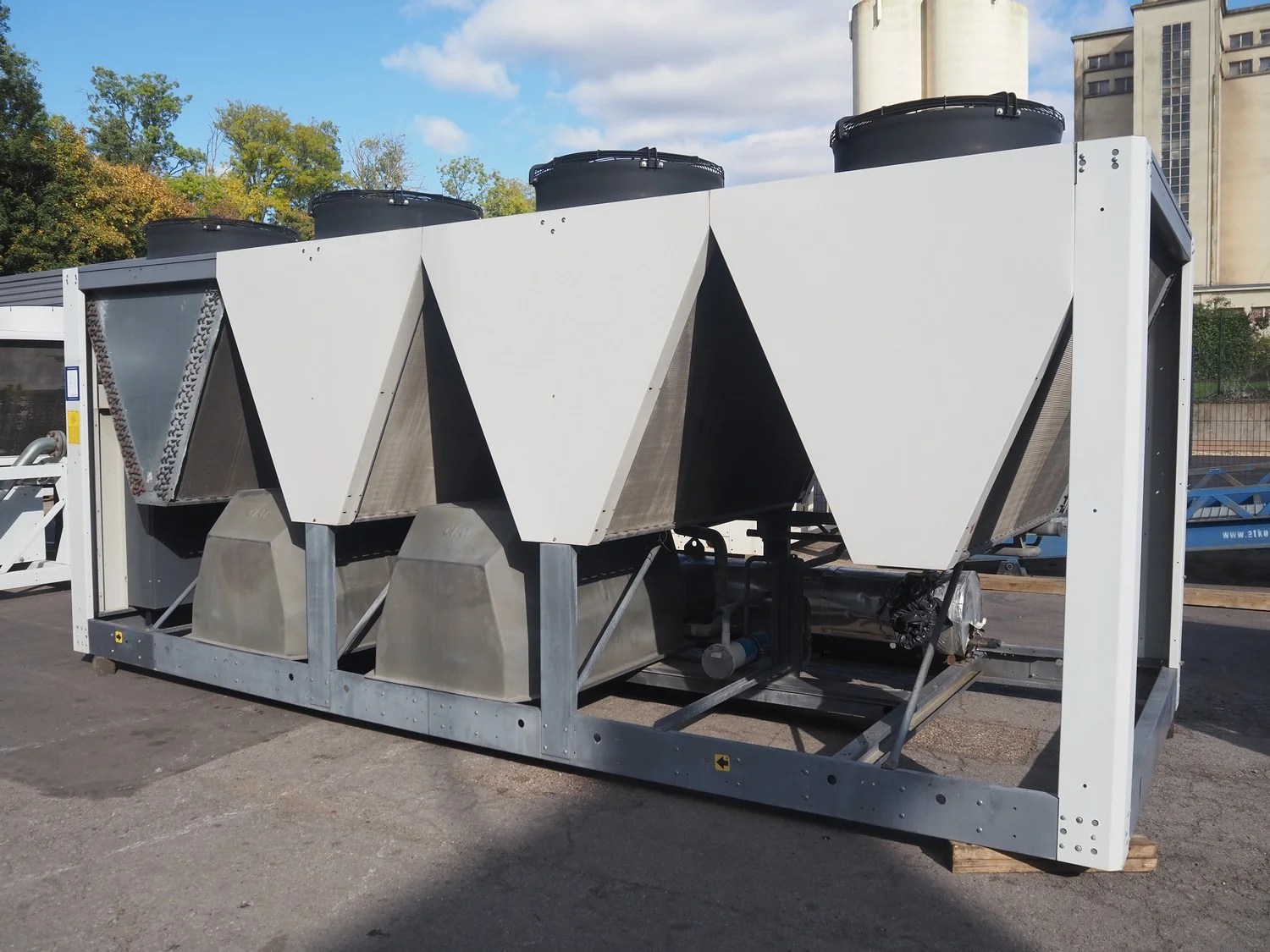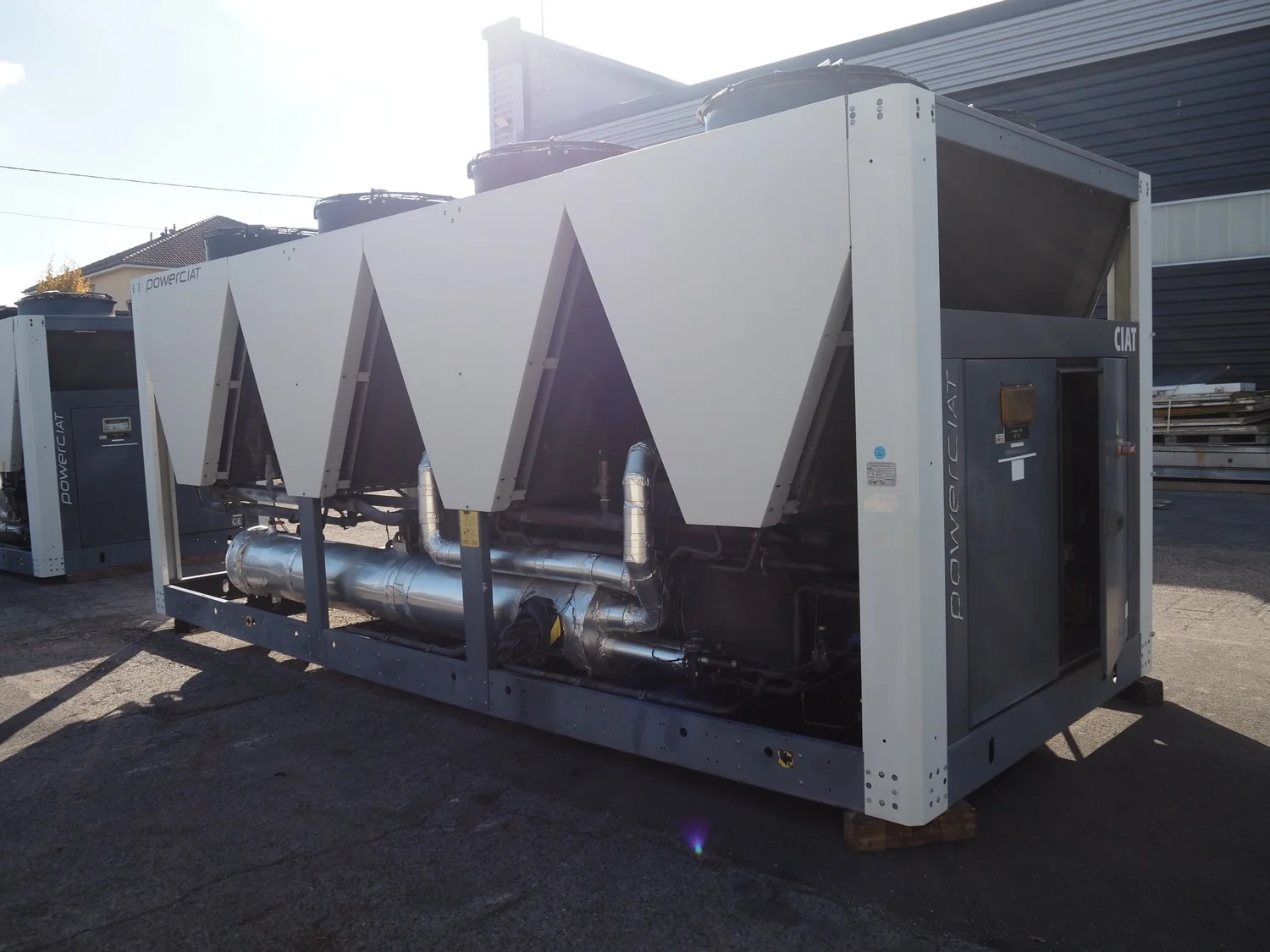 Ciat air cooled chiller, model: LX 2500Z-HPS, cooling capacity: 594 kW, refrigerant: R407C, gas inside, 4 fans, with 2 Bitzer Kühlmaschinenbau GmbH cooling compressors, type: CSH8561-125Y-40P, capacity: 359/433 m³ per hour, total dimensions: 5550 mm x 2200 mm x 2550 mm.