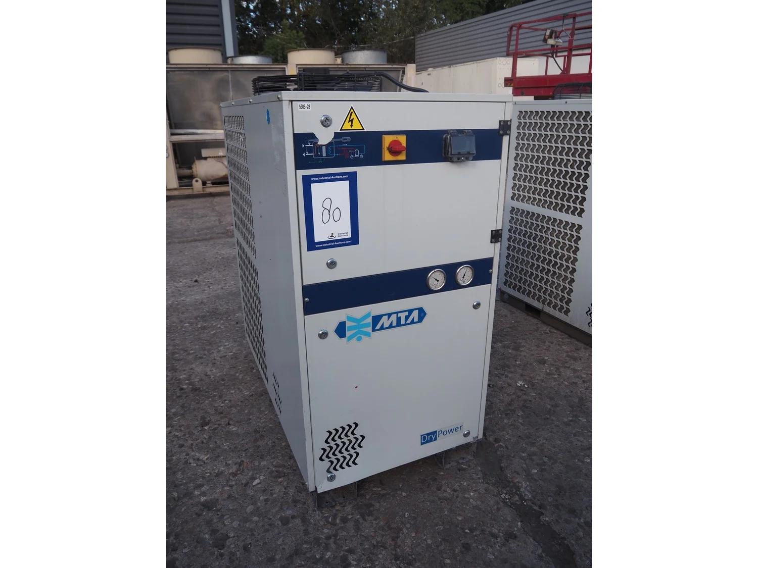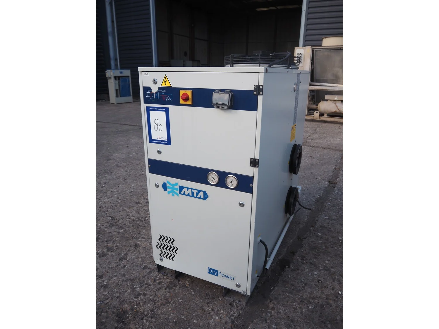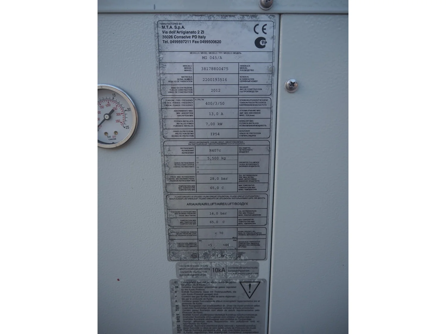 M.T.A. S.p.A. air dryer, model: MG 045/A, serial number: 2200193516, year of construction: 2012, 400 V, 3 Ph, 50 Hz, 13 A, 7 kW, weight: 318 kg, refrigerant: R407A, 5.5 kg, 1 fan, dimensions: 2250 mm x 660 mm x 1400 mm.