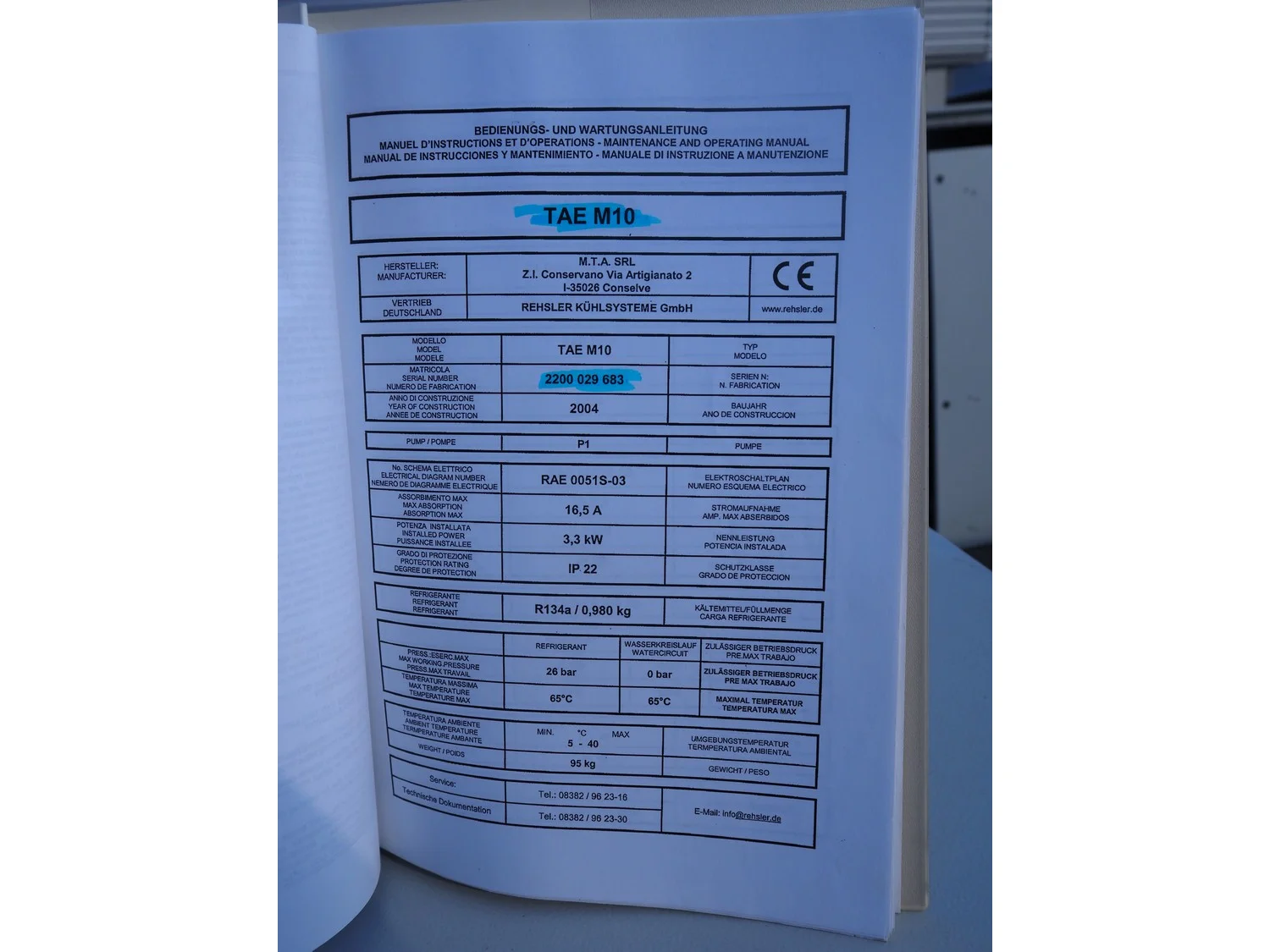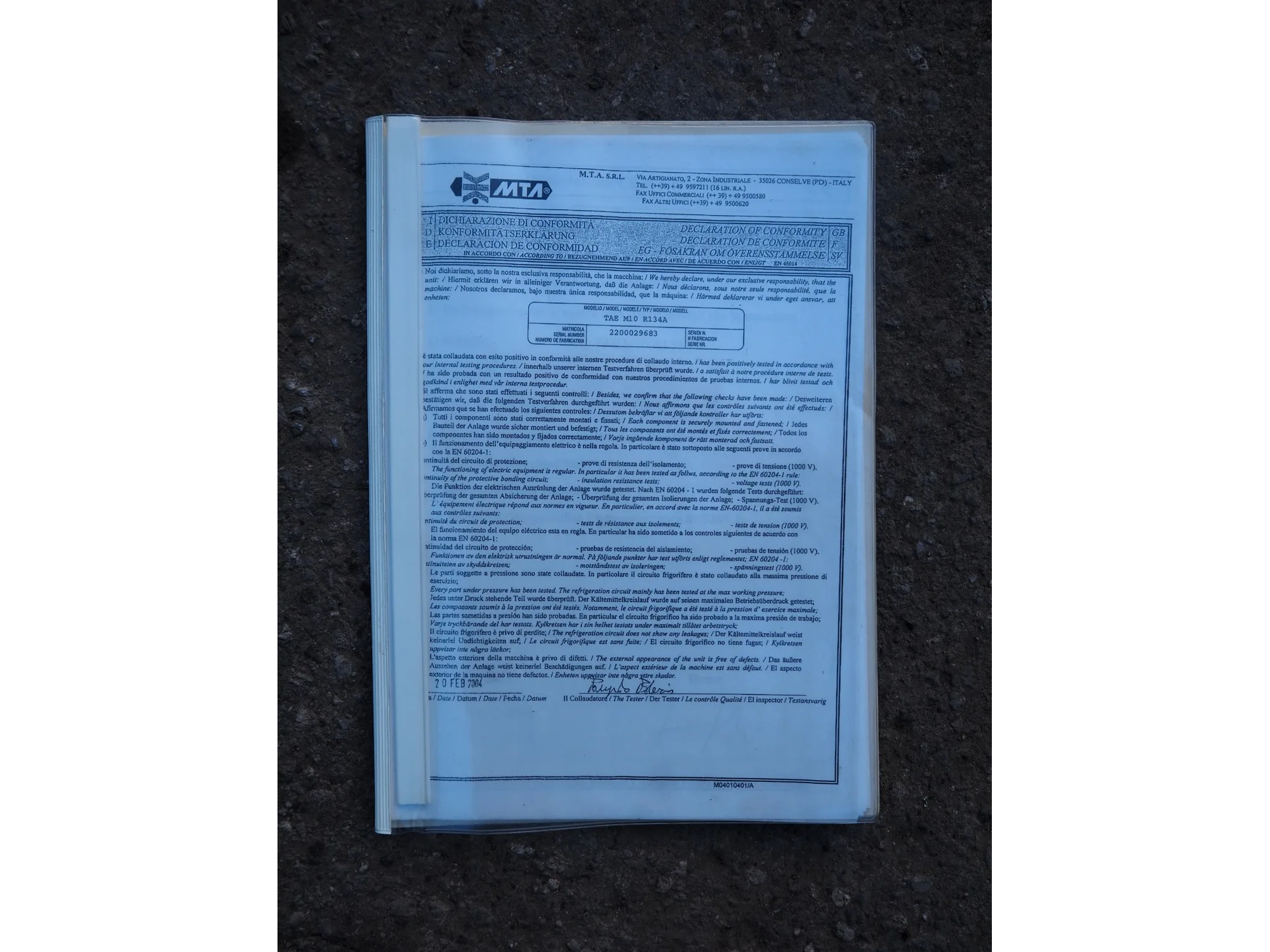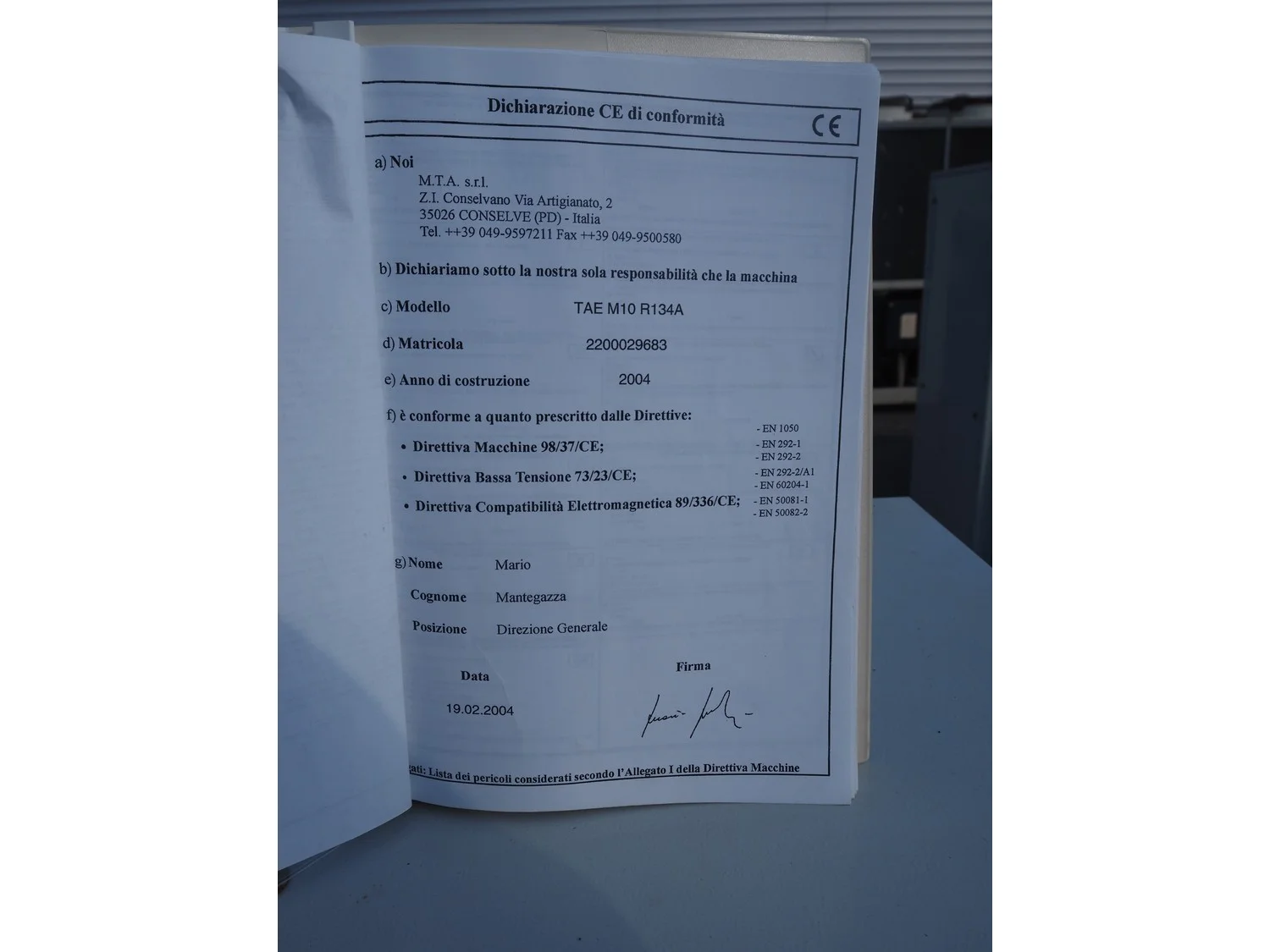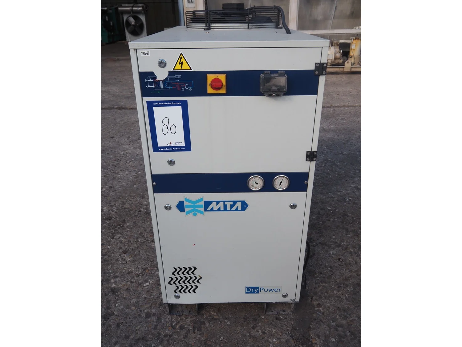M.T.A. S.p.A. air dryer, model: MG 045/A, serial number: 2200193516, year of construction: 2012, 400 V, 3 Ph, 50 Hz, 13 A, 7 kW, weight: 318 kg, refrigerant: R407A, 5.5 kg, 1 fan, dimensions: 2250 mm x 660 mm x 1400 mm.