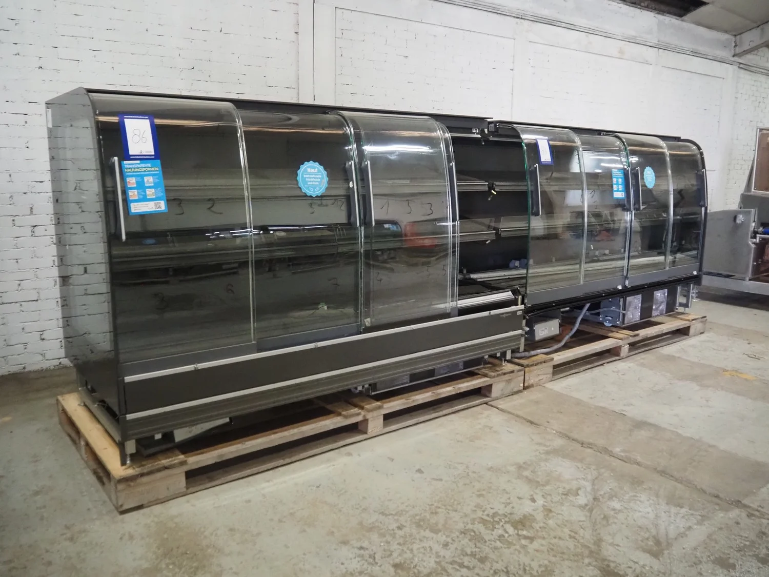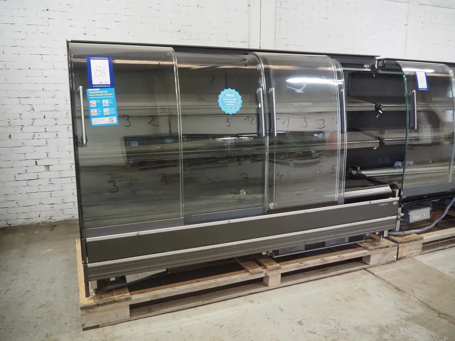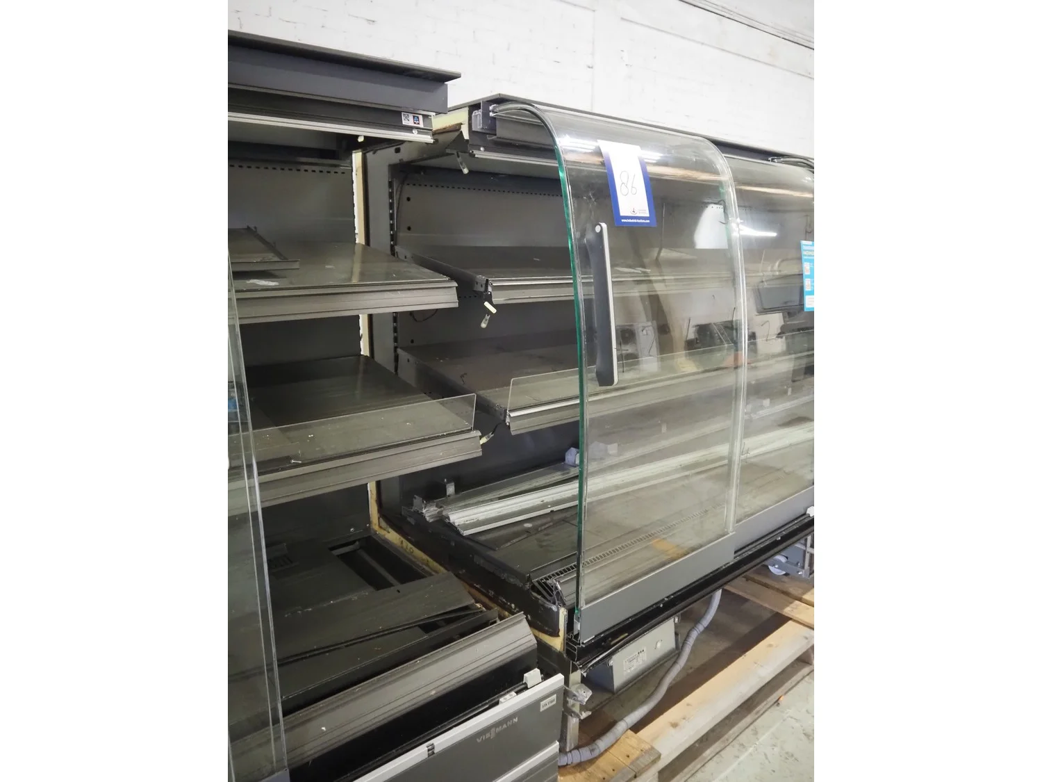 2 Viessmann refrigerated showcases, number: 7694737, serial number: 01924233, year of construction: 2018, 230 V, 50 Hz, 3 floors, dimensions each floor: 2500 mm x 450 mm, total dimensions: (2x) 2530 mm x 1100 mm x 1630 mm. Technical condition unknown.