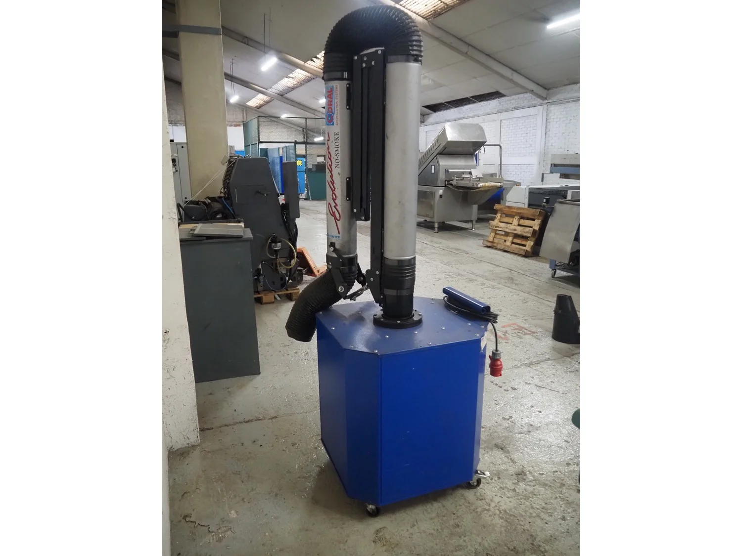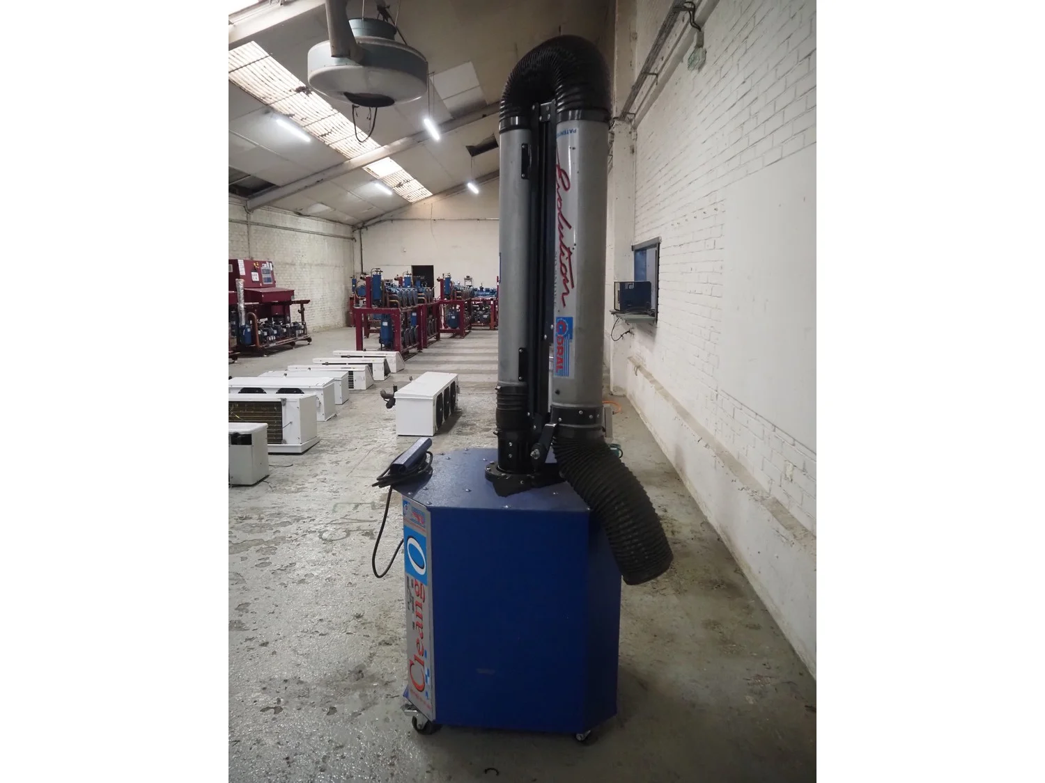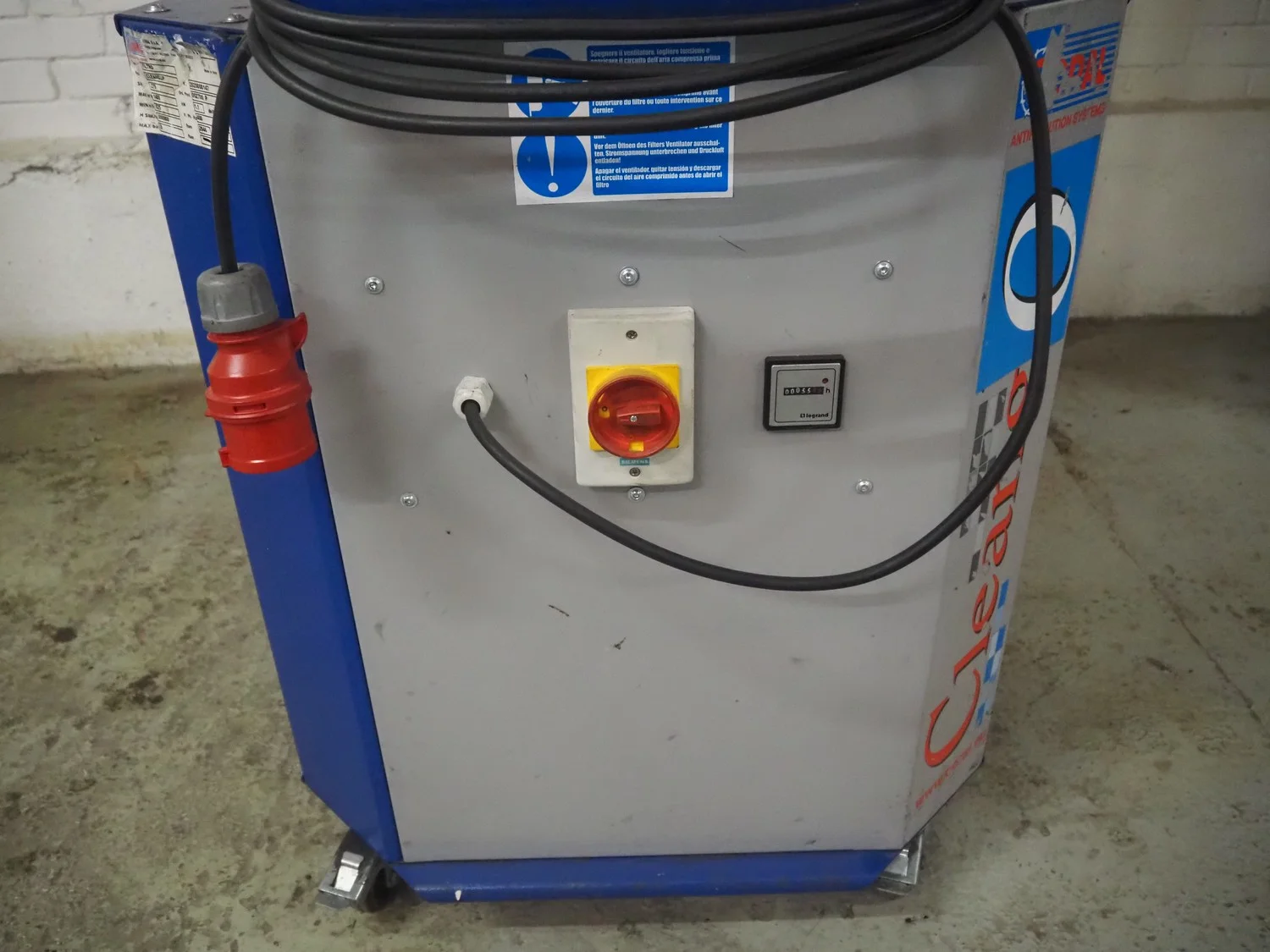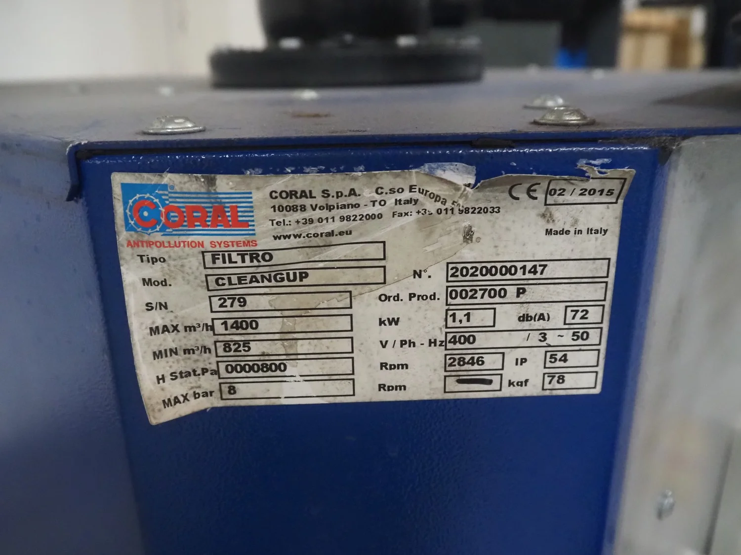 Coral S.p.A. mobile suction and filtration system, type: FILTRO, model: CLEANGUP, serial number: 279, number: 2020000147, 400 V, 3 Ph, 50 Hz, 72 A, 1.1 kW, minimum: 825 m ³ per hour , maximum: 1400 m ³ per hour , dimensions: 780 mm x 700 mm x 2200 mm.