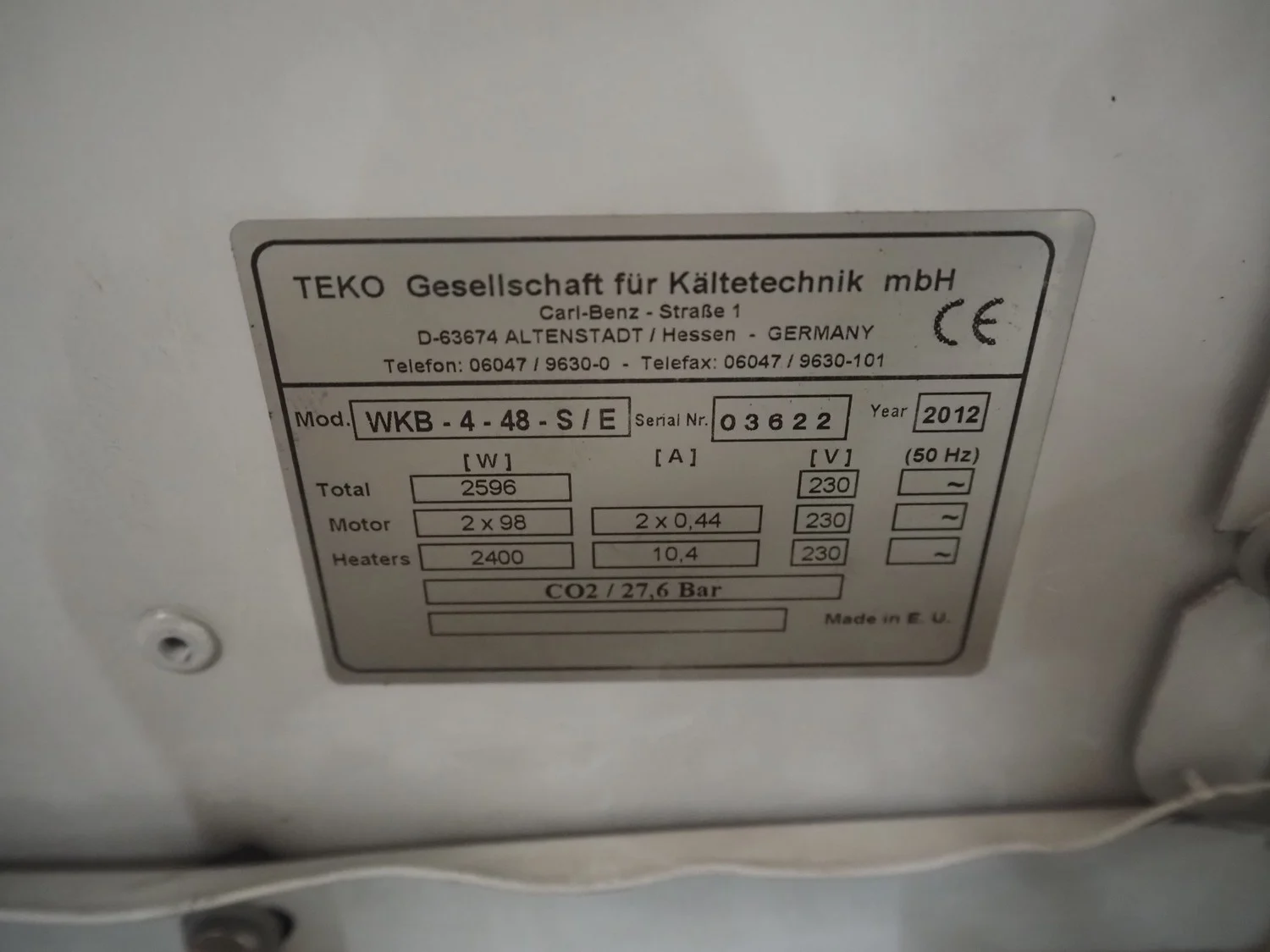 Teko evaporator, model: WKB-4-48-S/E, serial number: 03622, year of construction: 2012, 230 V, 10.4 A, 2400 W, 2 fans, dimensions: 1180 mm x 750 mm x 500 mm.