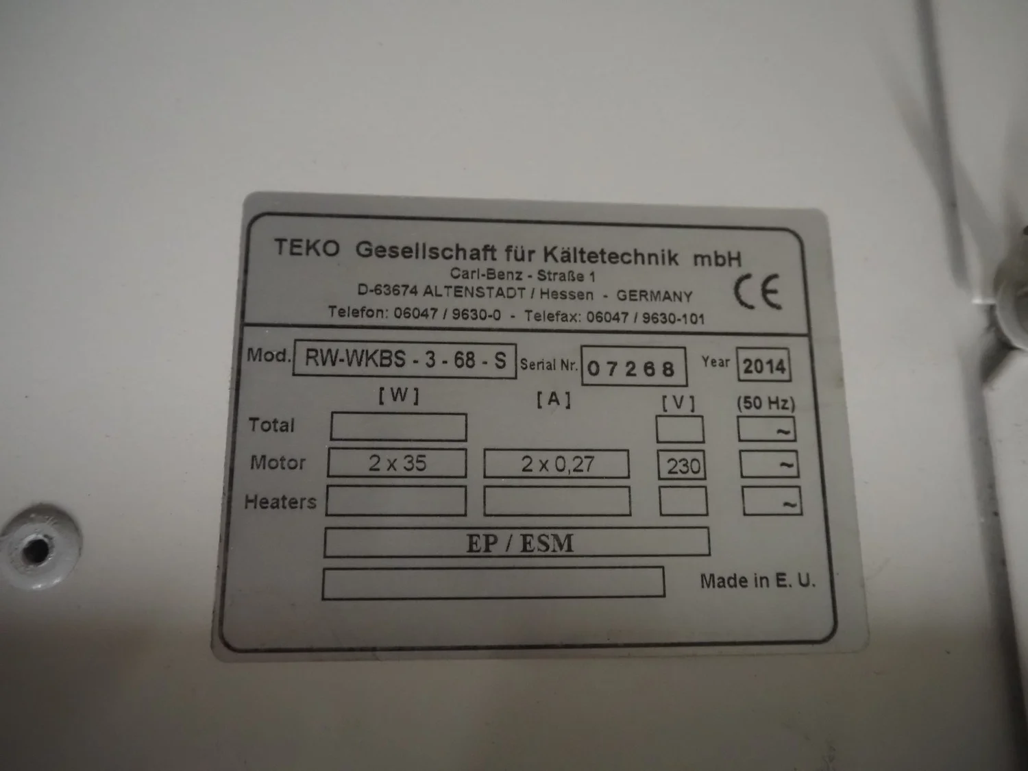 Teko evaporator, model: RW-WKBS- 3-68-S, serial number: 07268, year of construction: 2014, 230 V, 2x0.27 A, 2x35 W, 2 fans, dimensions: 1180 mm x 600 mm x 480 mm.