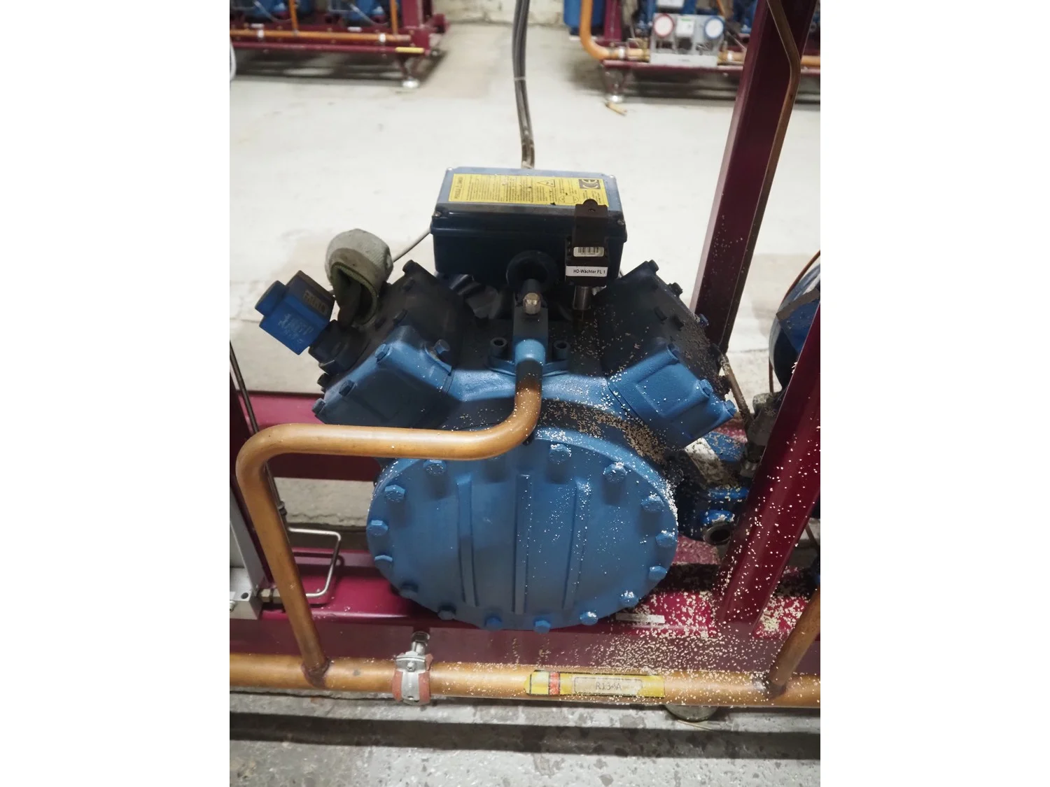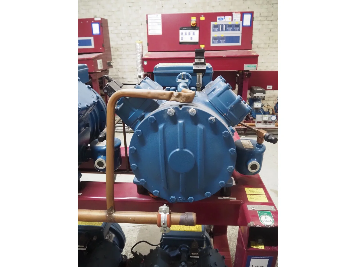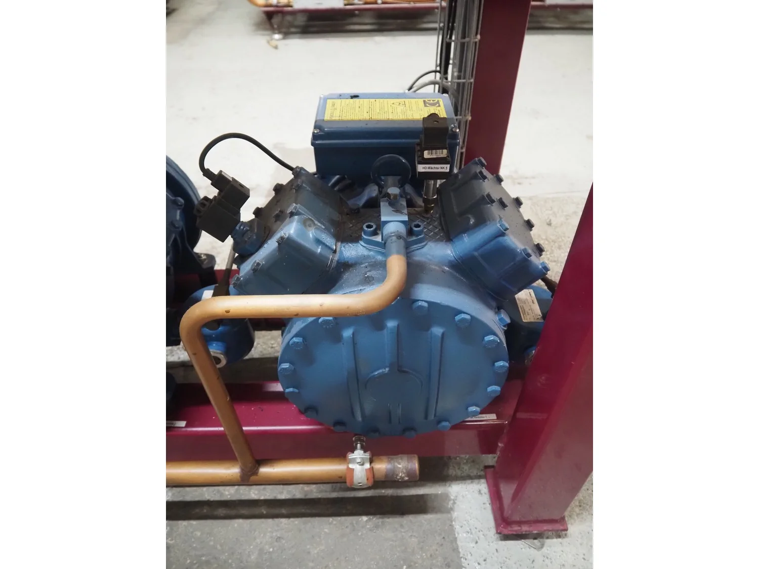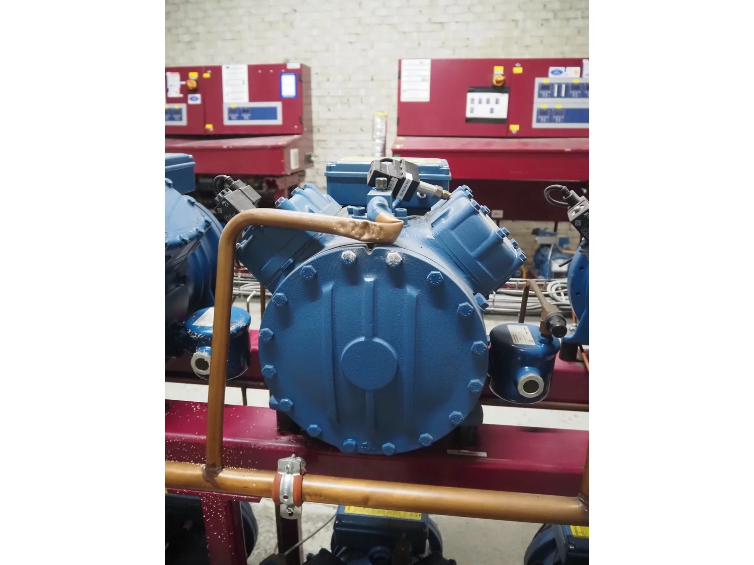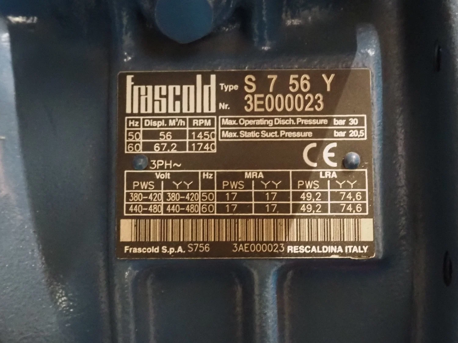Teko compressor rack with 7 Frascold cooling compressors, type: (4x) S 7 56 Y, capacity: 56/67.2 m³ per hour, (2x) S 7 51 Y, capacity: 50.43/61.51 m³ per hour, (1x) S5-33Y, capacity: 32.8/39.36 m³ per hour, dimensions: 2180 mm x 820 mm x 1720 mm.