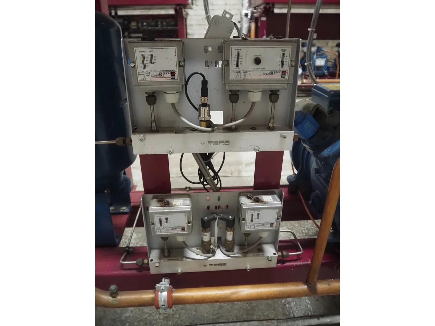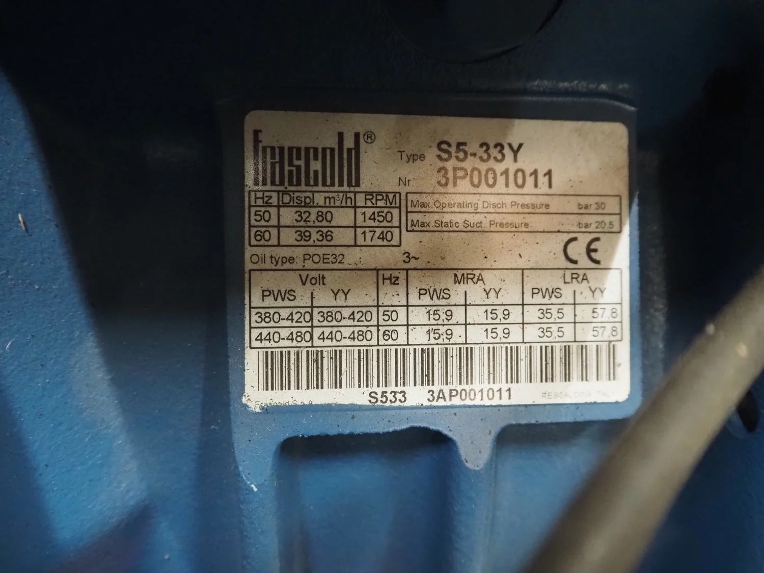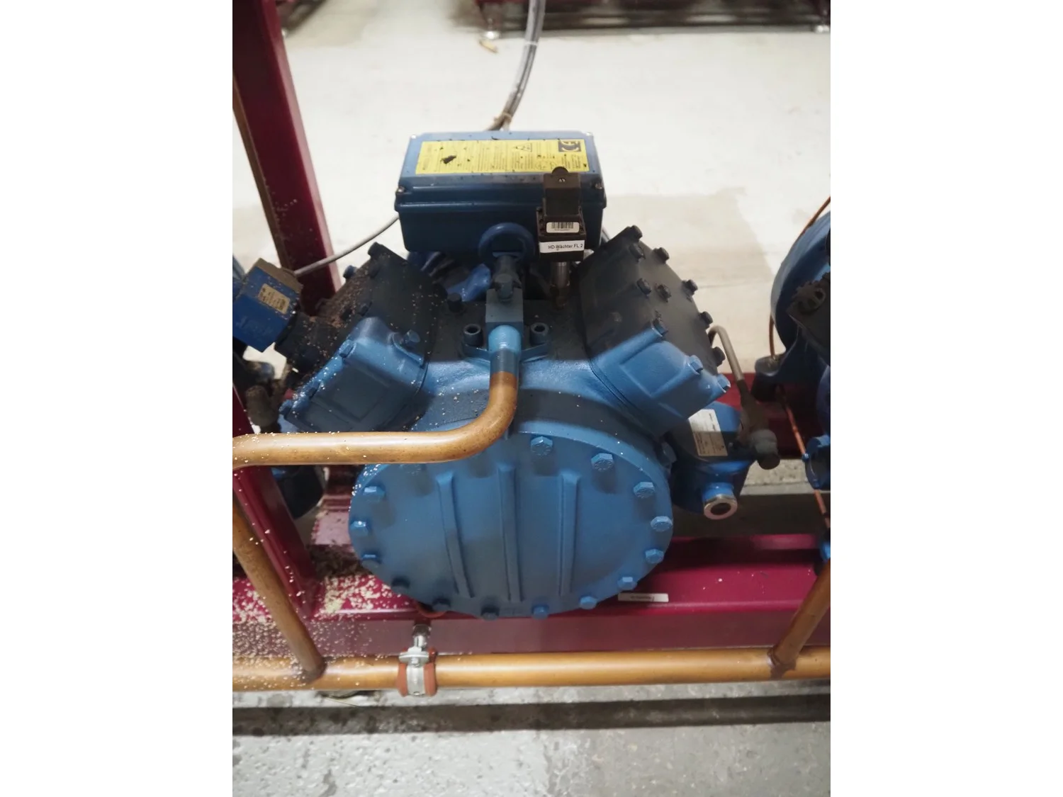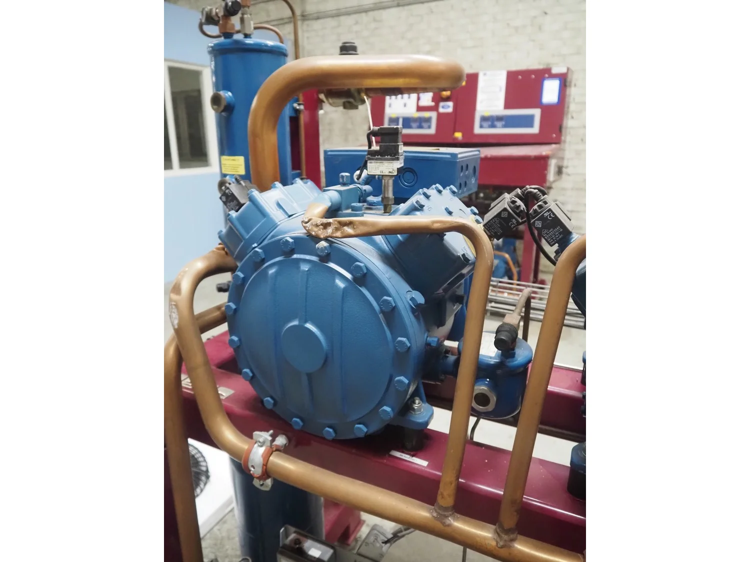 Teko compressor rack with 7 Frascold cooling compressors, type: (4x) S 7 56 Y, capacity: 56/67.2 m³ per hour, (2x) S 7 51 Y, capacity: 50.43/61.51 m³ per hour, (1x) S5-33Y, capacity: 32.8/39.36 m³ per hour, dimensions: 2180 mm x 820 mm x 1720 mm.