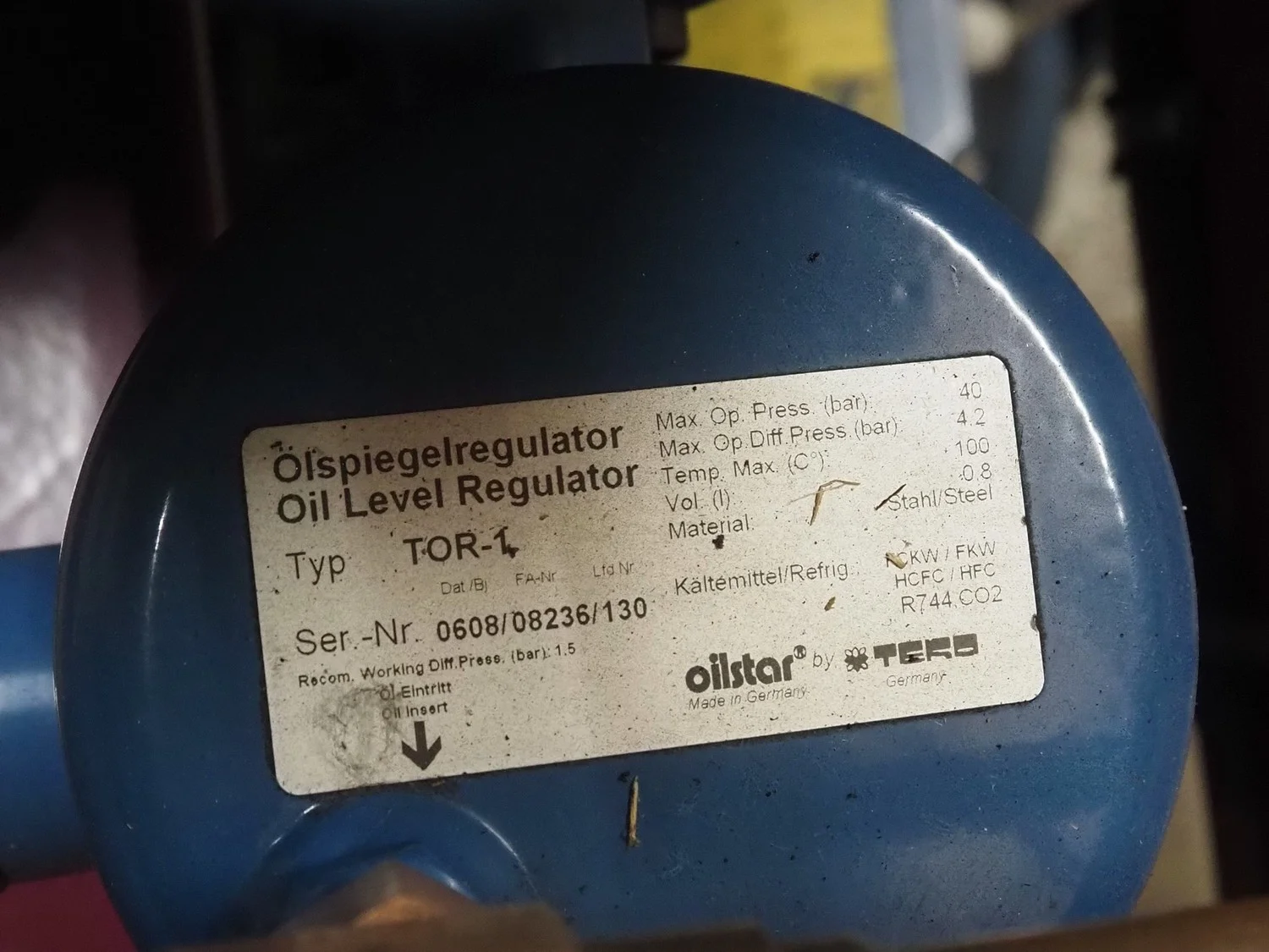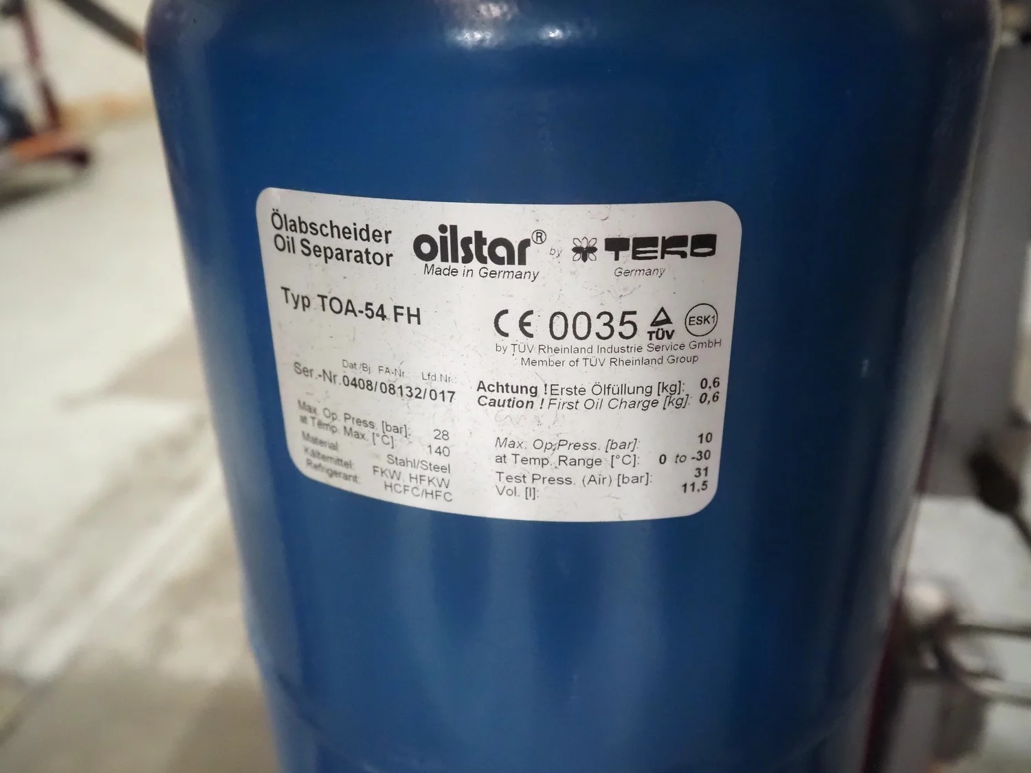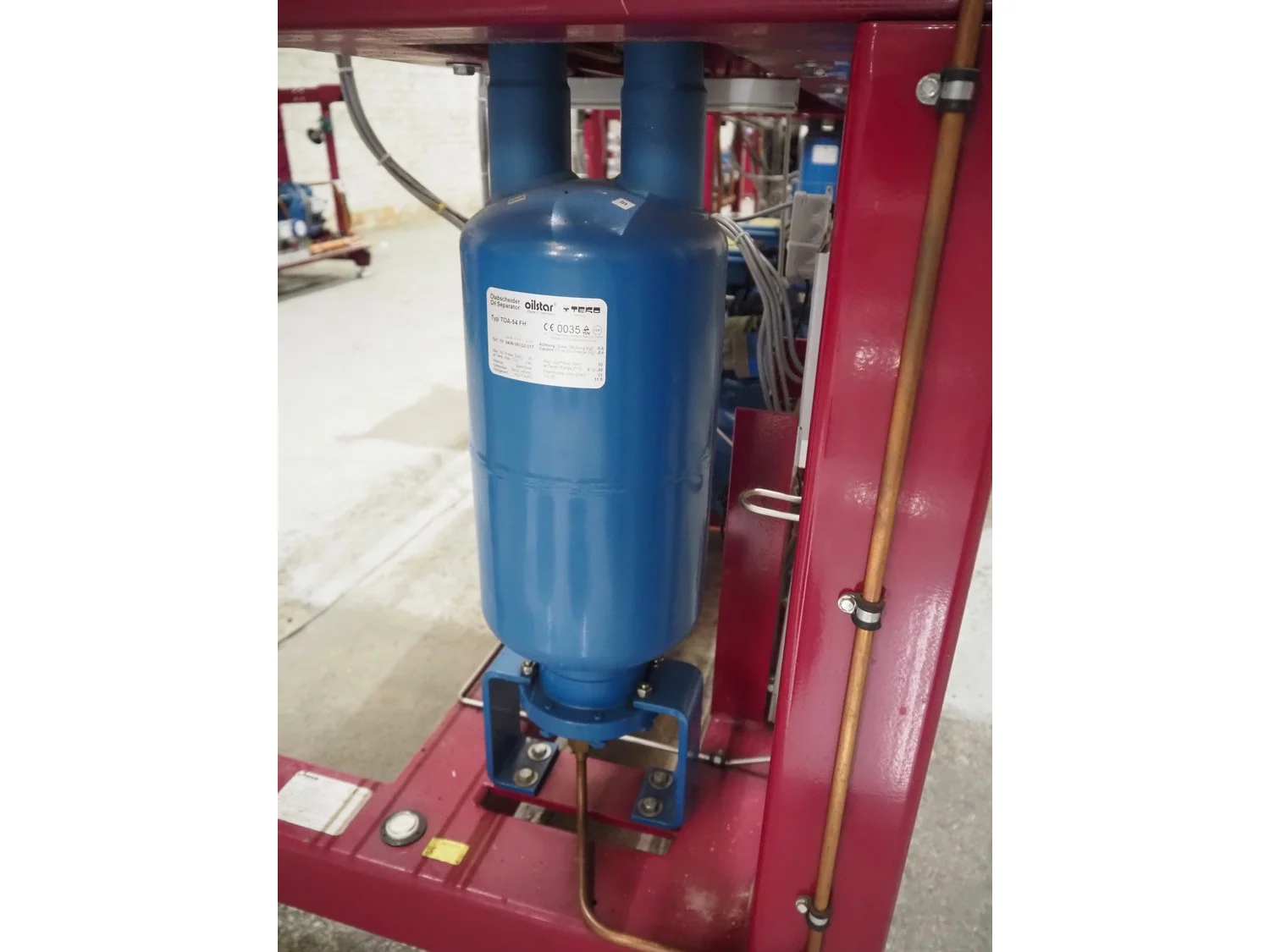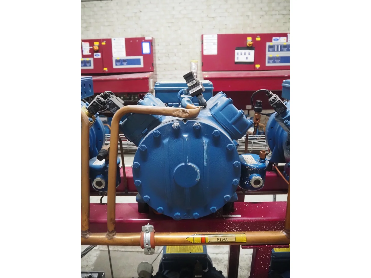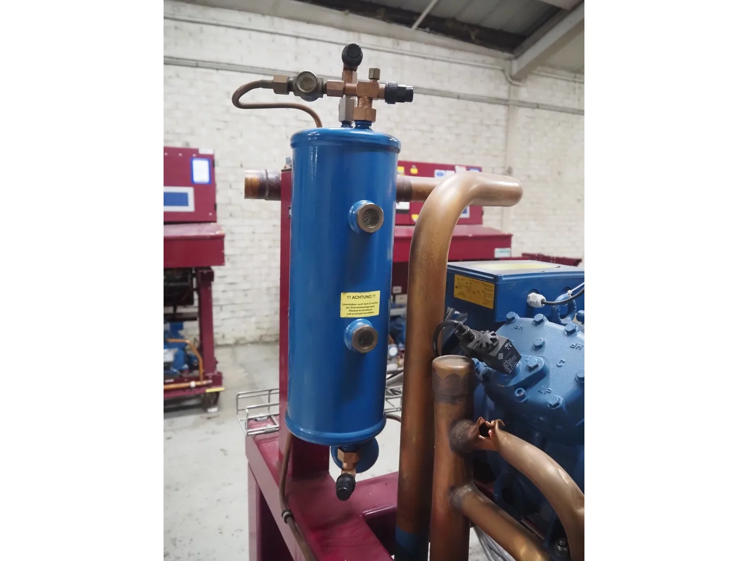 Teko compressor rack with 7 Frascold cooling compressors, type: (4x) S 7 56 Y, capacity: 56/67.2 m³ per hour, (2x) S 7 51 Y, capacity: 50.43/61.51 m³ per hour, (1x) S5-33Y, capacity: 32.8/39.36 m³ per hour, dimensions: 2180 mm x 820 mm x 1720 mm.