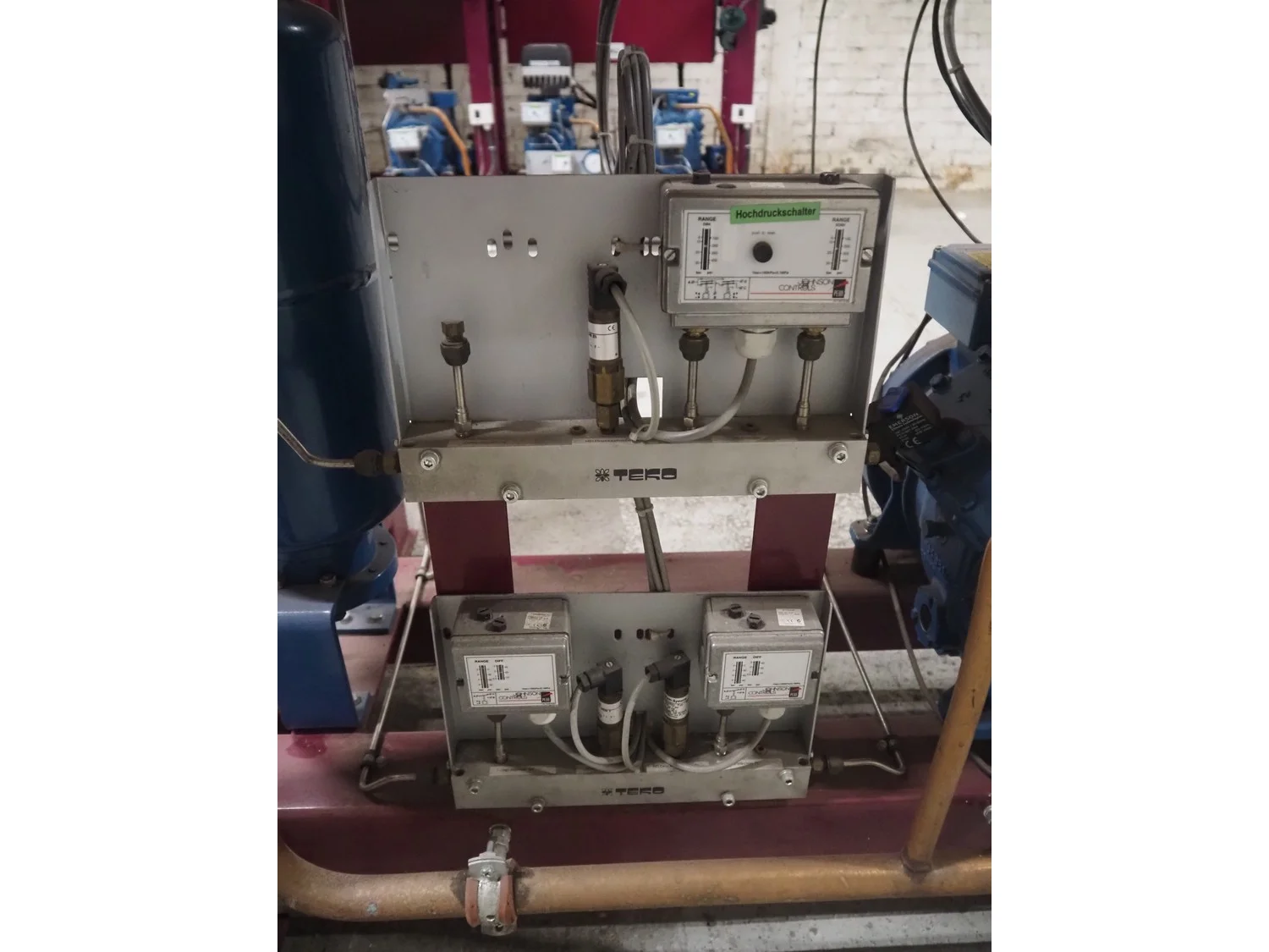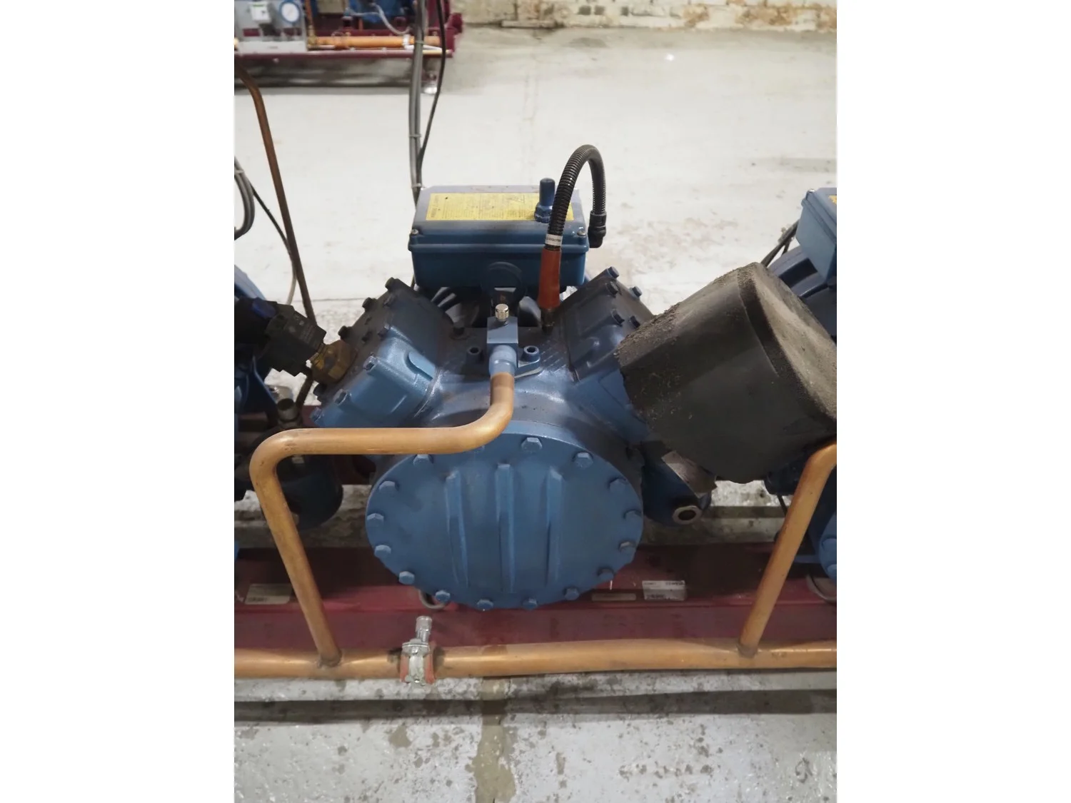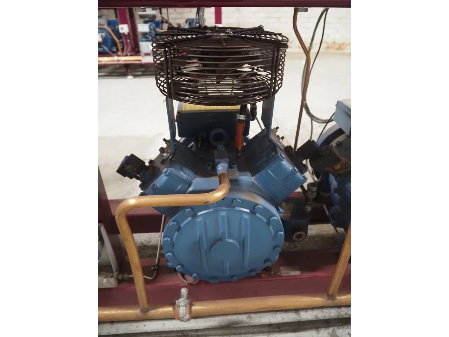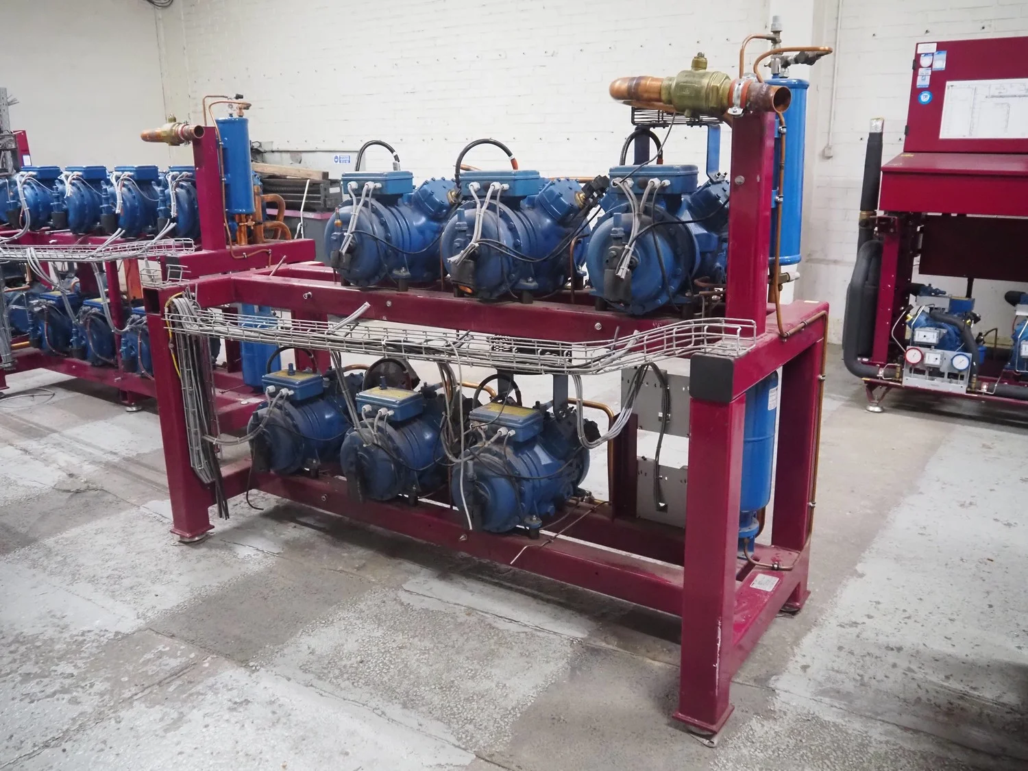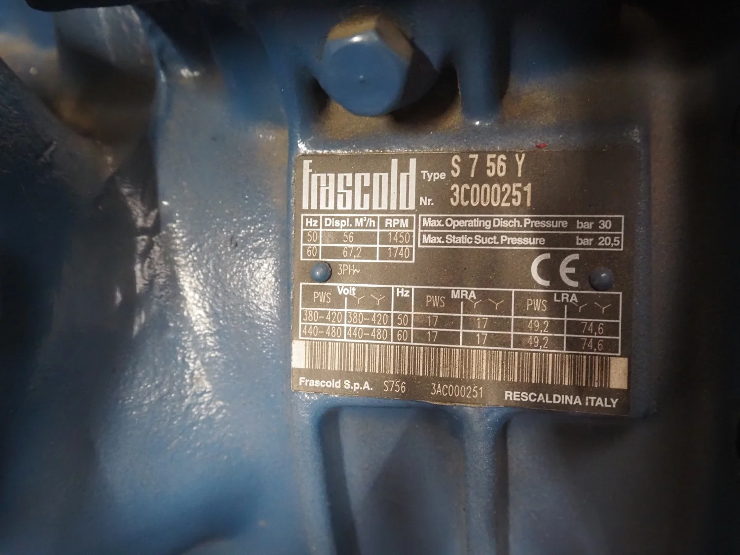 Teko compressor rack with 6 Frascold cooling compressors, type: (4x) S 7 56 Y, capacity: 56/67.2 m³ per hour, (2x) S 5 33 Y, capacity: 32.8/39.36 m³ per hour, dimensions: 2180 mm x 820 mm x 1720 mm.