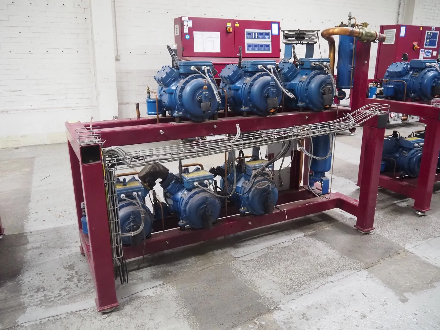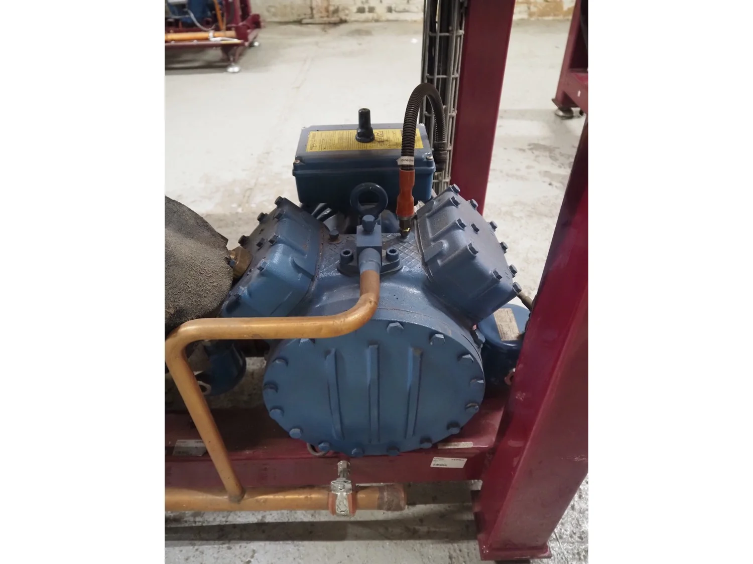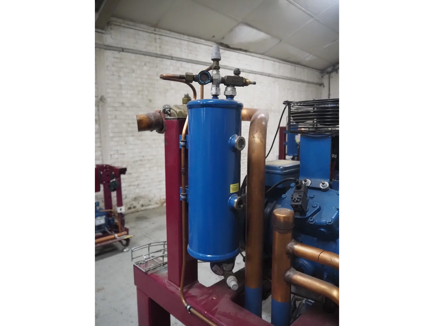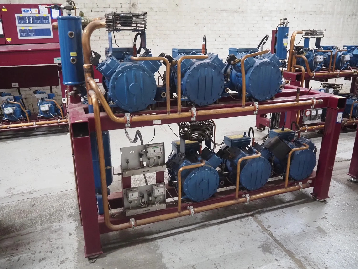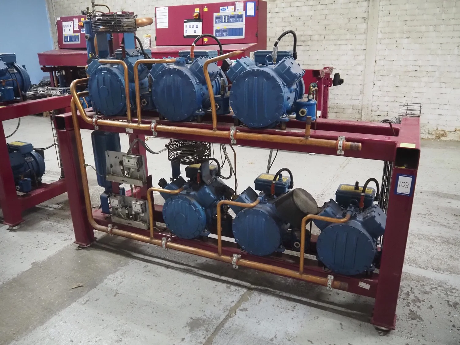 Teko compressor rack with 6 Frascold cooling compressors, type: (4x) S 7 56 Y, capacity: 56/67.2 m³ per hour, (2x) S 5 33 Y, capacity: 32.8/39.36 m³ per hour, dimensions: 2180 mm x 820 mm x 1720 mm.