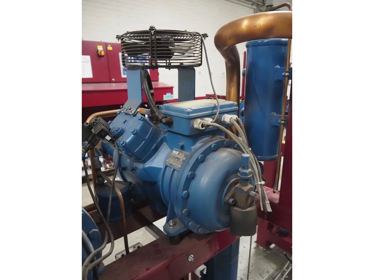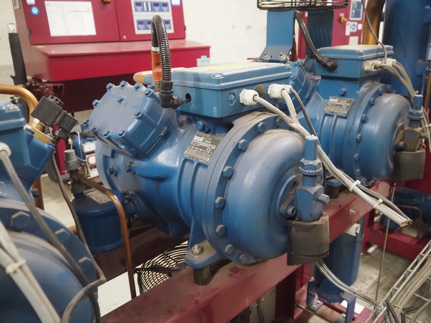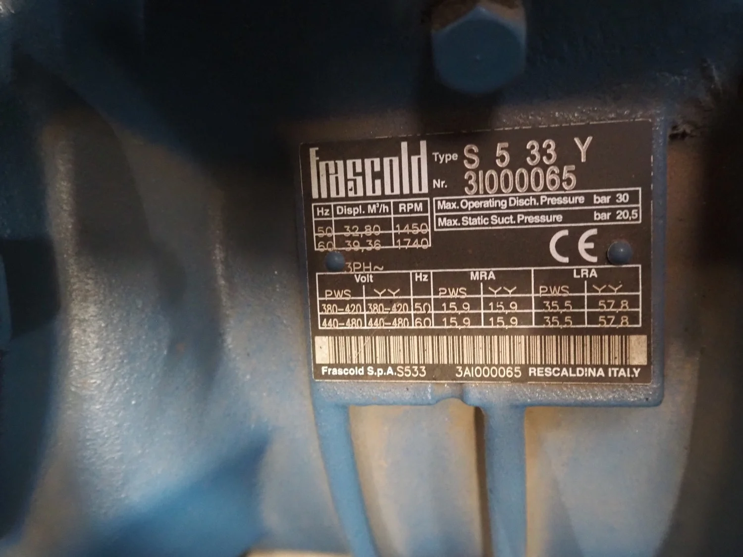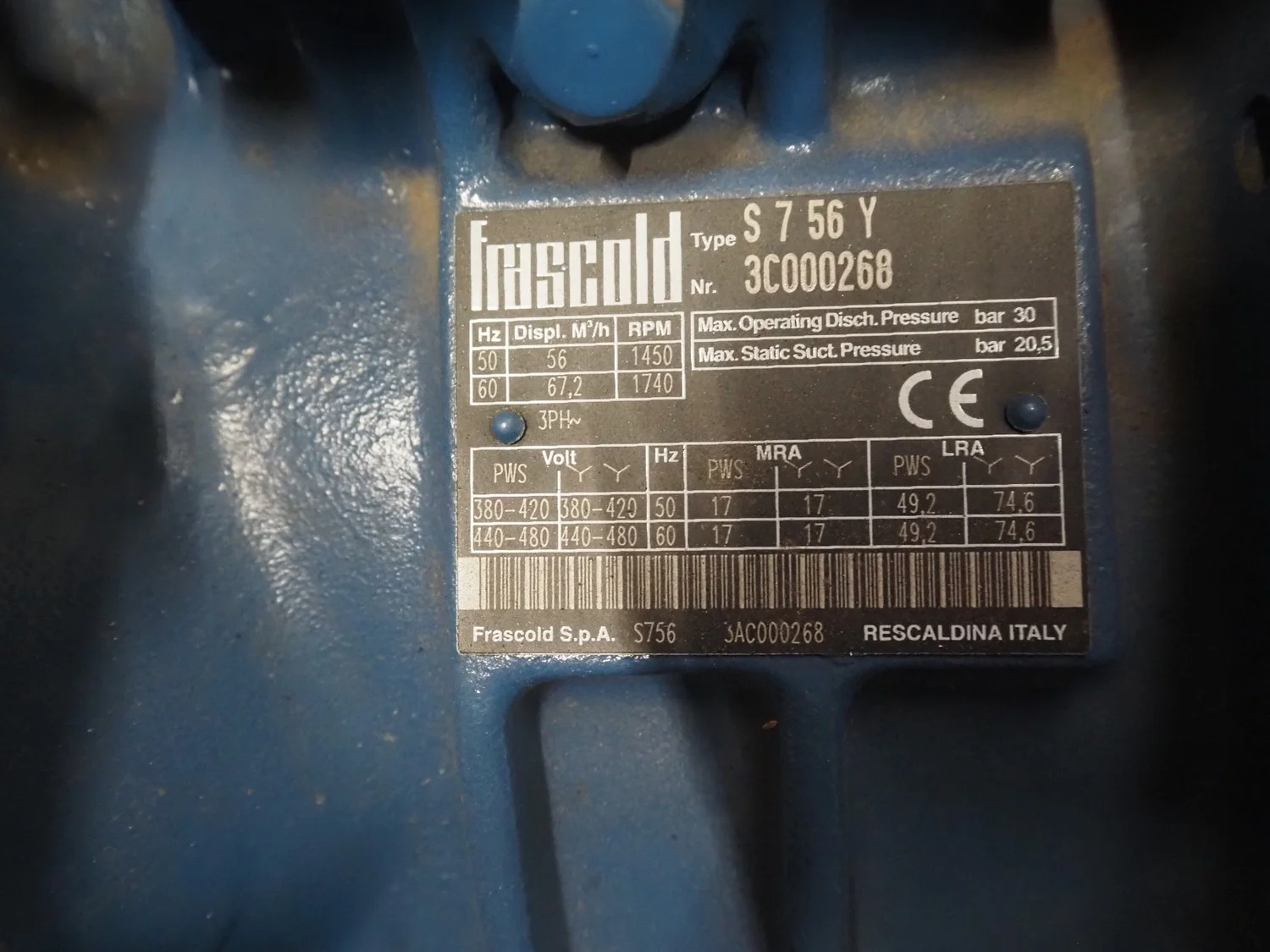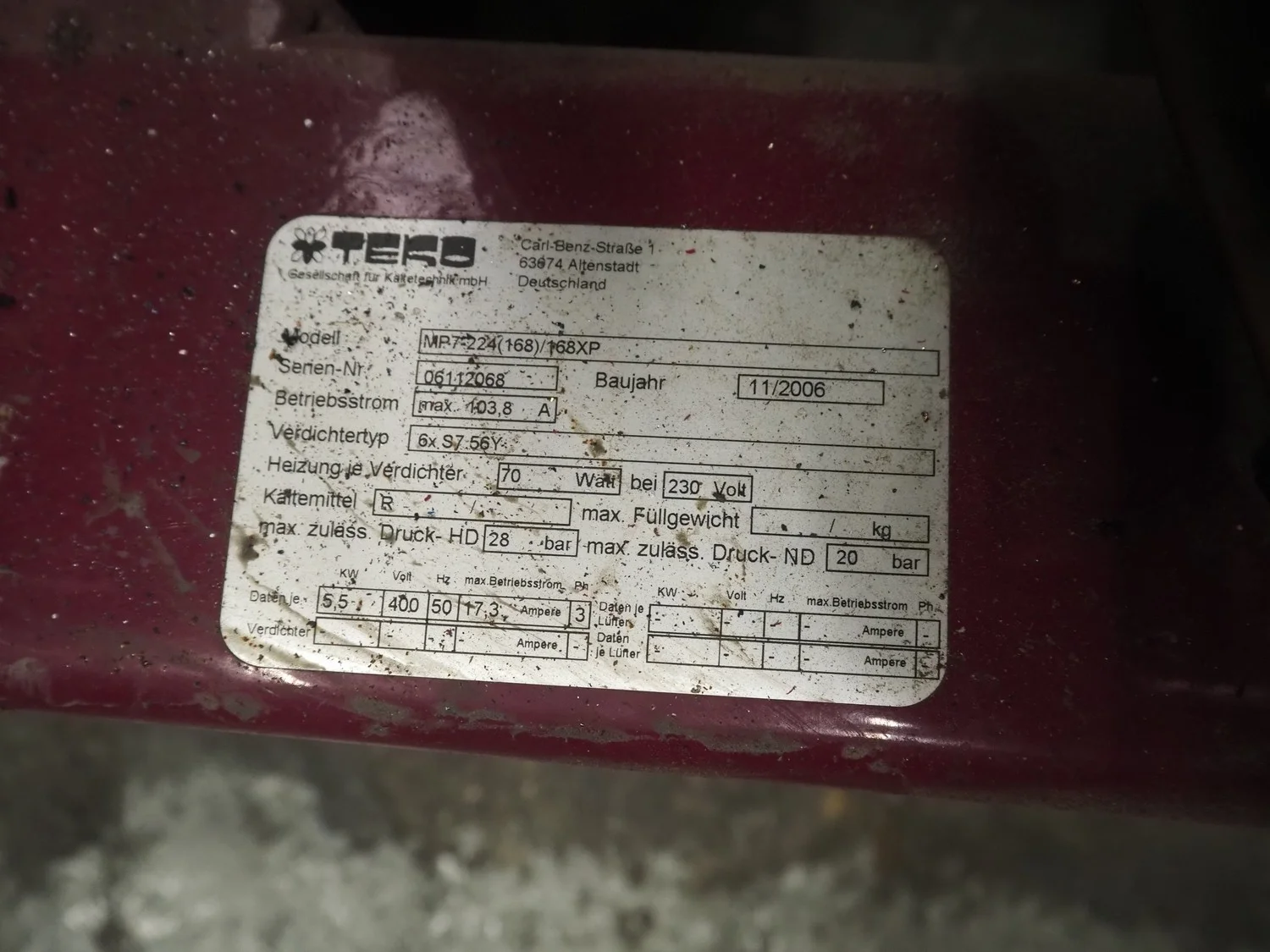 Teko compressor rack with 6 Frascold cooling compressors, type: (4x) S 7 56 Y, capacity: 56/67.2 m³ per hour, (2x) S 5 33 Y, capacity: 32.8/39.36 m³ per hour, dimensions: 2180 mm x 820 mm x 1720 mm.