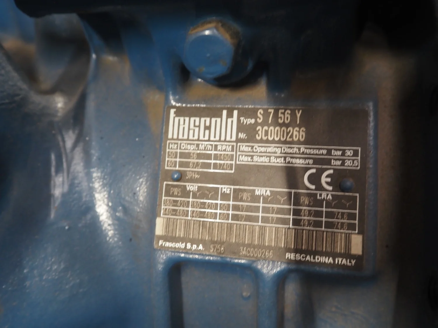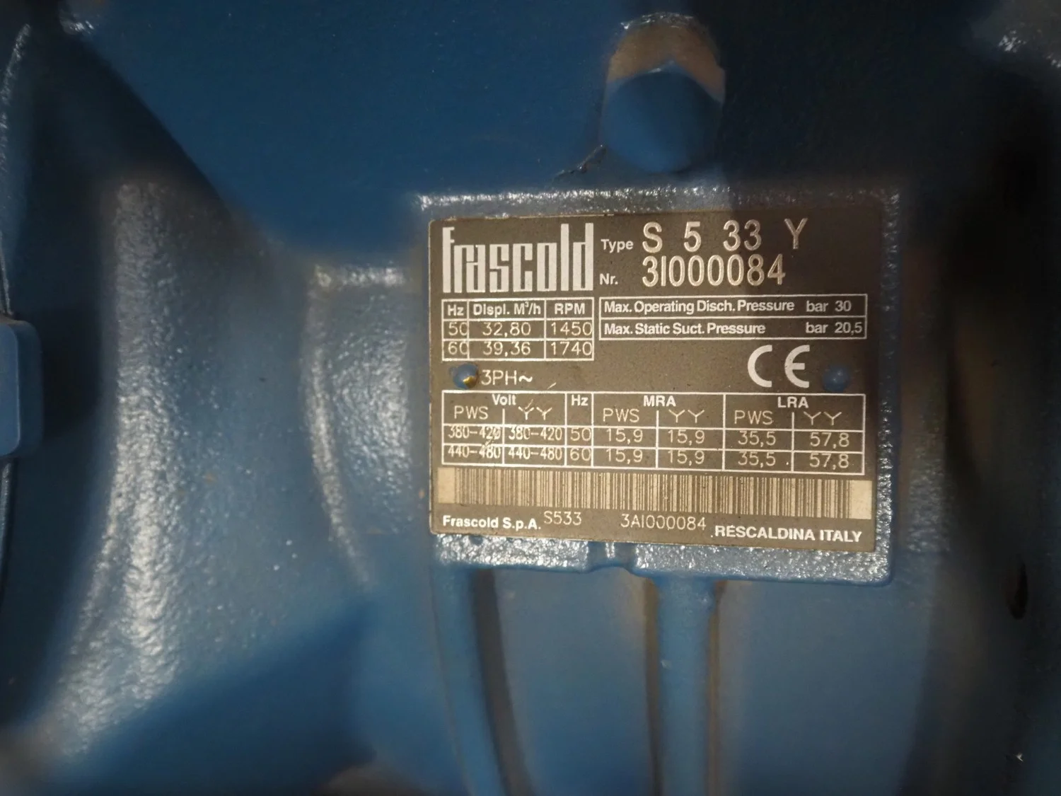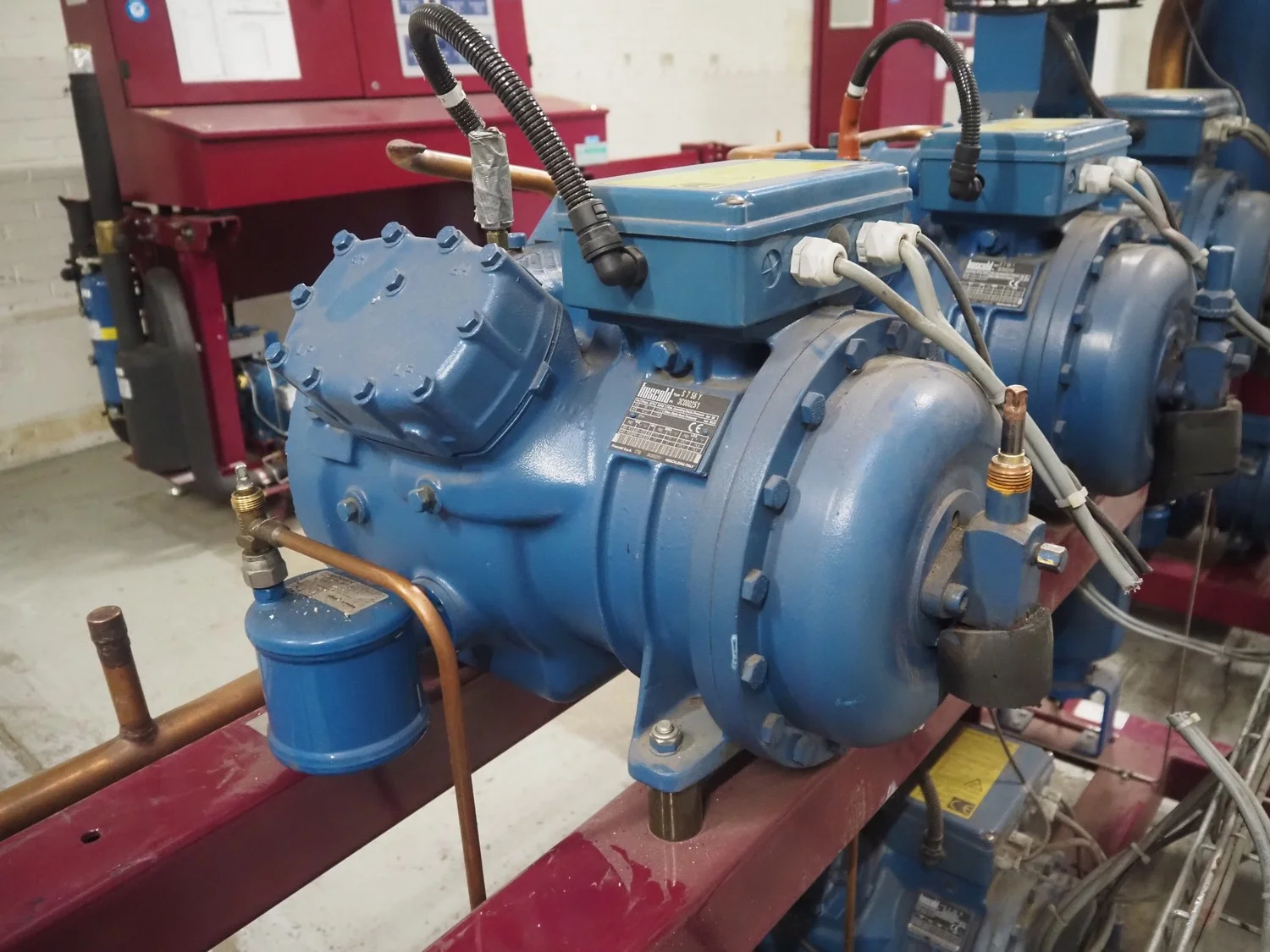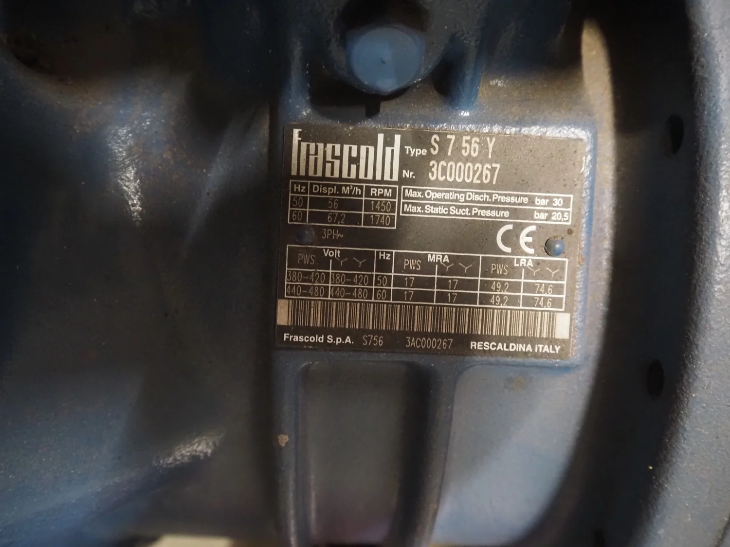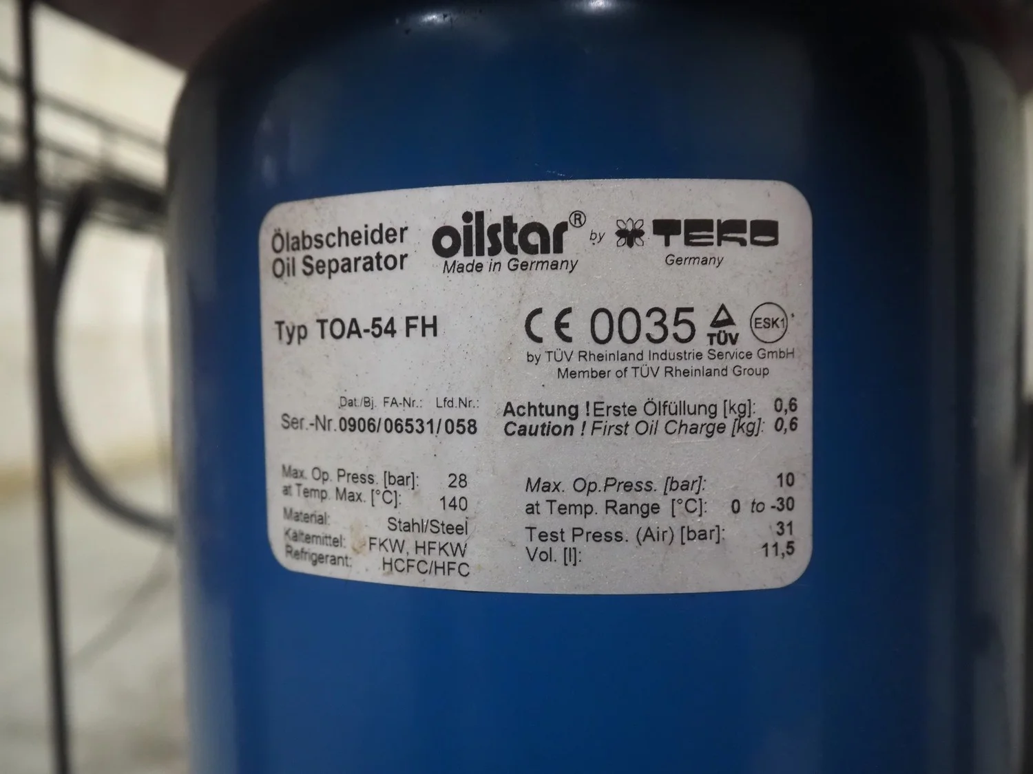 Teko compressor rack with 6 Frascold cooling compressors, type: (4x) S 7 56 Y, capacity: 56/67.2 m³ per hour, (2x) S 5 33 Y, capacity: 32.8/39.36 m³ per hour, dimensions: 2180 mm x 820 mm x 1720 mm.