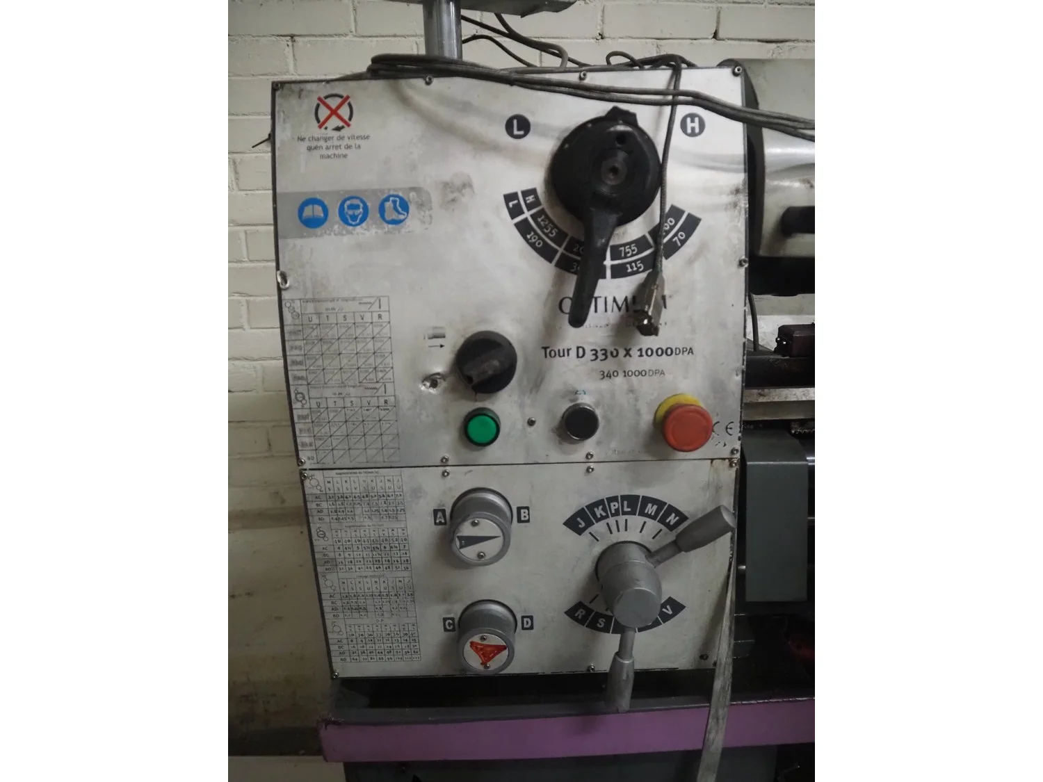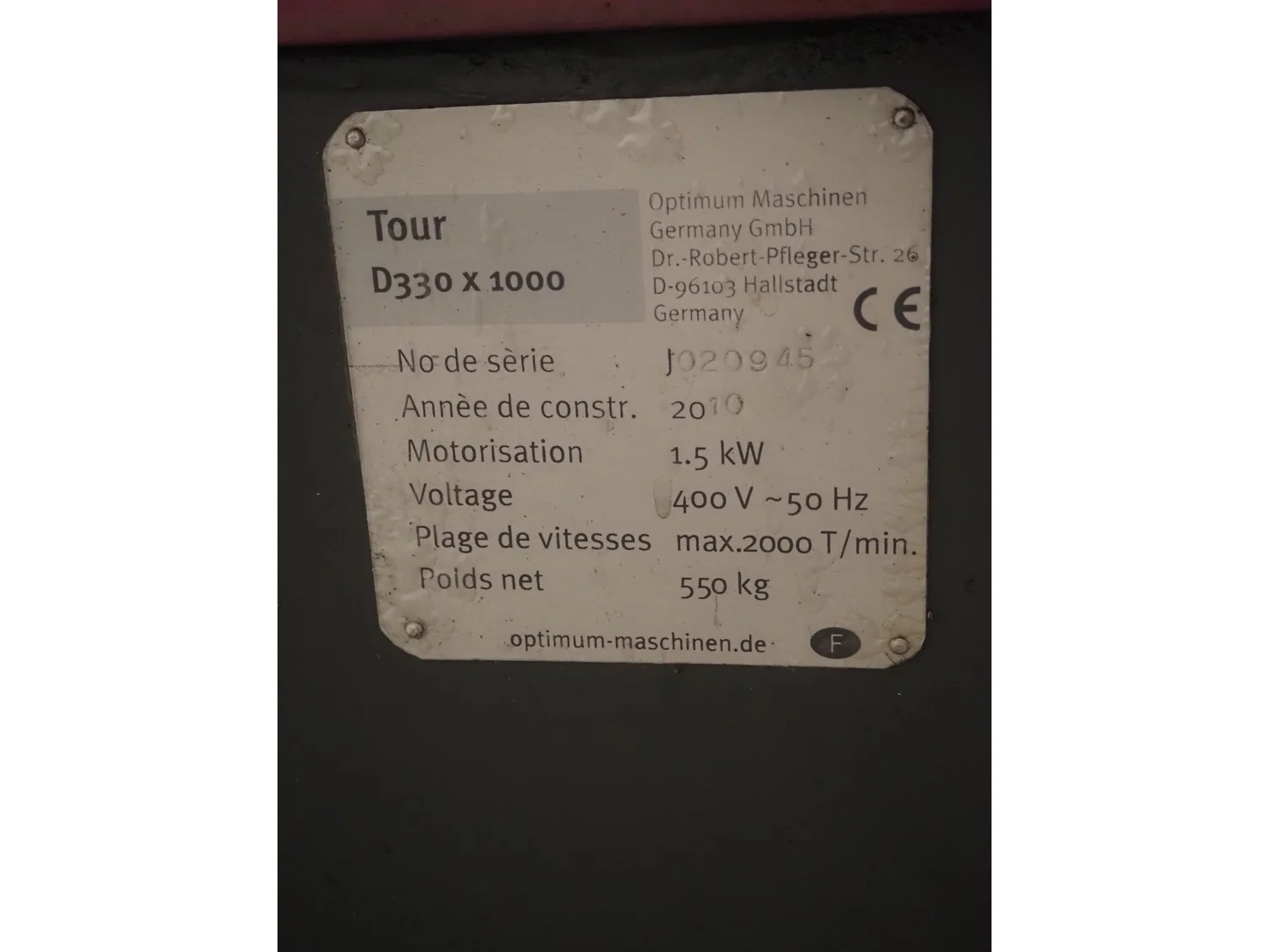 Optimum Maschinen lathe, model: Tour D330 x 1000, serial number: J020945, year of construction: 2010, 400 V, 50 Hz, 1.5 kW, dimensions: 1850 mm x 660 mm x 1600 mm.