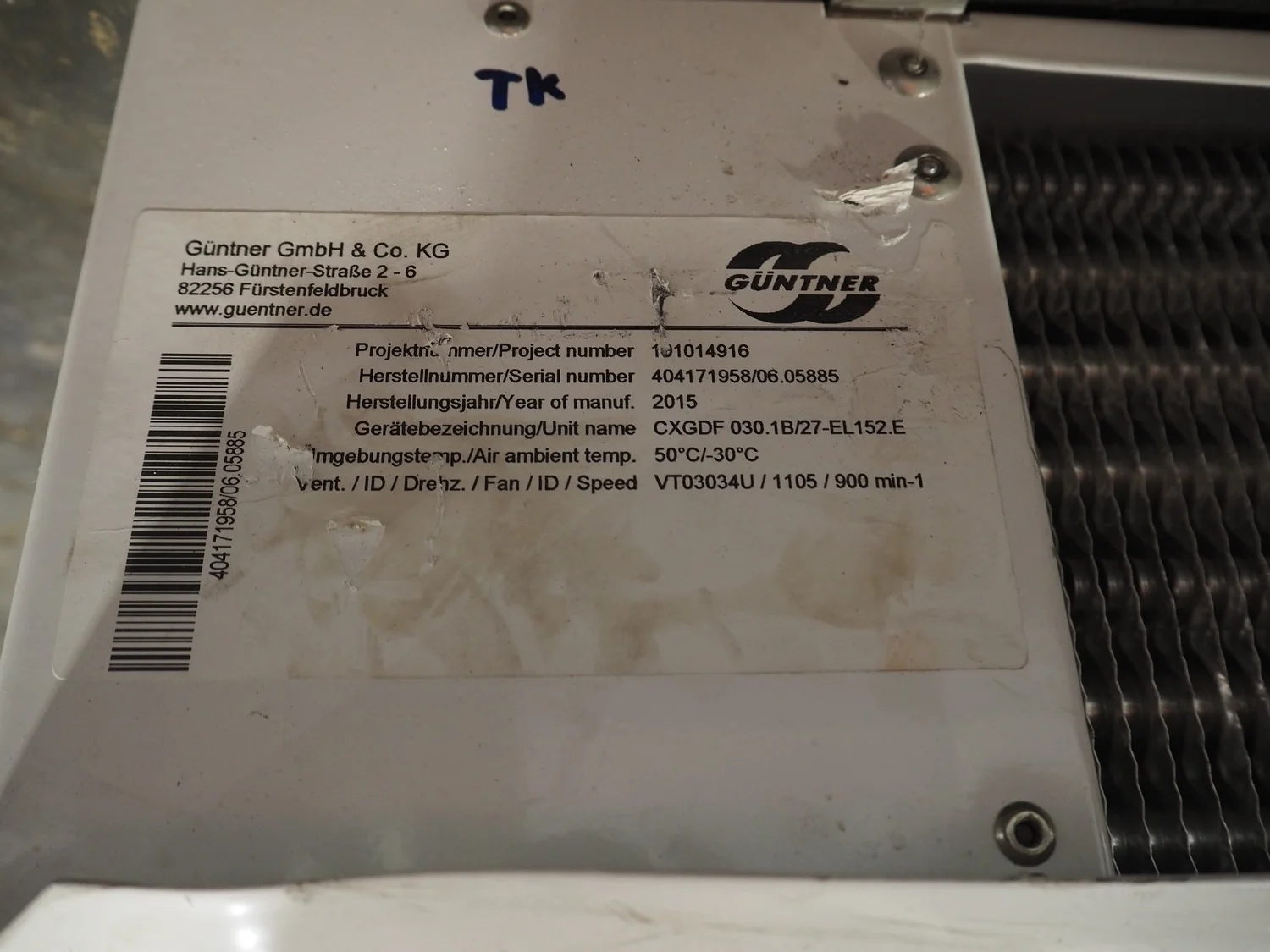 Güntner AG&Co.KG evaporator, type: CXGDF 030.1B/27-EL152.E, serial number: 404171958/06.05885, year of construction: 2015, 2 fans, dimensions: 1650 mm x 550 mm x 300 mm.