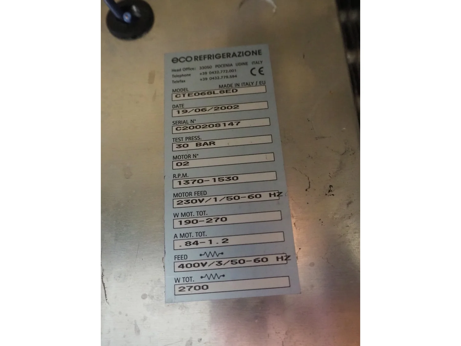 ECO Refrigeration s/s evaporator, model: CTE068L8ED, serial number: C200208147, year of construction: 19-06-2002, 230 V, 1 Ph, 50/60 Hz, 1370/1530 r.p.m. 3 fans, dimensions: 1000 mm x 500 mm x 400 mm.