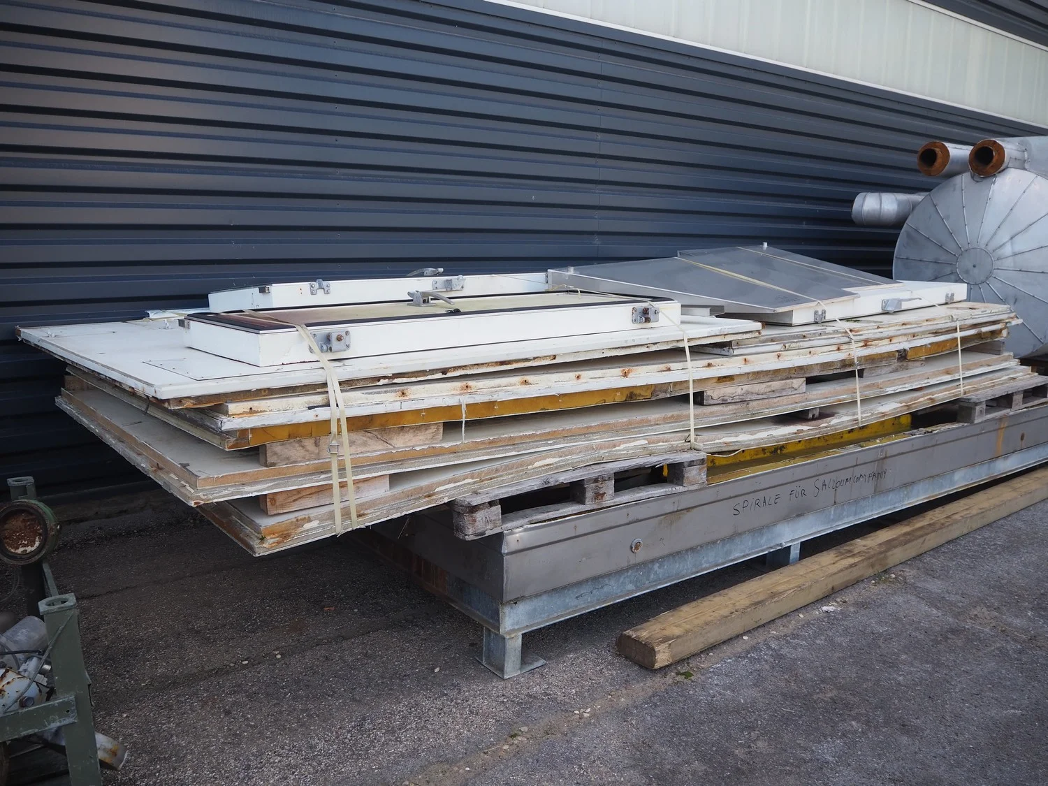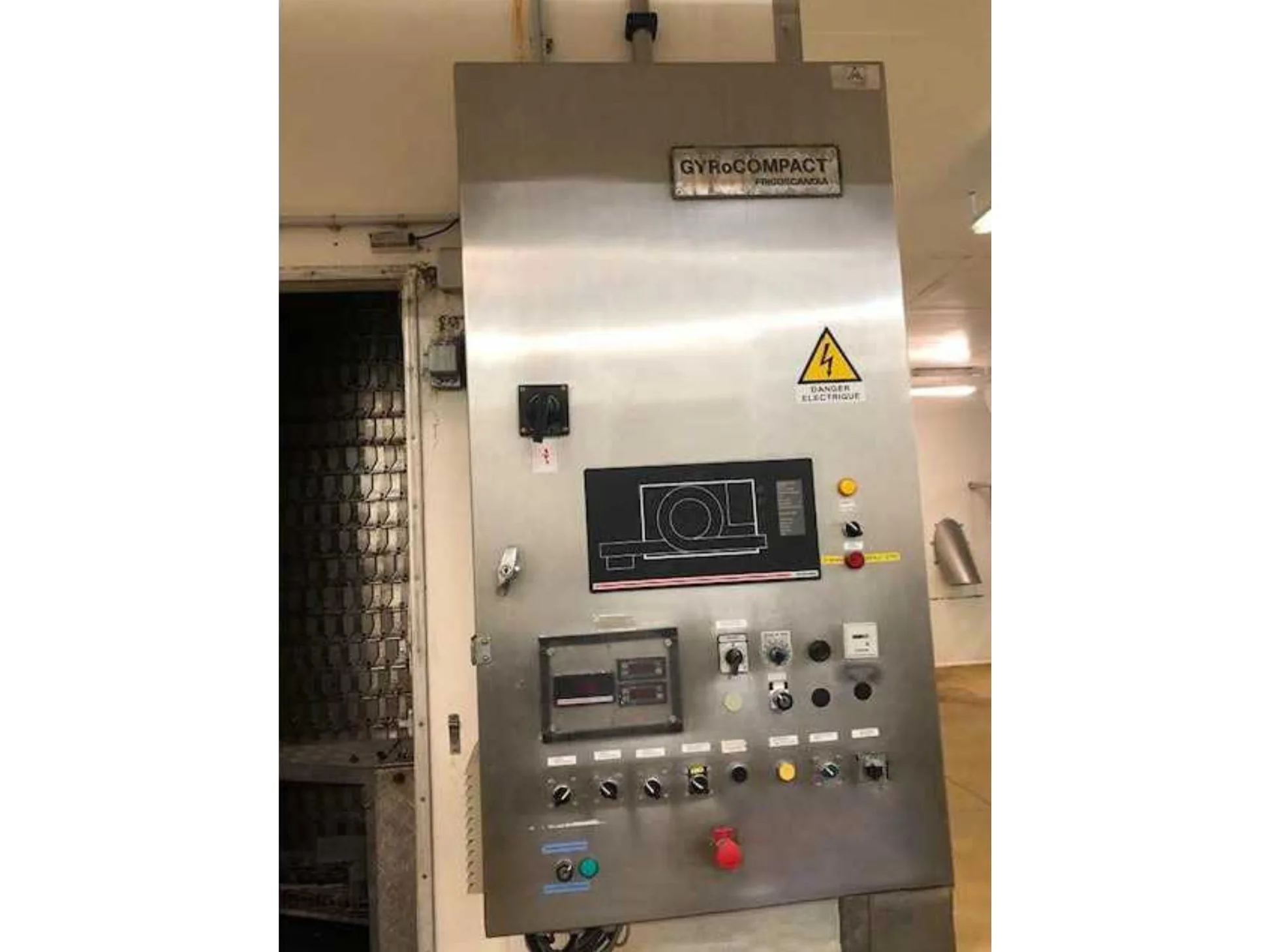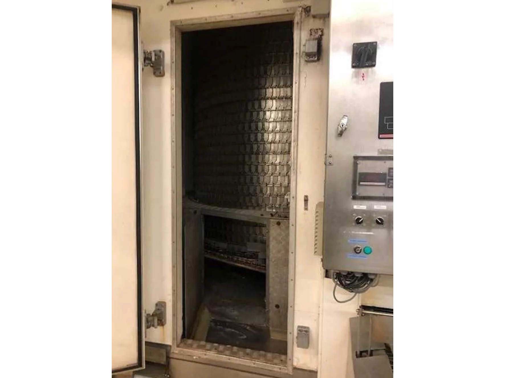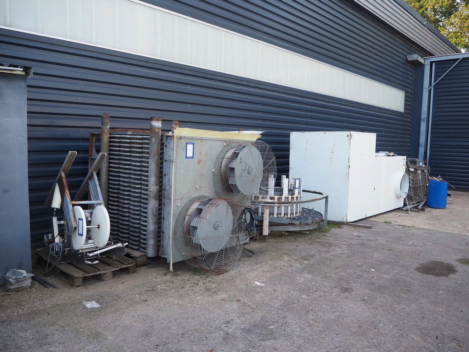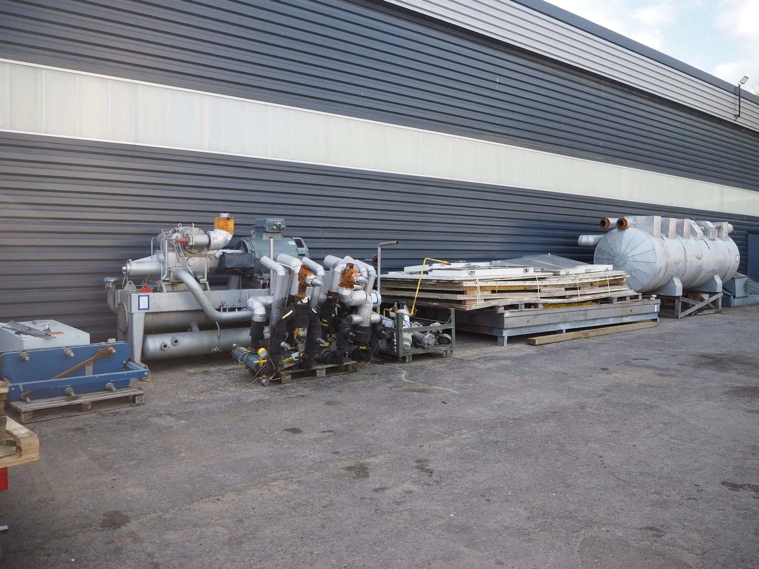 Frigoscandia spiral freezer, model: GYRoCOMPACT, type: GLP42, consisting of: 3 pallets with s/s mesh belts, belt width: 400 mm, dimensions: 2700 mm x 400 mm x 1000 mm; Fläkt Solyvent-Ventec fan, type: CHK LP 630 EDSP RD ADX, serial number: M192837 010/303703N0001, year of construction: 2003, temperature: Max 20°C, dimensions: 3700 mm x 1550 mm x 2060 mm; steel spiral, dimensions: ø 2400 mm x 900 mm; blower, 2 fans, dimensions: 2400 mm x 2000 mm x 2000 mm; Pallet with frame, dimensions: 1200 mm x 800 mm x 1300 mm; Plastic tube with parts, dimensions: 1200 mm x 1000 mm x 2000 mm; SMO International switch cabinet, type: GLP42, number: 424.02/470203, dimensions: 800 mm x 400 mm x 1500 mm; Assmann & Stocker condenser, number: 45130, year of construction: 1986, dimensions: 5000 mm x 2000 mm x 2100 mm; Steel frame with panels/doors, dimensions: 6500 mm x 2500 mm x 1500 mm; Steel box with parts, dimensions: 1300 mm x 1100 mm x 1600 mm; Sabroe cooling compressor, dimensions: 3500 mm x 1600 mm x 2300 mm; APV heat exchanger, type: N 35, number: 37905, year of construction: 1994, dimensions: 1000 mm x 500 mm x 1600 mm; Pallet with Hermatic pumps, dimensions: 2500 mm x 1200 mm x 1600 mm.