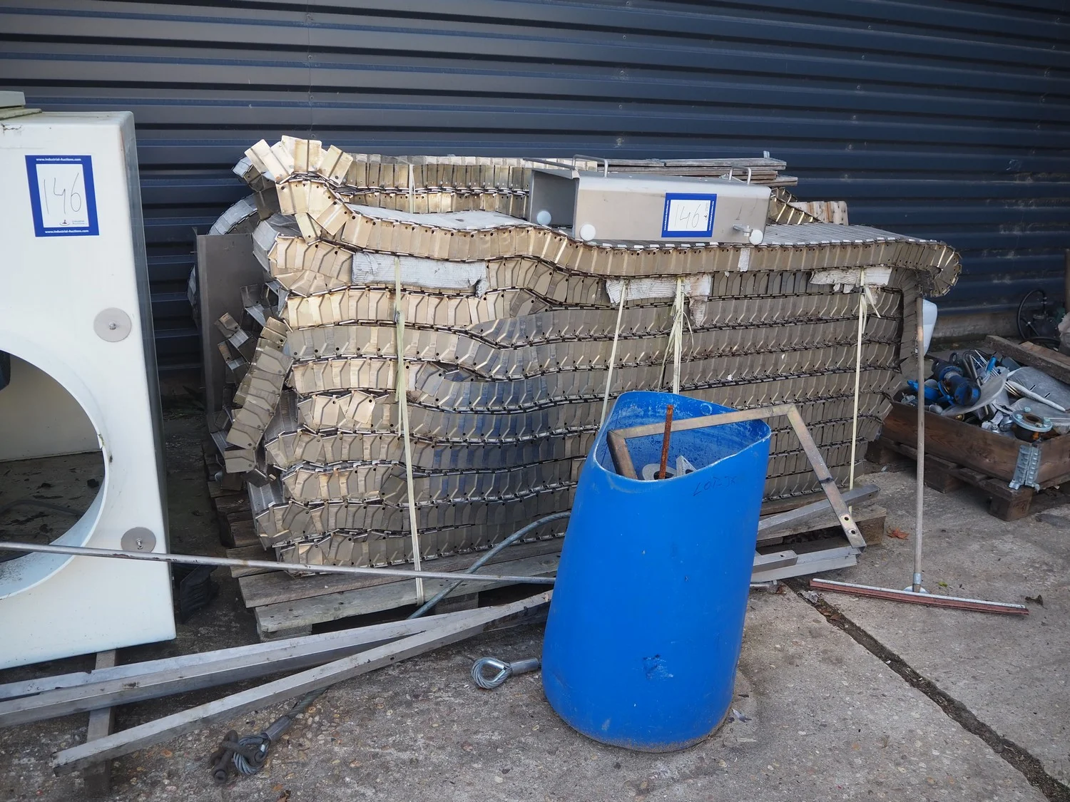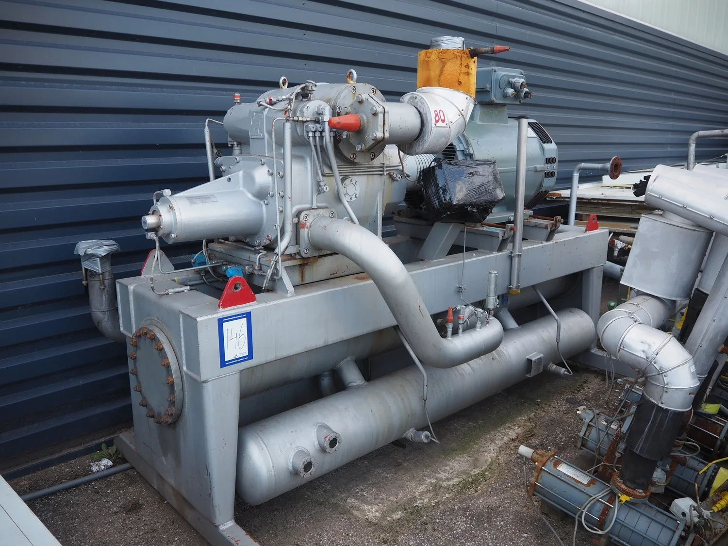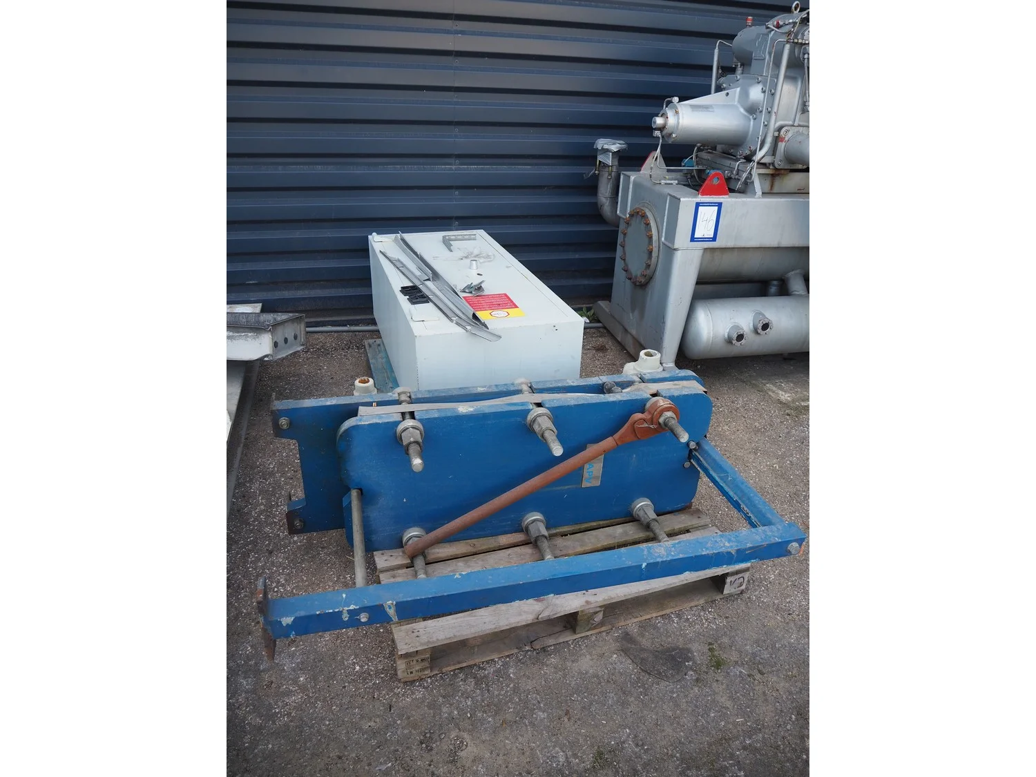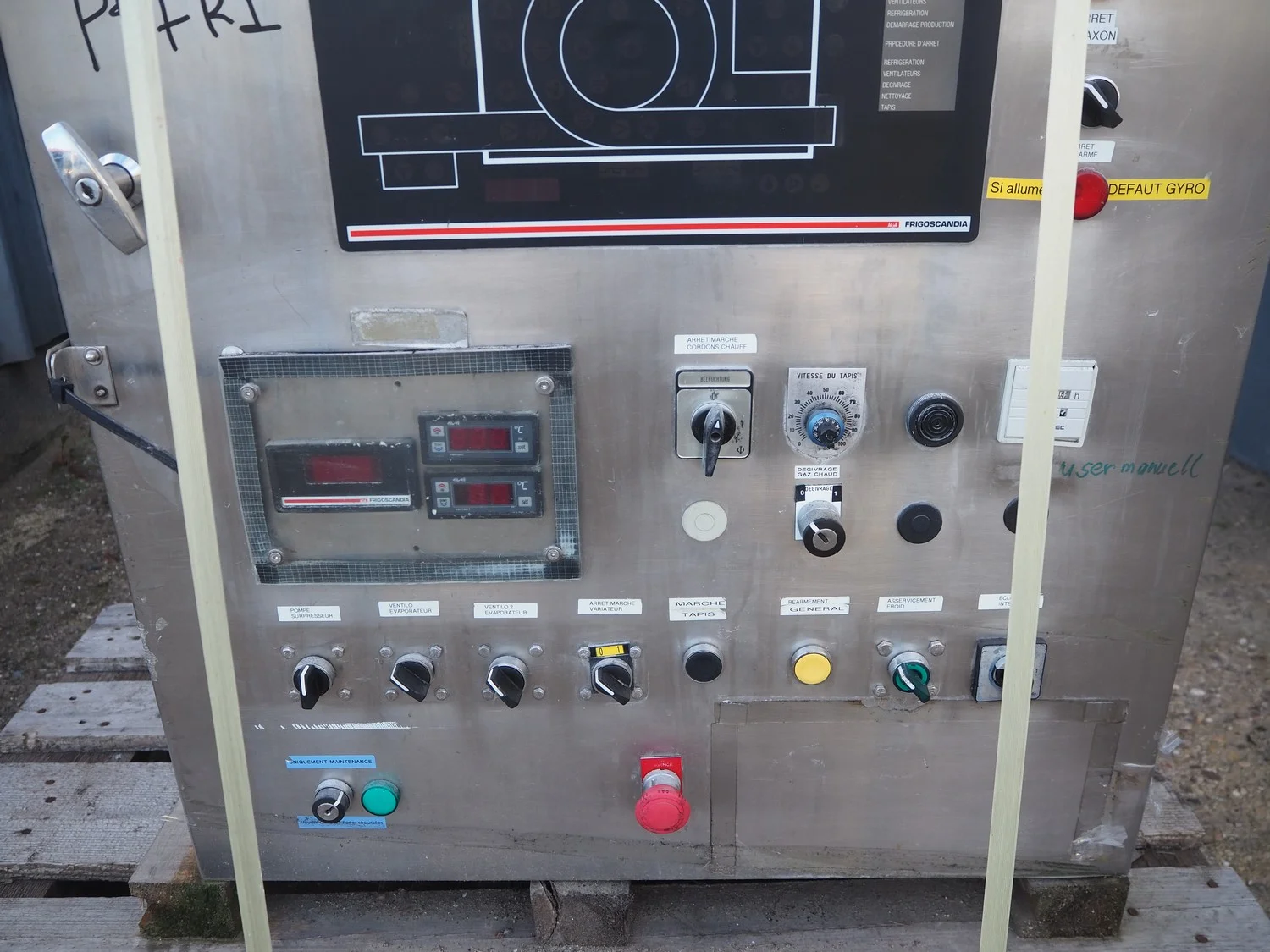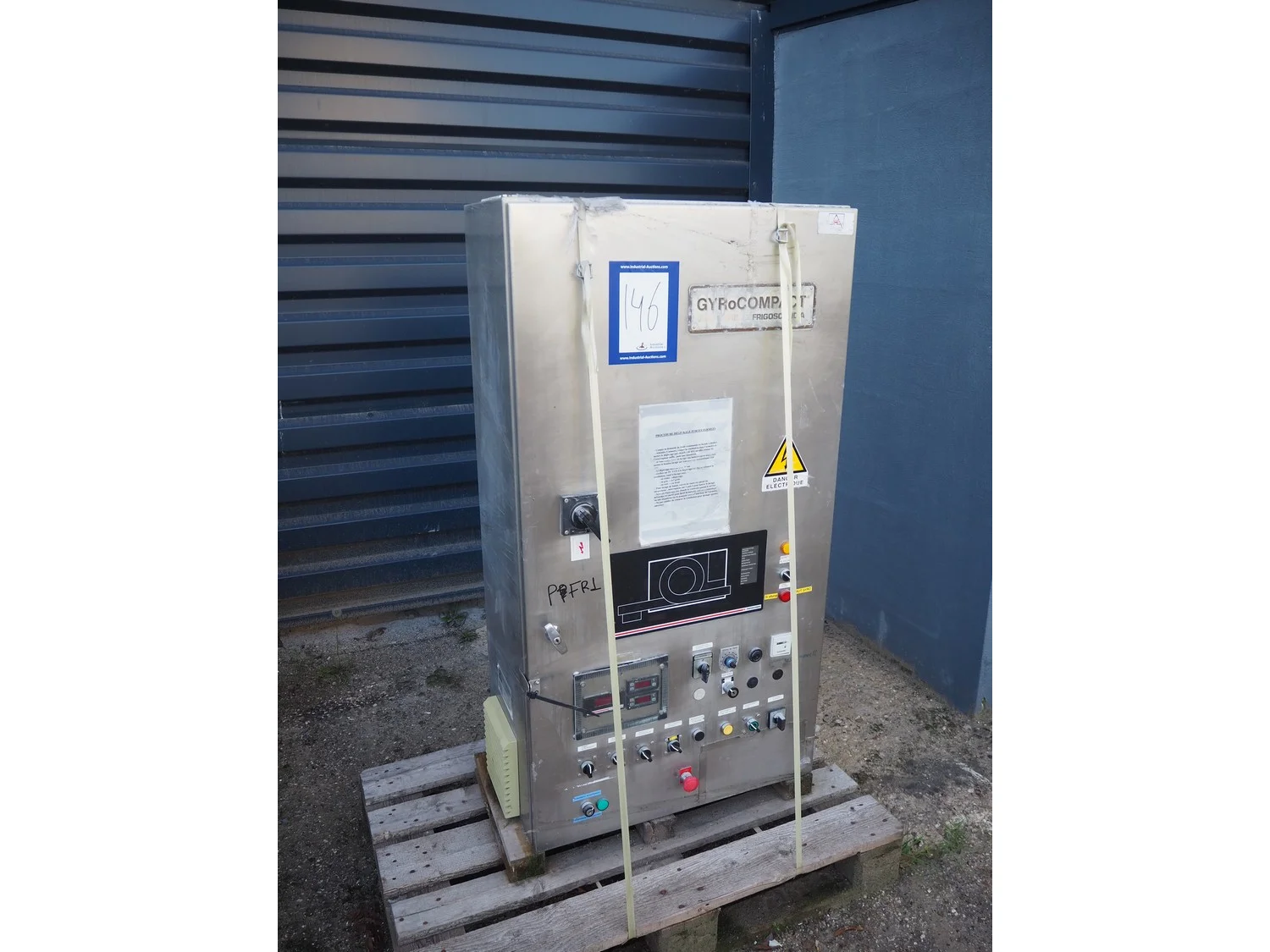 Frigoscandia spiral freezer, model: GYRoCOMPACT, type: GLP42, consisting of: 3 pallets with s/s mesh belts, belt width: 400 mm, dimensions: 2700 mm x 400 mm x 1000 mm; Fläkt Solyvent-Ventec fan, type: CHK LP 630 EDSP RD ADX, serial number: M192837 010/303703N0001, year of construction: 2003, temperature: Max 20°C, dimensions: 3700 mm x 1550 mm x 2060 mm; steel spiral, dimensions: ø 2400 mm x 900 mm; blower, 2 fans, dimensions: 2400 mm x 2000 mm x 2000 mm; Pallet with frame, dimensions: 1200 mm x 800 mm x 1300 mm; Plastic tube with parts, dimensions: 1200 mm x 1000 mm x 2000 mm; SMO International switch cabinet, type: GLP42, number: 424.02/470203, dimensions: 800 mm x 400 mm x 1500 mm; Assmann & Stocker condenser, number: 45130, year of construction: 1986, dimensions: 5000 mm x 2000 mm x 2100 mm; Steel frame with panels/doors, dimensions: 6500 mm x 2500 mm x 1500 mm; Steel box with parts, dimensions: 1300 mm x 1100 mm x 1600 mm; Sabroe cooling compressor, dimensions: 3500 mm x 1600 mm x 2300 mm; APV heat exchanger, type: N 35, number: 37905, year of construction: 1994, dimensions: 1000 mm x 500 mm x 1600 mm; Pallet with Hermatic pumps, dimensions: 2500 mm x 1200 mm x 1600 mm.