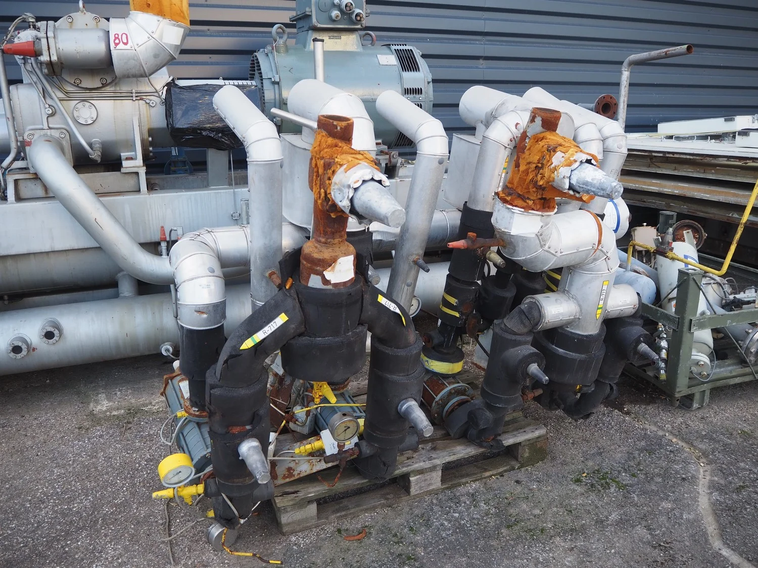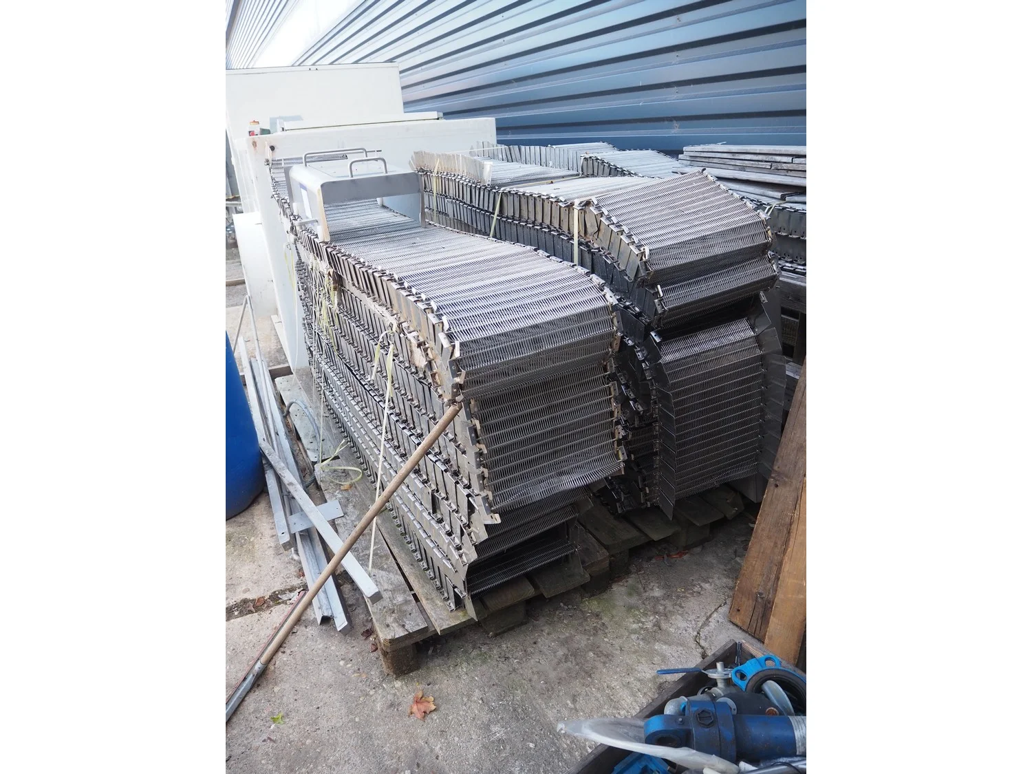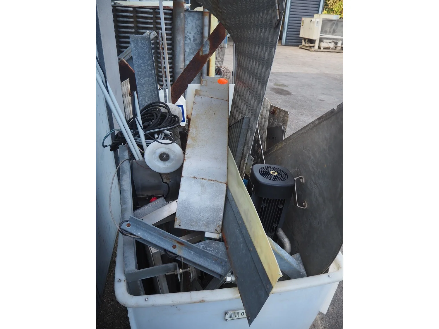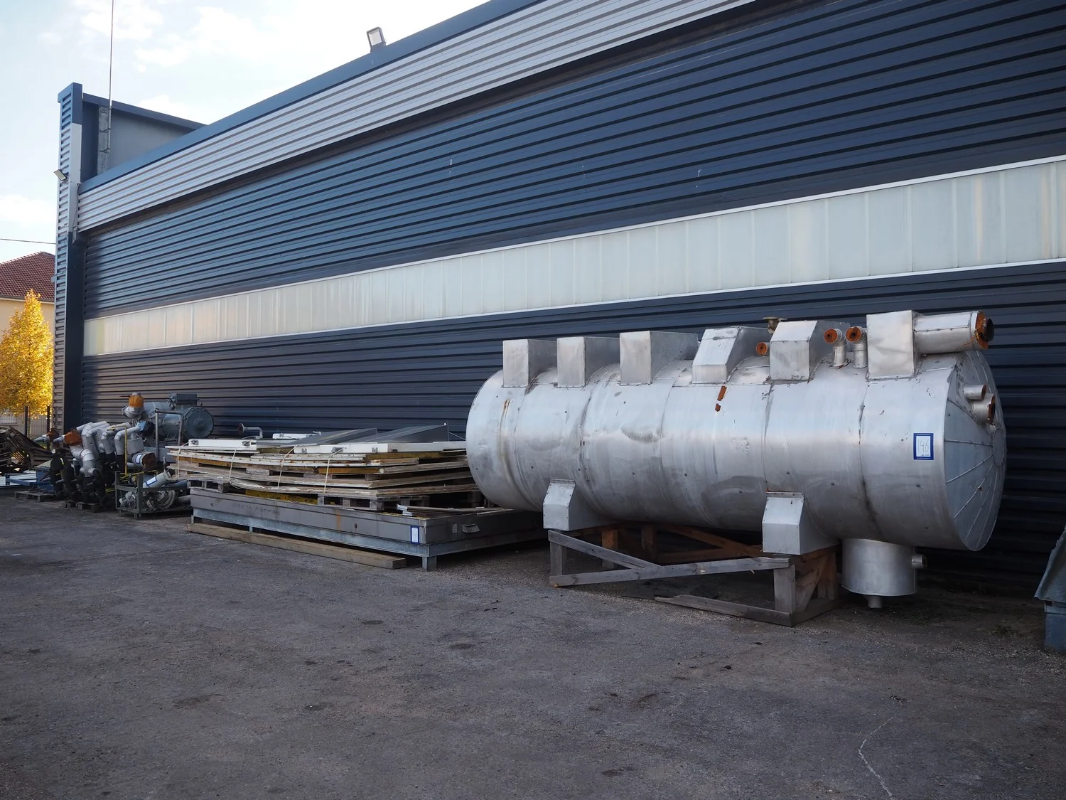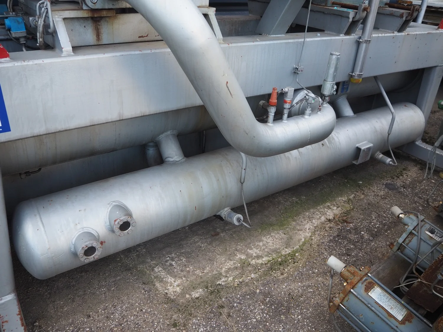 Frigoscandia spiral freezer, model: GYRoCOMPACT, type: GLP42, consisting of: 3 pallets with s/s mesh belts, belt width: 400 mm, dimensions: 2700 mm x 400 mm x 1000 mm; Fläkt Solyvent-Ventec fan, type: CHK LP 630 EDSP RD ADX, serial number: M192837 010/303703N0001, year of construction: 2003, temperature: Max 20°C, dimensions: 3700 mm x 1550 mm x 2060 mm; steel spiral, dimensions: ø 2400 mm x 900 mm; blower, 2 fans, dimensions: 2400 mm x 2000 mm x 2000 mm; Pallet with frame, dimensions: 1200 mm x 800 mm x 1300 mm; Plastic tube with parts, dimensions: 1200 mm x 1000 mm x 2000 mm; SMO International switch cabinet, type: GLP42, number: 424.02/470203, dimensions: 800 mm x 400 mm x 1500 mm; Assmann & Stocker condenser, number: 45130, year of construction: 1986, dimensions: 5000 mm x 2000 mm x 2100 mm; Steel frame with panels/doors, dimensions: 6500 mm x 2500 mm x 1500 mm; Steel box with parts, dimensions: 1300 mm x 1100 mm x 1600 mm; Sabroe cooling compressor, dimensions: 3500 mm x 1600 mm x 2300 mm; APV heat exchanger, type: N 35, number: 37905, year of construction: 1994, dimensions: 1000 mm x 500 mm x 1600 mm; Pallet with Hermatic pumps, dimensions: 2500 mm x 1200 mm x 1600 mm.