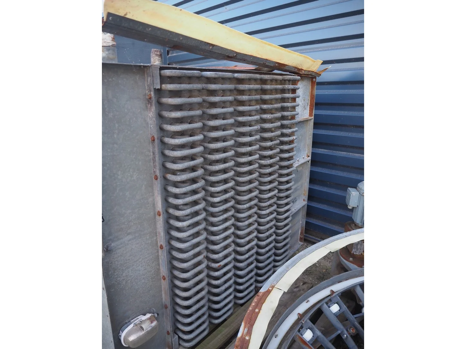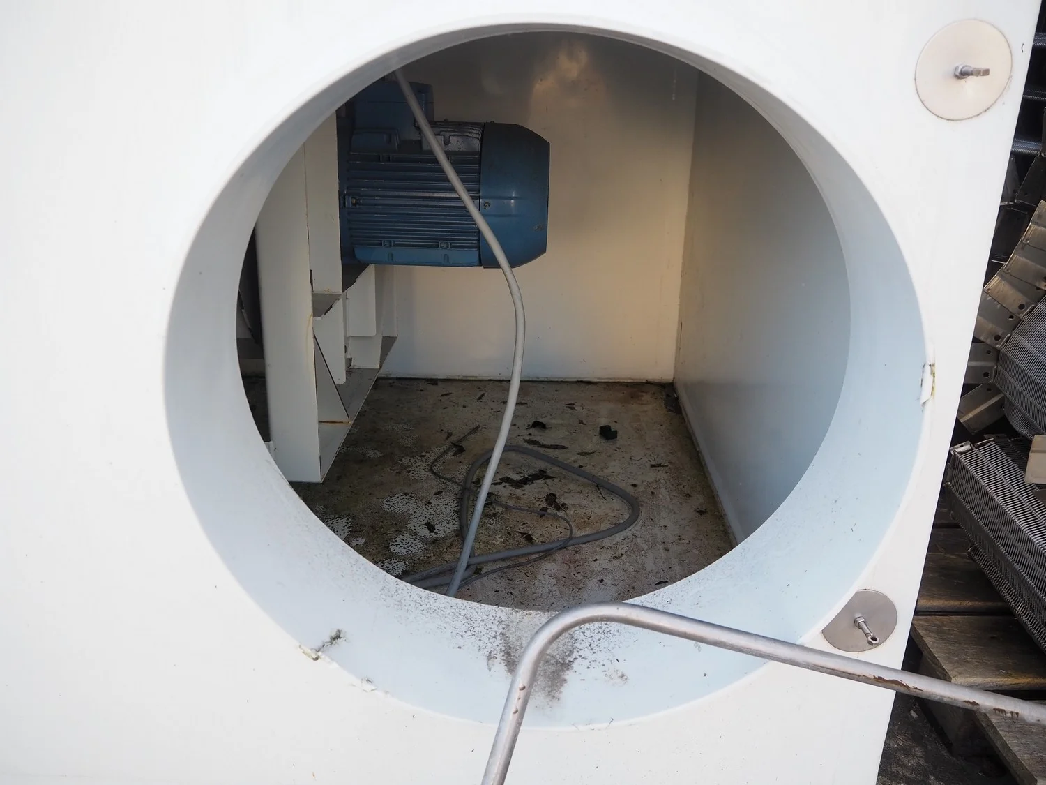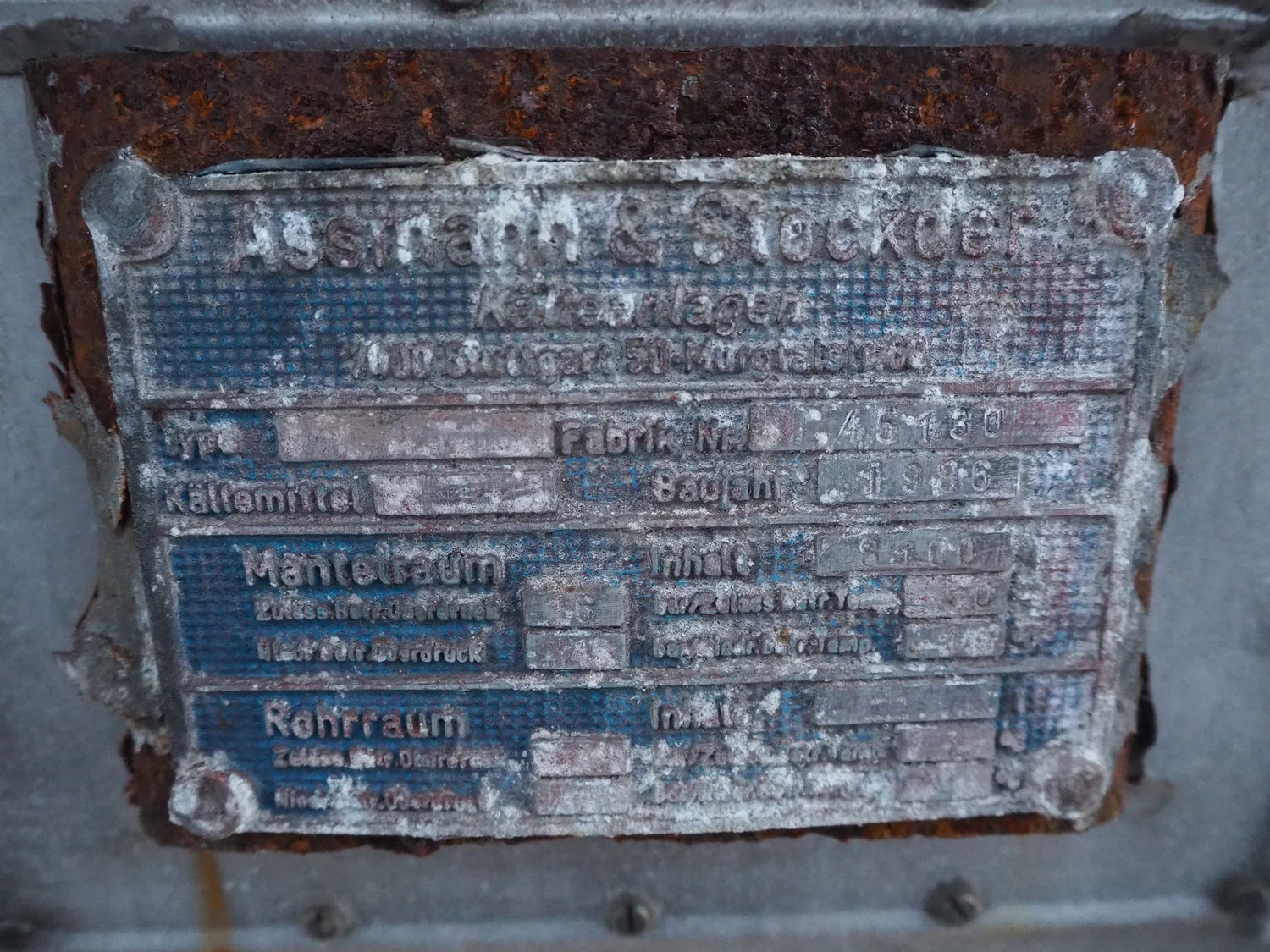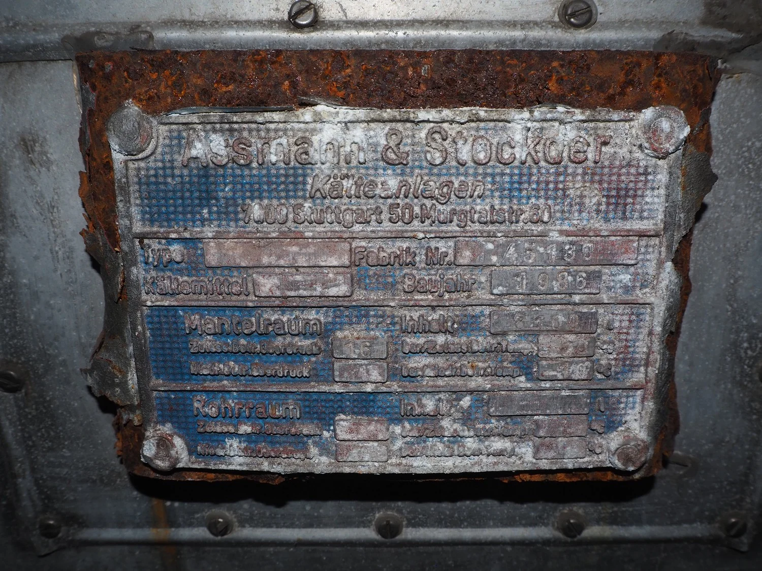 Frigoscandia spiral freezer, model: GYRoCOMPACT, type: GLP42, consisting of: 3 pallets with s/s mesh belts, belt width: 400 mm, dimensions: 2700 mm x 400 mm x 1000 mm; Fläkt Solyvent-Ventec fan, type: CHK LP 630 EDSP RD ADX, serial number: M192837 010/303703N0001, year of construction: 2003, temperature: Max 20°C, dimensions: 3700 mm x 1550 mm x 2060 mm; steel spiral, dimensions: ø 2400 mm x 900 mm; blower, 2 fans, dimensions: 2400 mm x 2000 mm x 2000 mm; Pallet with frame, dimensions: 1200 mm x 800 mm x 1300 mm; Plastic tube with parts, dimensions: 1200 mm x 1000 mm x 2000 mm; SMO International switch cabinet, type: GLP42, number: 424.02/470203, dimensions: 800 mm x 400 mm x 1500 mm; Assmann & Stocker condenser, number: 45130, year of construction: 1986, dimensions: 5000 mm x 2000 mm x 2100 mm; Steel frame with panels/doors, dimensions: 6500 mm x 2500 mm x 1500 mm; Steel box with parts, dimensions: 1300 mm x 1100 mm x 1600 mm; Sabroe cooling compressor, dimensions: 3500 mm x 1600 mm x 2300 mm; APV heat exchanger, type: N 35, number: 37905, year of construction: 1994, dimensions: 1000 mm x 500 mm x 1600 mm; Pallet with Hermatic pumps, dimensions: 2500 mm x 1200 mm x 1600 mm.