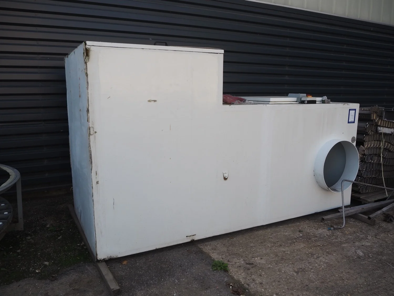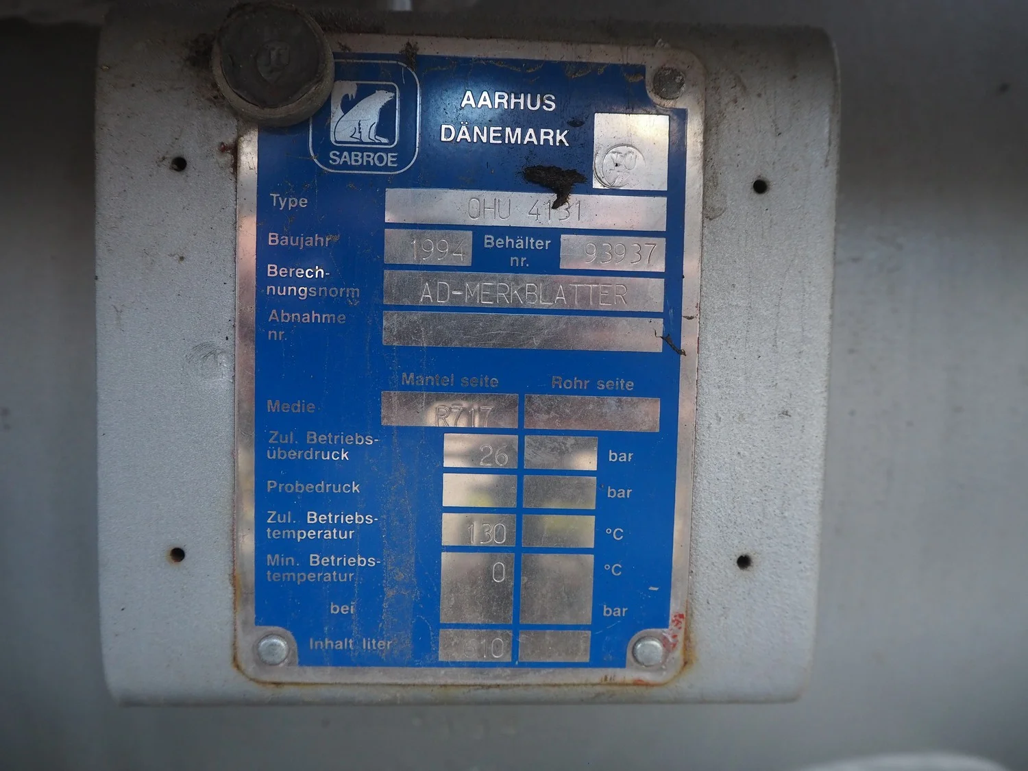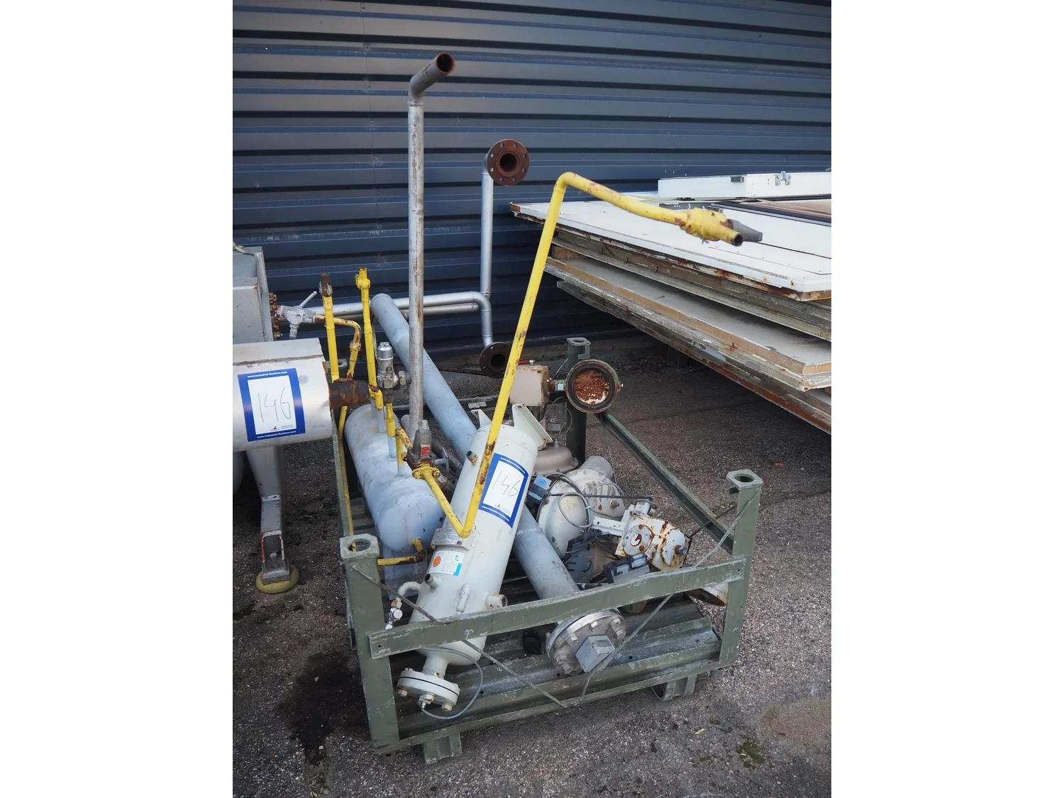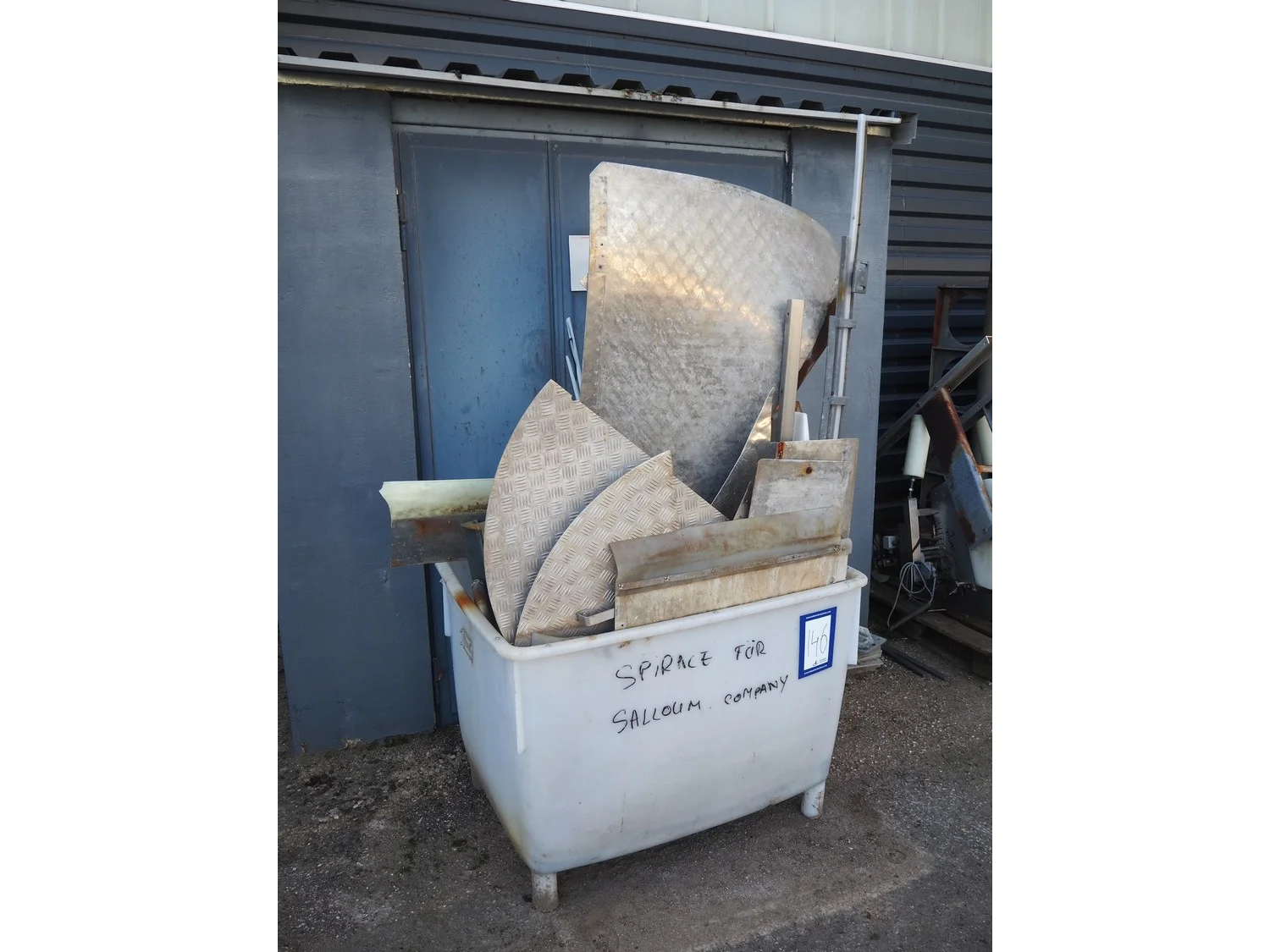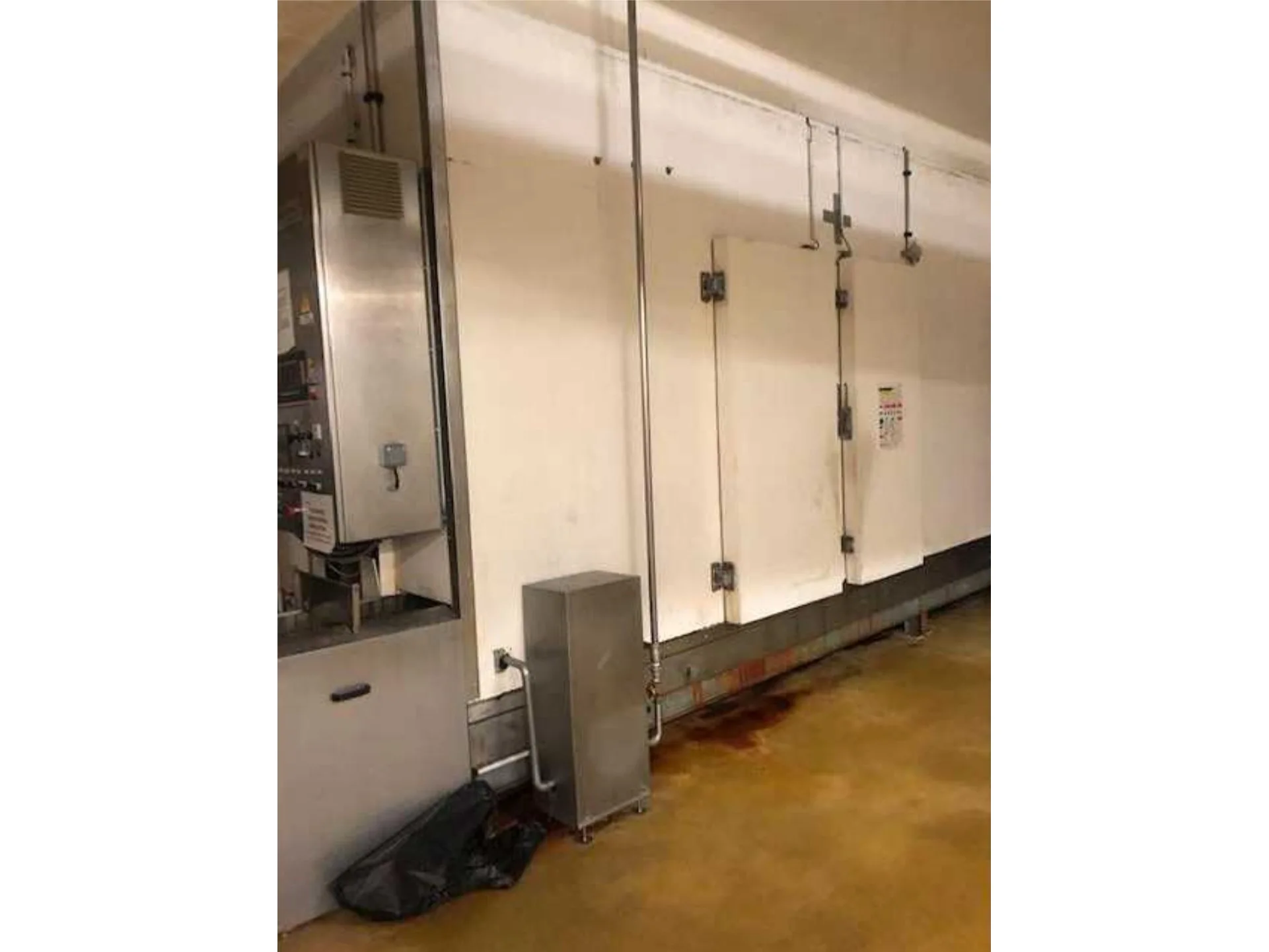 Frigoscandia spiral freezer, model: GYRoCOMPACT, type: GLP42, consisting of: 3 pallets with s/s mesh belts, belt width: 400 mm, dimensions: 2700 mm x 400 mm x 1000 mm; Fläkt Solyvent-Ventec fan, type: CHK LP 630 EDSP RD ADX, serial number: M192837 010/303703N0001, year of construction: 2003, temperature: Max 20°C, dimensions: 3700 mm x 1550 mm x 2060 mm; steel spiral, dimensions: ø 2400 mm x 900 mm; blower, 2 fans, dimensions: 2400 mm x 2000 mm x 2000 mm; Pallet with frame, dimensions: 1200 mm x 800 mm x 1300 mm; Plastic tube with parts, dimensions: 1200 mm x 1000 mm x 2000 mm; SMO International switch cabinet, type: GLP42, number: 424.02/470203, dimensions: 800 mm x 400 mm x 1500 mm; Assmann & Stocker condenser, number: 45130, year of construction: 1986, dimensions: 5000 mm x 2000 mm x 2100 mm; Steel frame with panels/doors, dimensions: 6500 mm x 2500 mm x 1500 mm; Steel box with parts, dimensions: 1300 mm x 1100 mm x 1600 mm; Sabroe cooling compressor, dimensions: 3500 mm x 1600 mm x 2300 mm; APV heat exchanger, type: N 35, number: 37905, year of construction: 1994, dimensions: 1000 mm x 500 mm x 1600 mm; Pallet with Hermatic pumps, dimensions: 2500 mm x 1200 mm x 1600 mm.