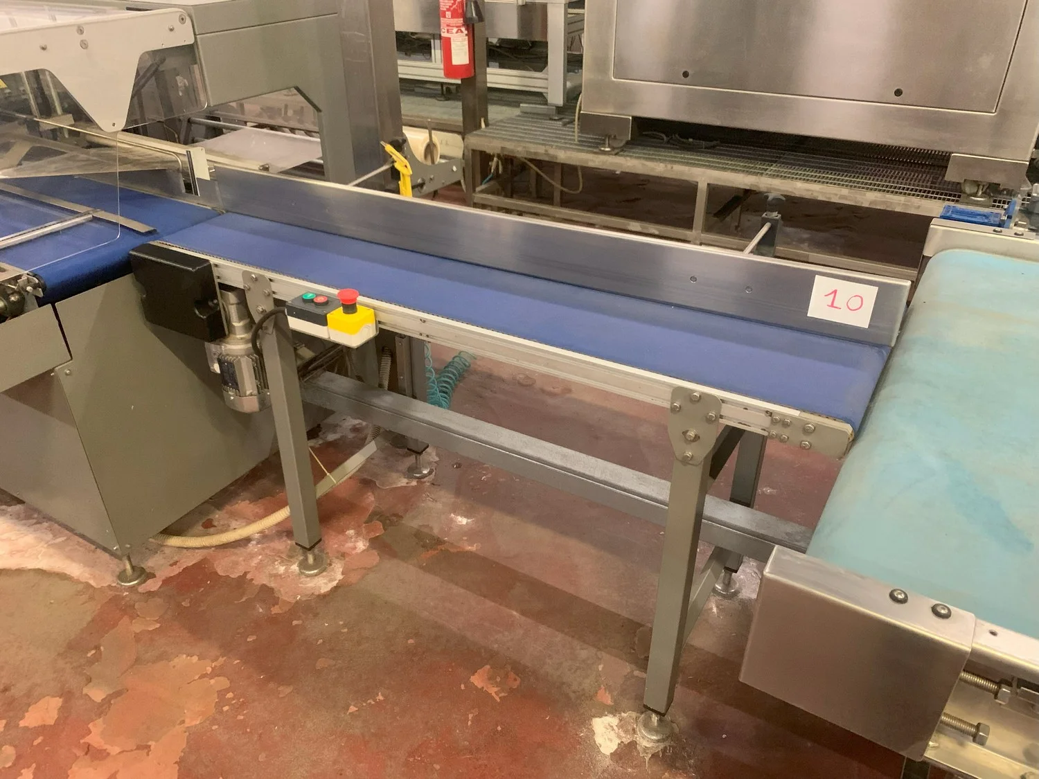 Transport belt, s/s and aluminium frame, plastic belt, dimensions: 1550 mm x 700 mm x 1000 mm.