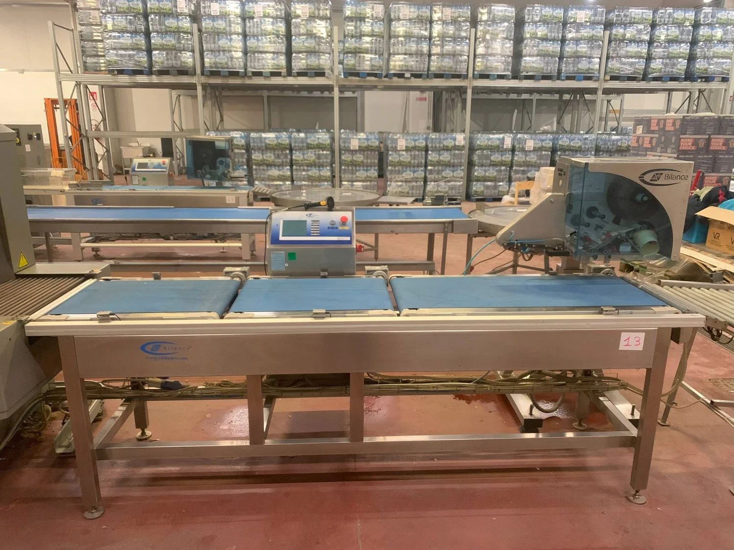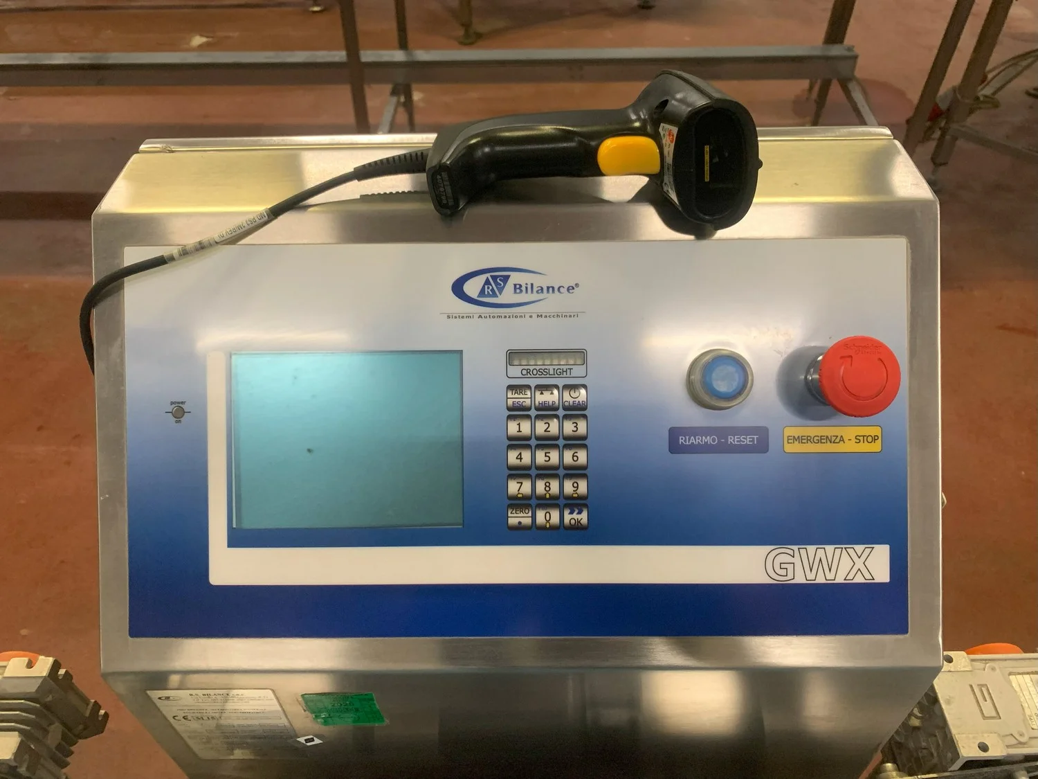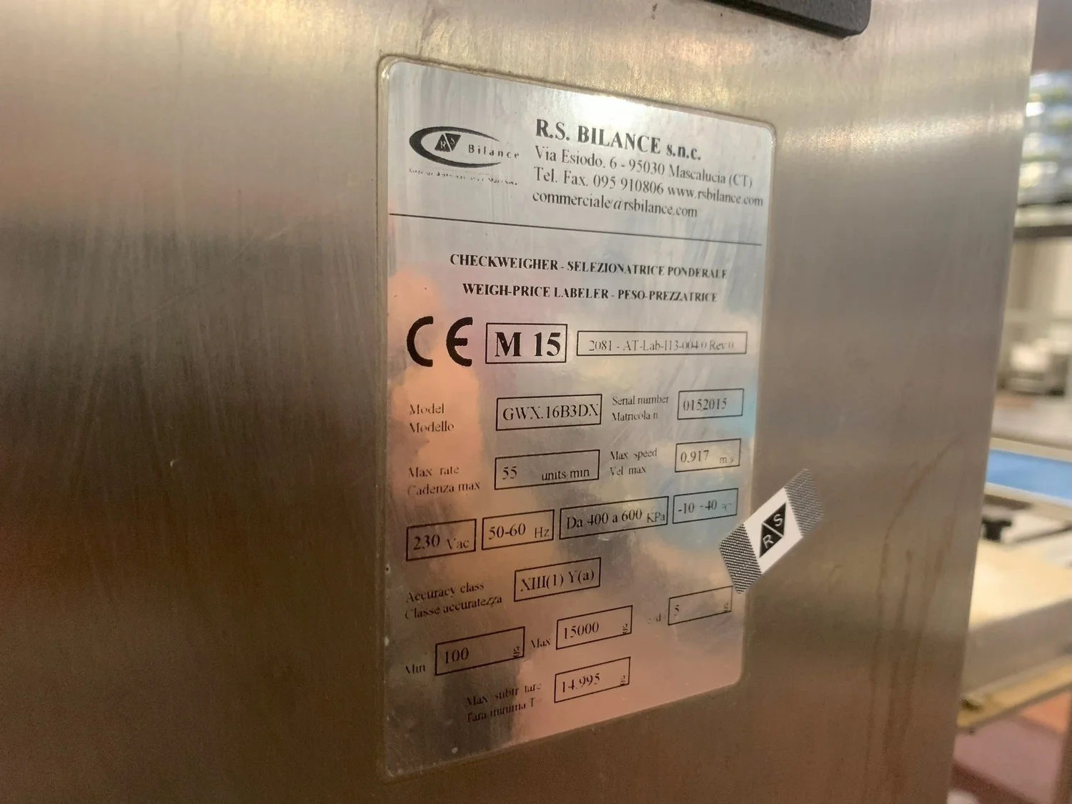 R.S. BILANCE s.n.c. weighing and labelling machine, model: GWX16B3DX, serial number: 0152015, 230 V, 50-60 Hz, minimum weight: 100 gram, maximum weight: 15000 gram, d= 5 gram, maximum rate: 55 units/min, maximum speed: 0.917 m/s, dimensions: 2850 mm x 1400 mm x 1500 mm.