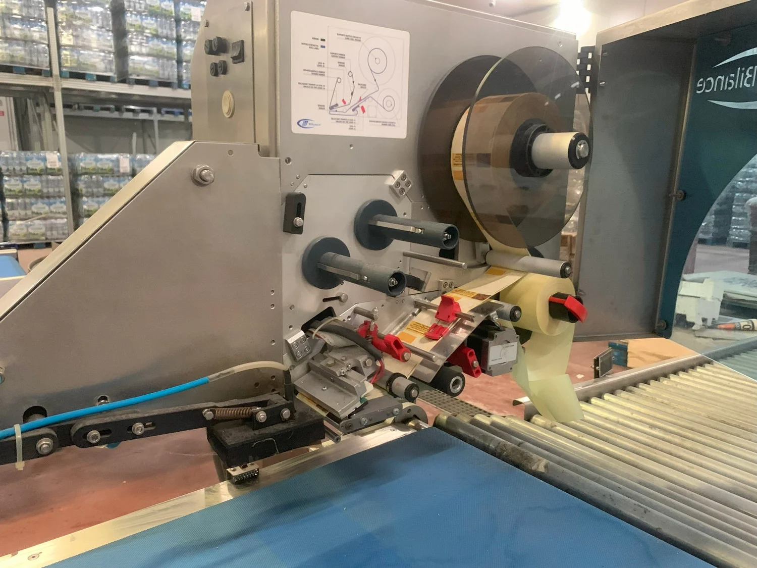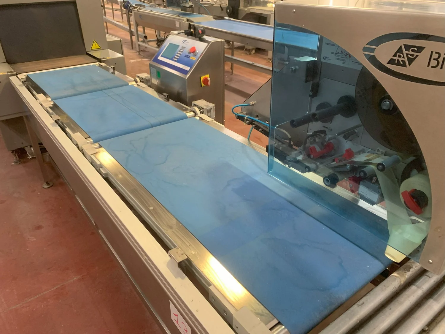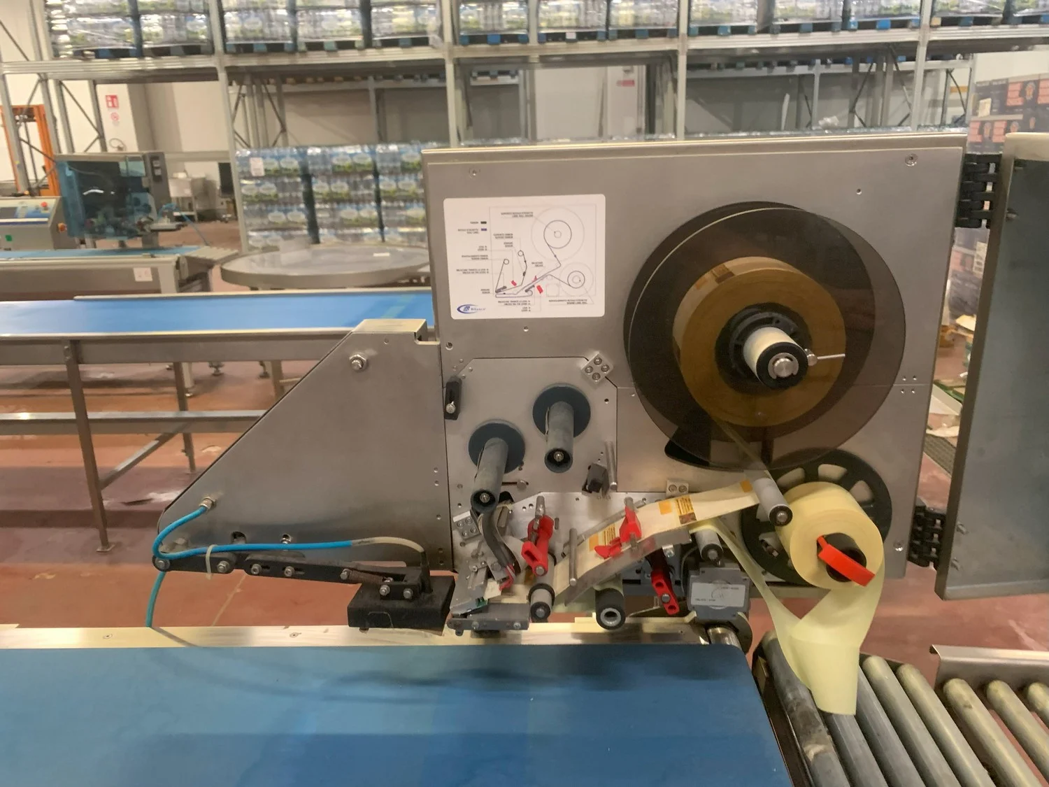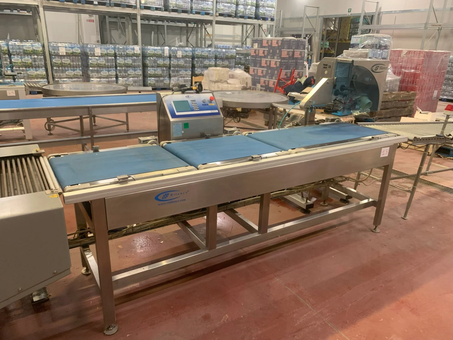 R.S. BILANCE s.n.c. weighing and labelling machine, model: GWX16B3DX, serial number: 0152015, 230 V, 50-60 Hz, minimum weight: 100 gram, maximum weight: 15000 gram, d= 5 gram, maximum rate: 55 units/min, maximum speed: 0.917 m/s, dimensions: 2850 mm x 1400 mm x 1500 mm.
