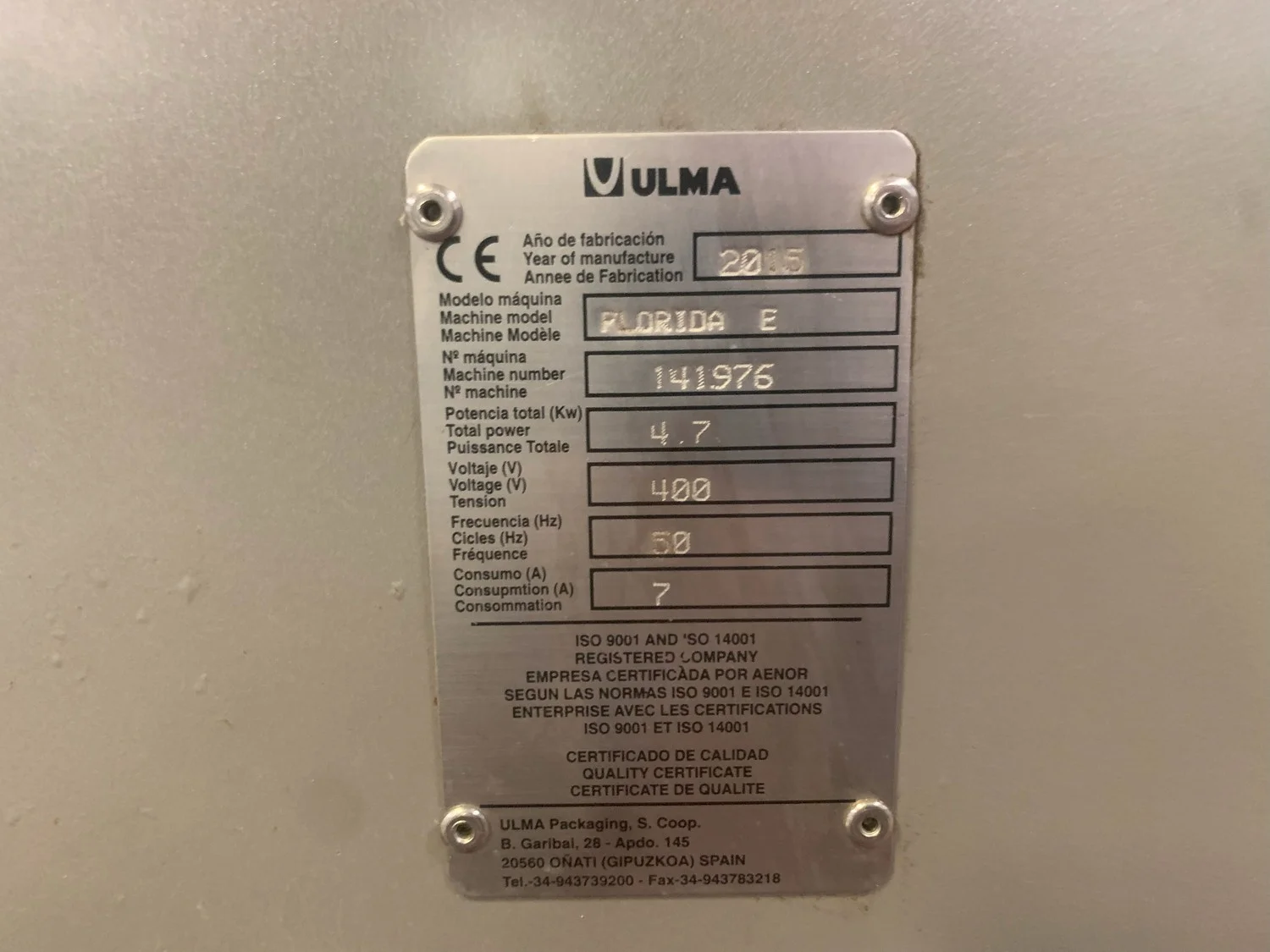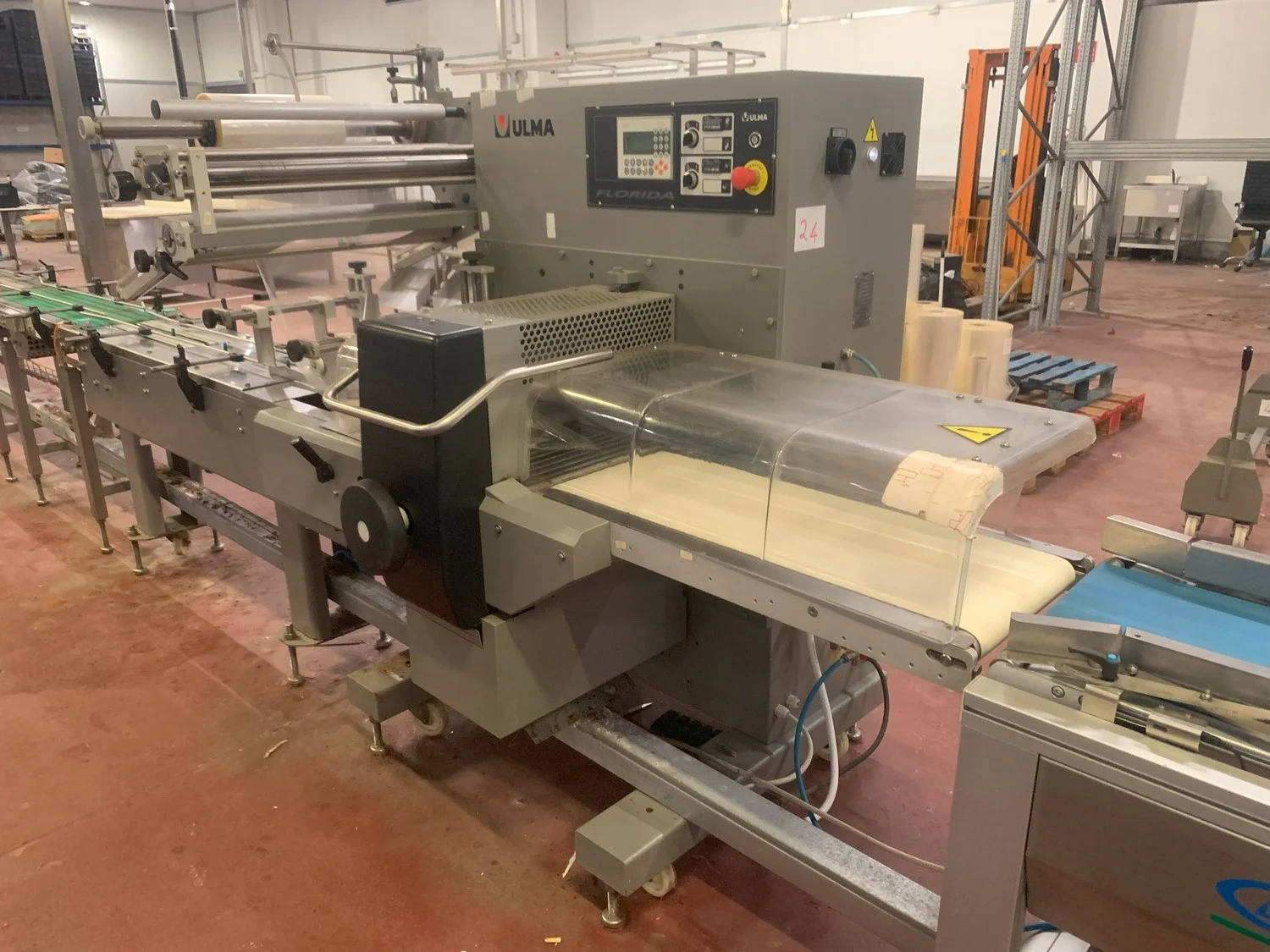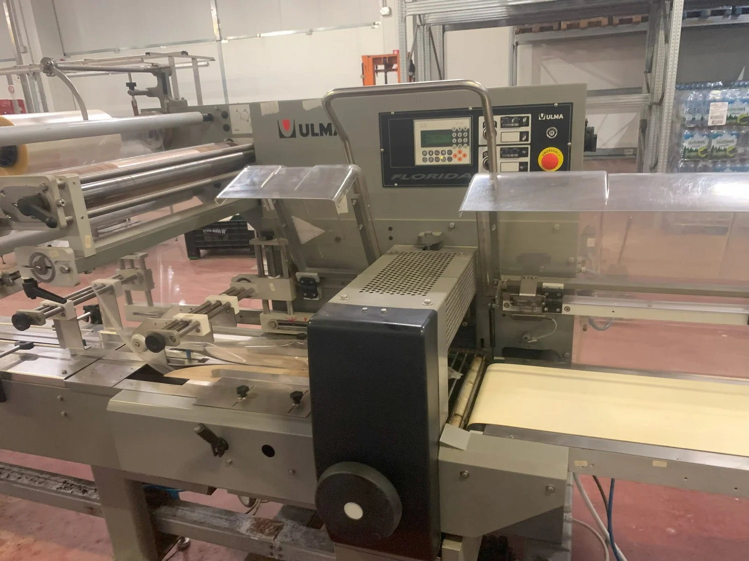 Ulma horizontal flow pack wrapper, model: FLORIDA E, machine number: 141976, year of construction: 2015, 400 V, 50 Hz, 4.7 kW, 7 A, dimensions: 3250 mm x 1250 mm x 1700 mm.
