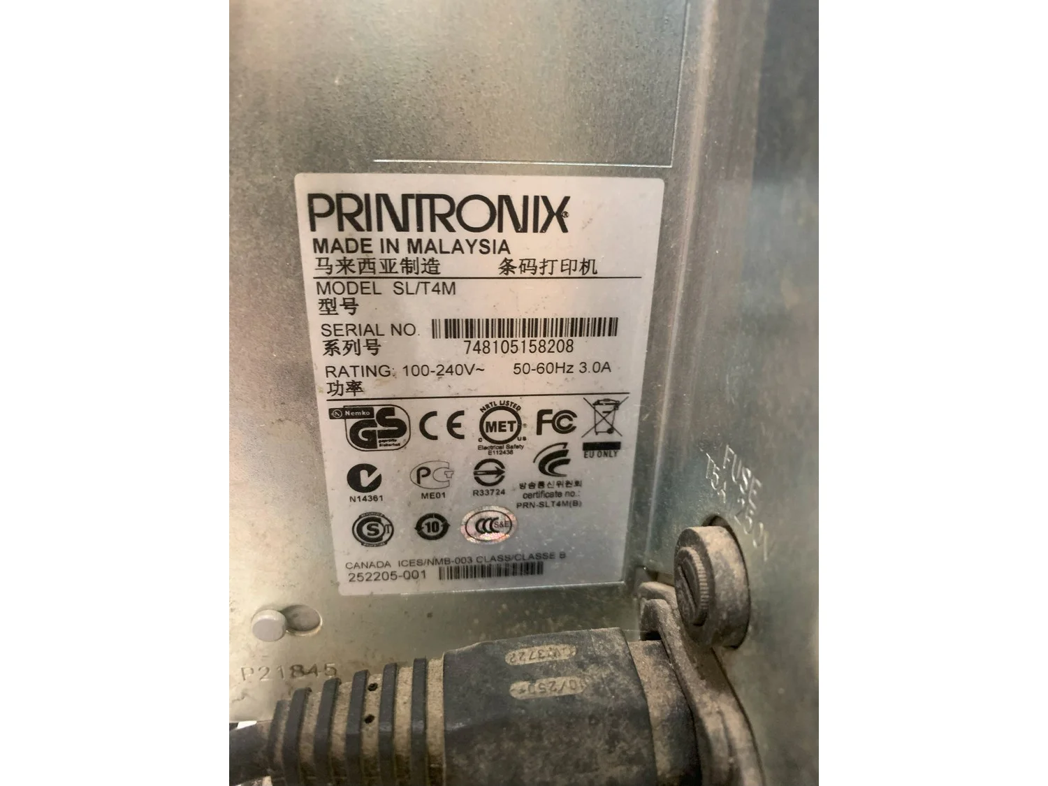 Printronix label printer, model: SL/T4M, serial number: 748105158208, 100-240 V, 50-60 Hz, 3.0 A, dimensions: 500 mm x 300 mm x 300 mm.