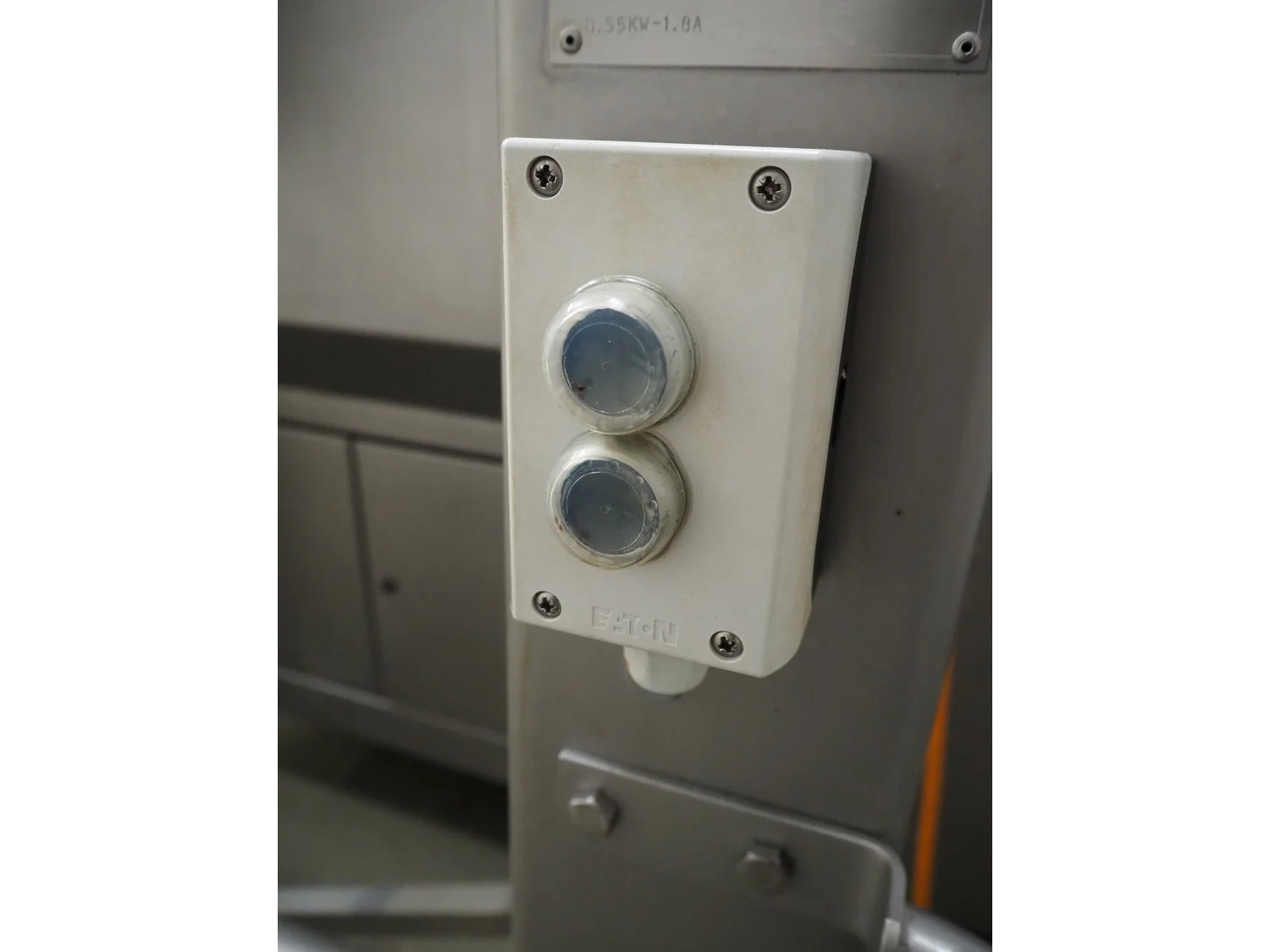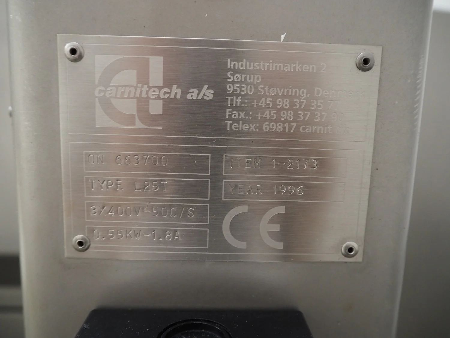 Carnitech a/s mobile lifter for 200 liter meat bins, type: L25T, number: 663700, year of construction: 1996, 400 V, 3 Ph, 50 Hz, .18 A, 0.55 kW, lifting height: 2100 mm, total dimensions: 1300 mm x 1400 mm x 2900 mm.