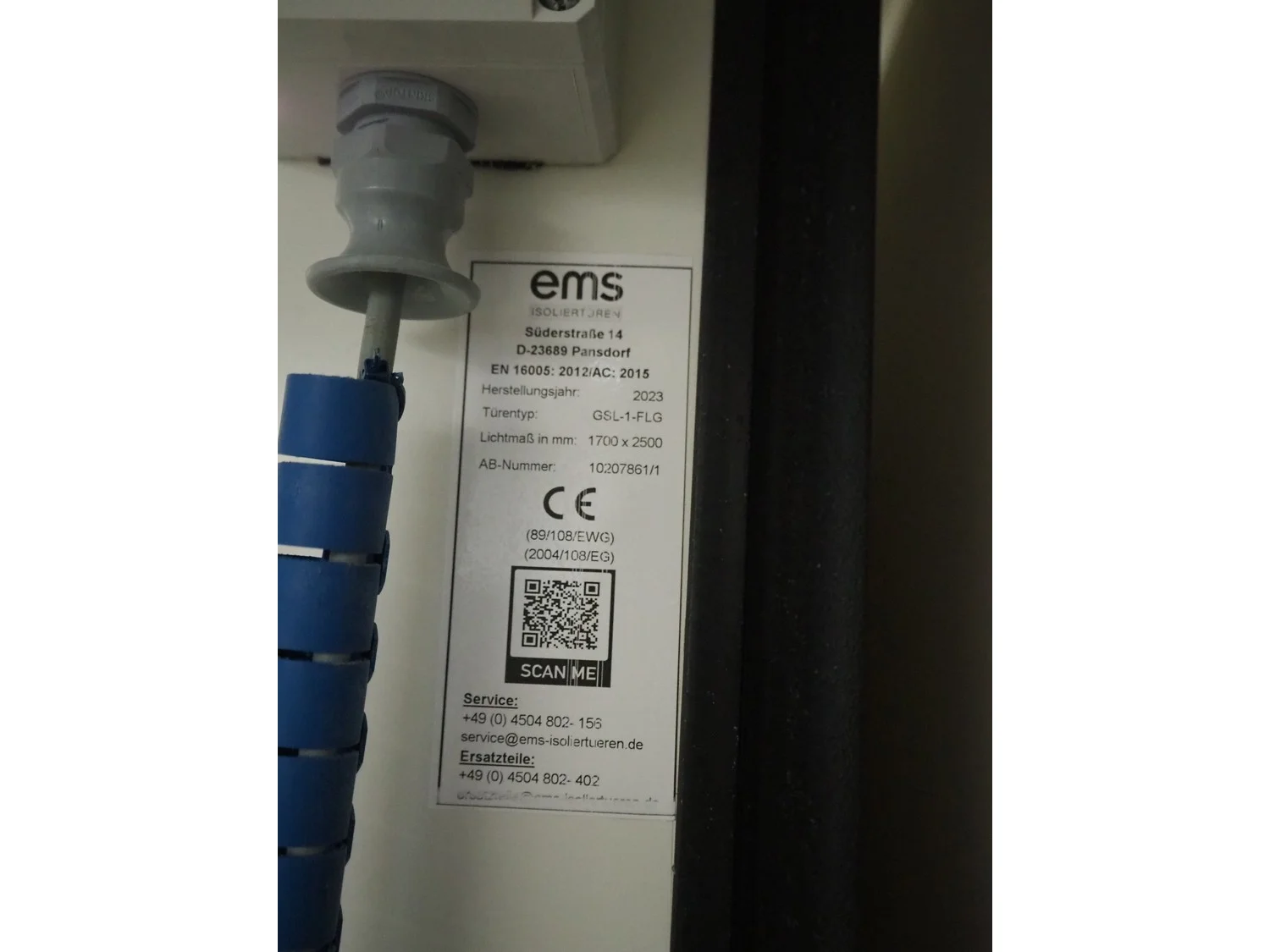 EMS refrigerated sliding door, type: GSL-1-FLG, number: 10207861/1, year of construction: 2023, thickness door: 120 mm, dimensions door: 1700 mm x 2500 mm, length rails: 3000 mm.