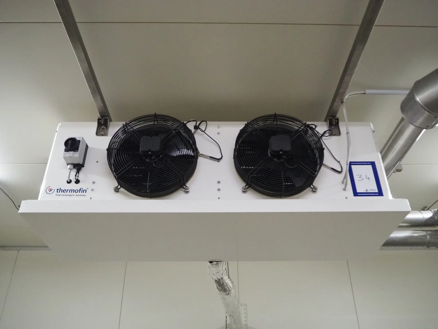 Thermofin GmbH evaporator, type: TAN. 2-040-12-E-N-W5-12-HG LKS, year of construction: 11/2020, 230 V, 0.40/0.50 kW, temperature range: -25/60°C, 2 fans, dimensions: 1800 mm x 600 mm x 600 mm.