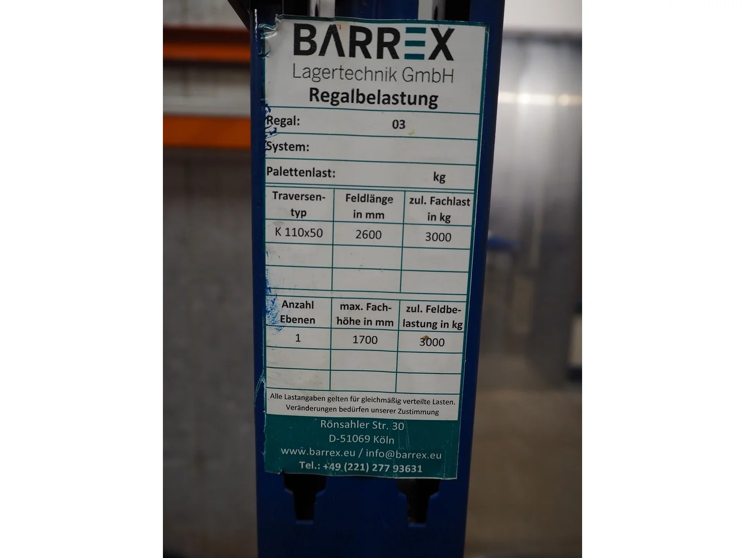 Barrex Lagertechnik GmbH steel pallet rack consisting of: 9 uprights, dimensions: (9x) 1100 mm x 2000 mm, 14 beams, length: (12x) 2650 mm and (2x) 3500 mm.