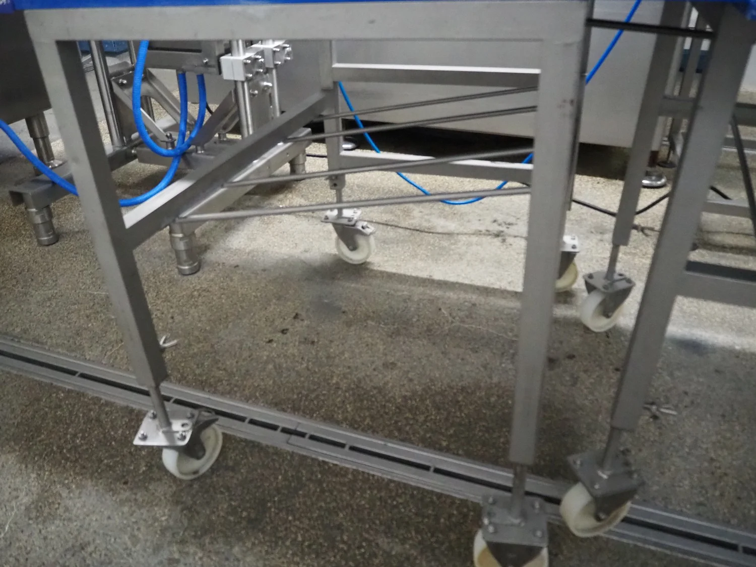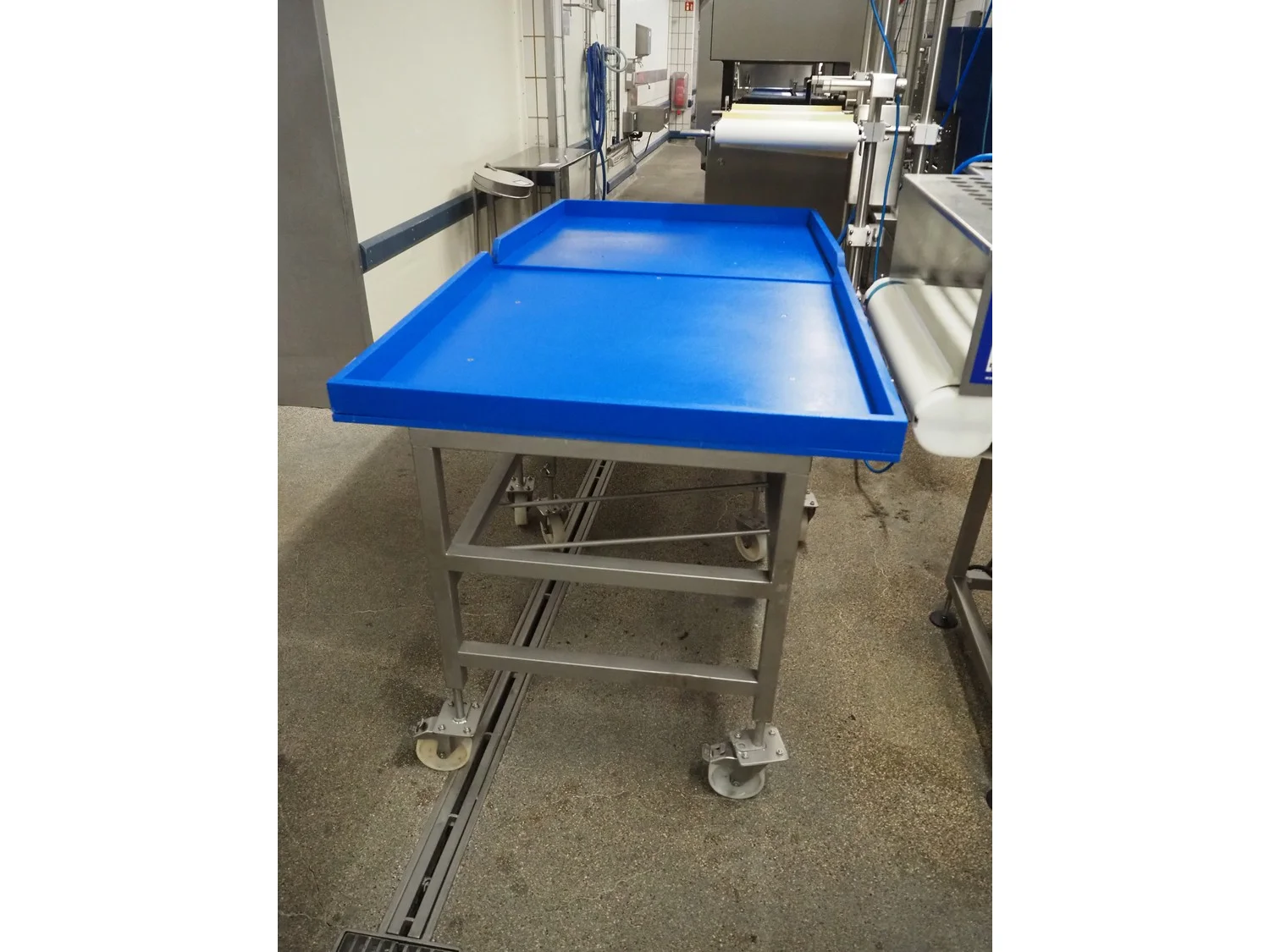 2 mobile tables, s/s frame, plastic top, dimensions: (2x) 1000 mm x 1000 mm x 950 mm.
