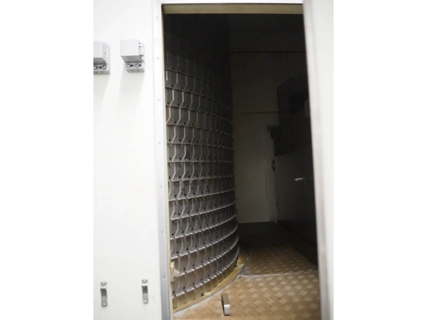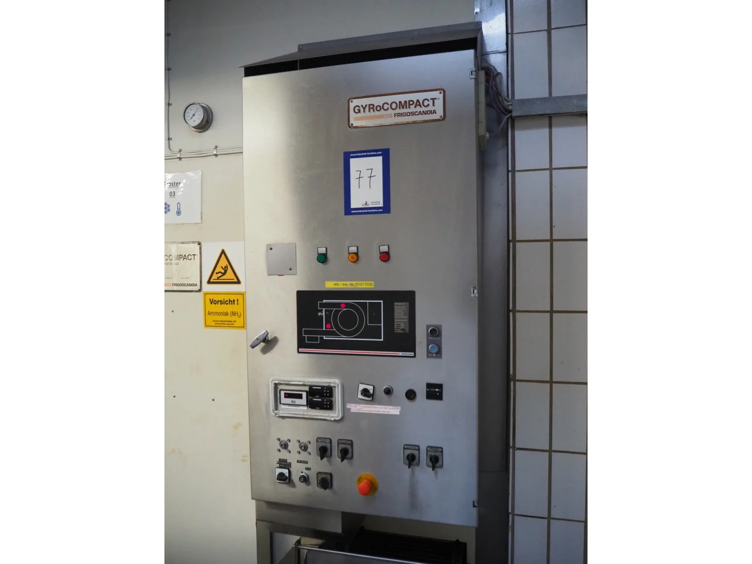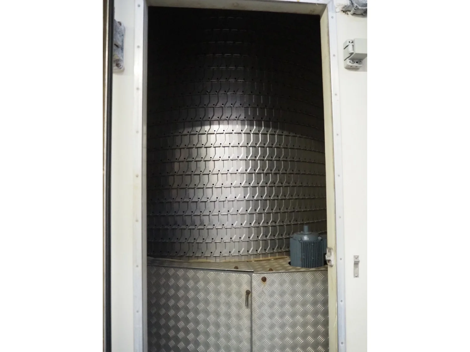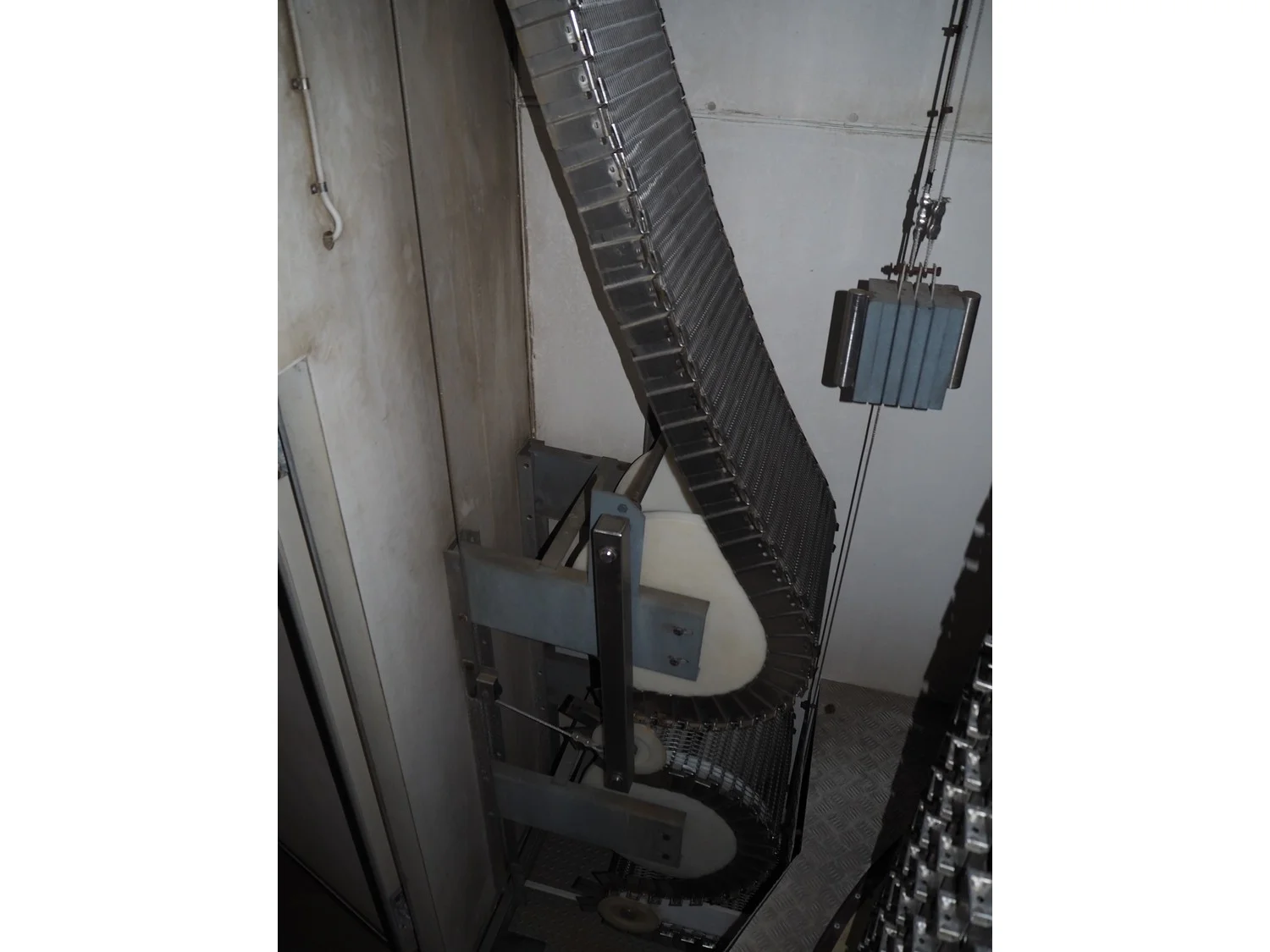 Frigoscandia Gyrocompact® spiral freezer, model: GC P 42-09-25-06, number: 470372, North-North, refrigerant: NH3, 25 floors, Frigobelt s/s mesh belt, total belt width: 420 mm, netto belt width: 375 mm, infeed height: 560 mm, outfeed height: 2900 mm, Güntner evaporator, number: 101167571, year of construction evaporator: 2021, volume: 300.9 liter, temperature range: -50/+150°C, total dimensions: 8000 mm x 2450 mm x 3500 mm.