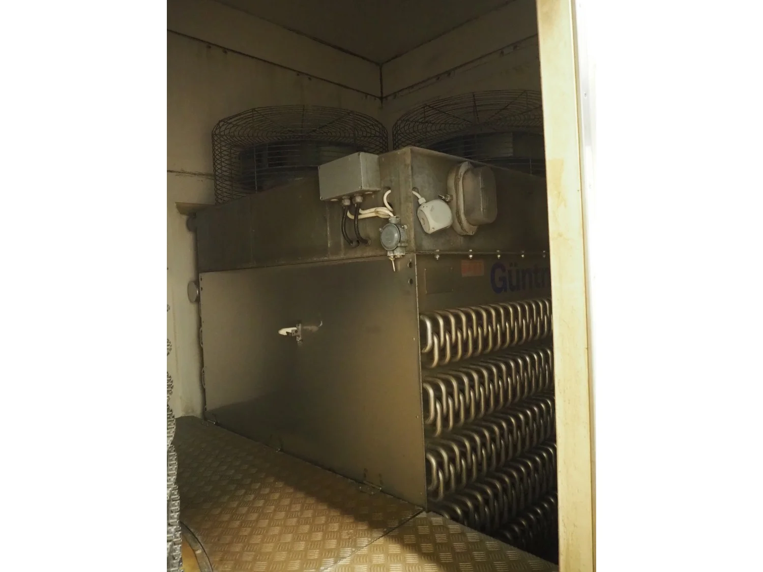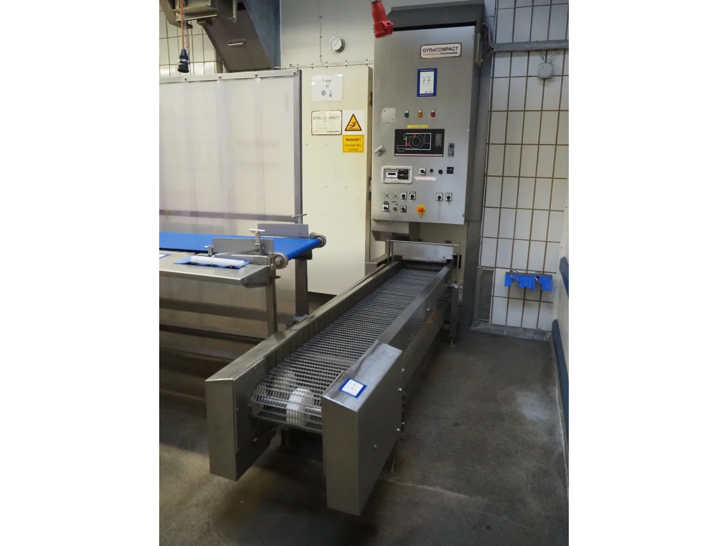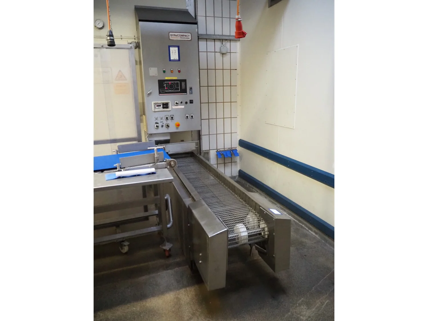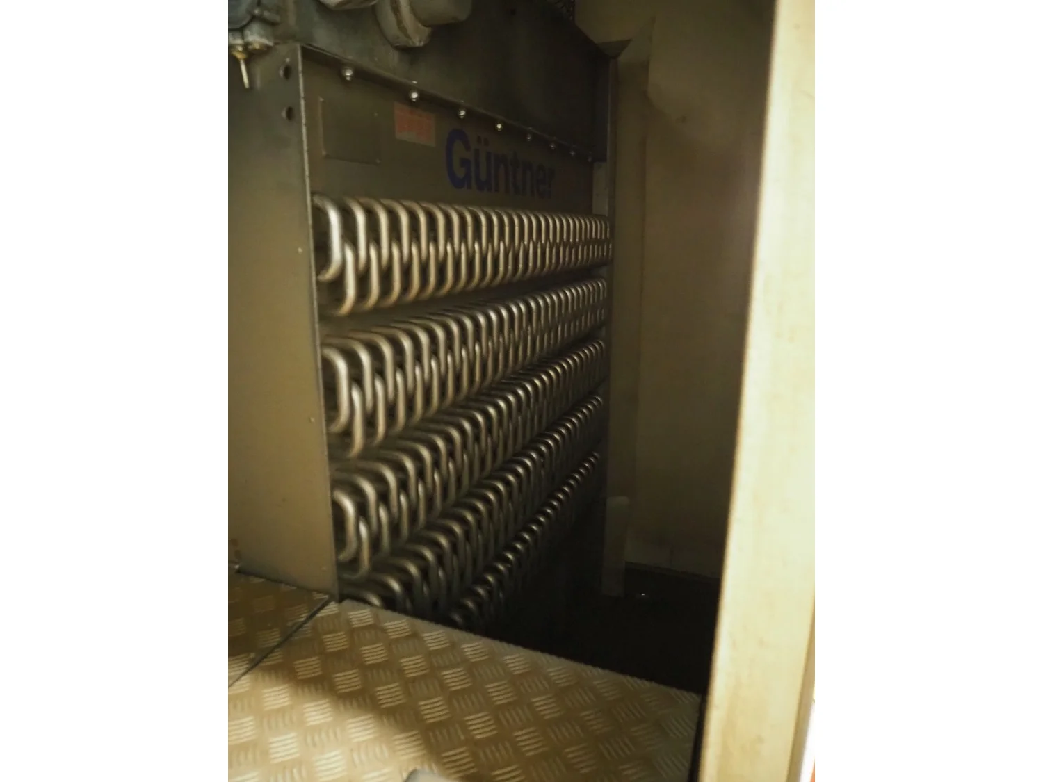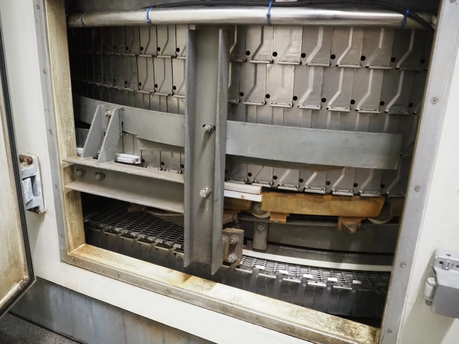 Frigoscandia Gyrocompact® spiral freezer, model: GC P 42-09-25-06, number: 470372, North-North, refrigerant: NH3, 25 floors, Frigobelt s/s mesh belt, total belt width: 420 mm, netto belt width: 375 mm, infeed height: 560 mm, outfeed height: 2900 mm, Güntner evaporator, number: 101167571, year of construction evaporator: 2021, volume: 300.9 liter, temperature range: -50/+150°C, total dimensions: 8000 mm x 2450 mm x 3500 mm.