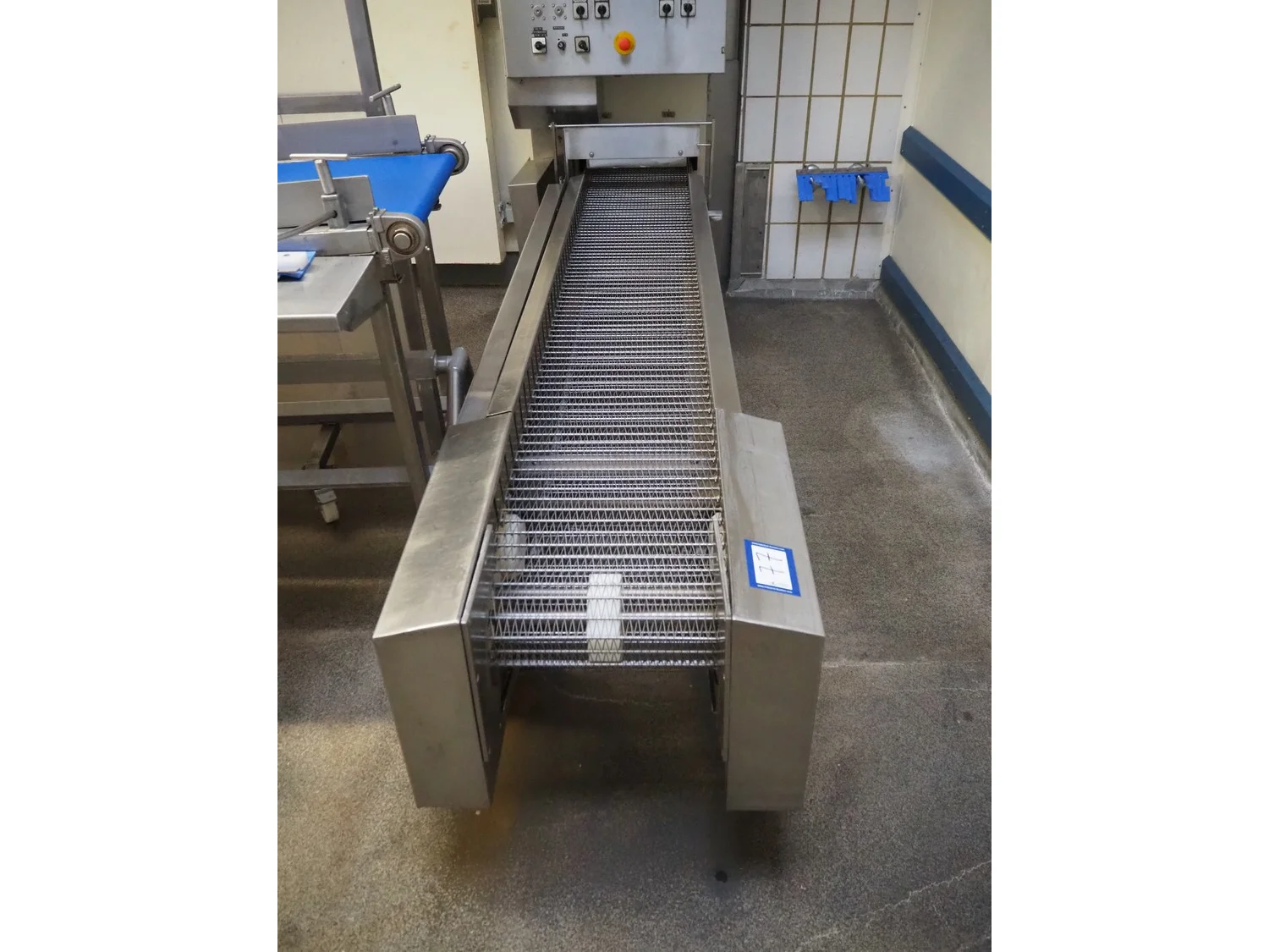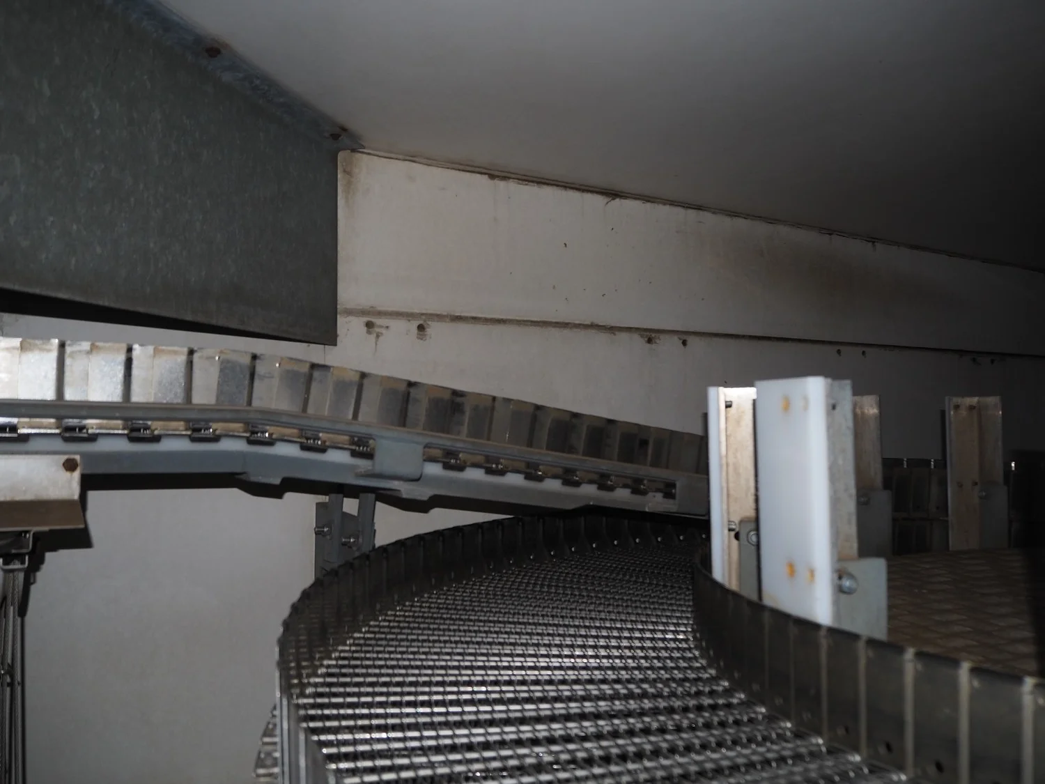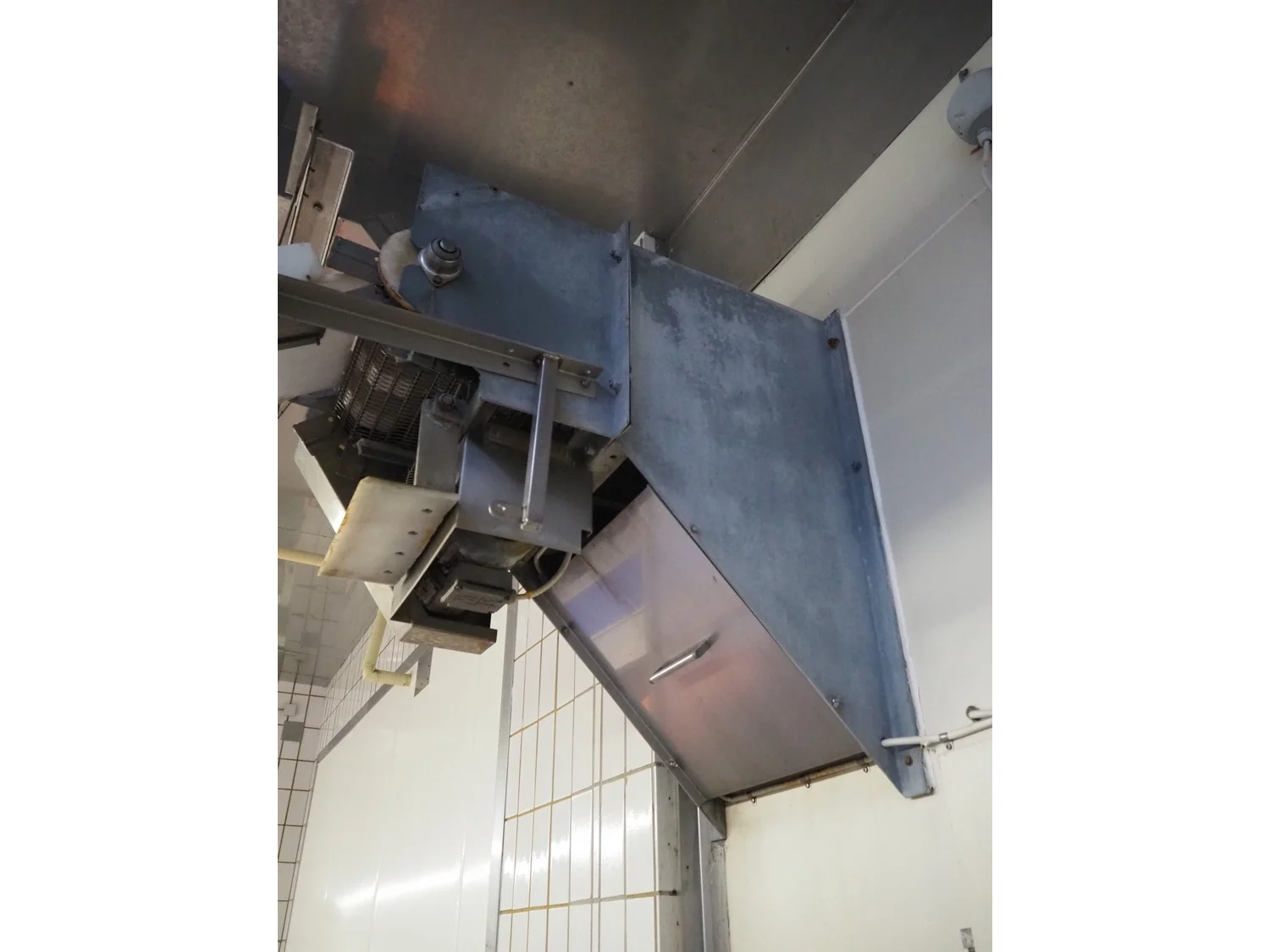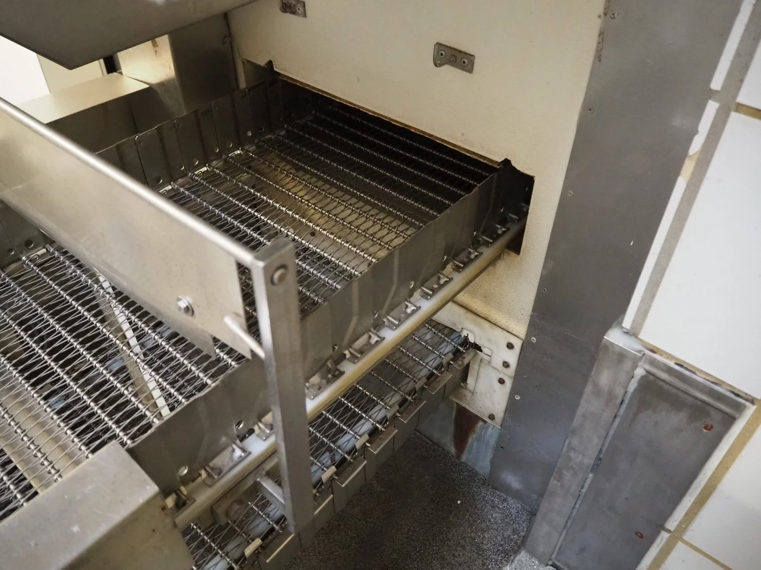 Frigoscandia Gyrocompact® spiral freezer, model: GC P 42-09-25-06, number: 470372, North-North, refrigerant: NH3, 25 floors, Frigobelt s/s mesh belt, total belt width: 420 mm, netto belt width: 375 mm, infeed height: 560 mm, outfeed height: 2900 mm, Güntner evaporator, number: 101167571, year of construction evaporator: 2021, volume: 300.9 liter, temperature range: -50/+150°C, total dimensions: 8000 mm x 2450 mm x 3500 mm.