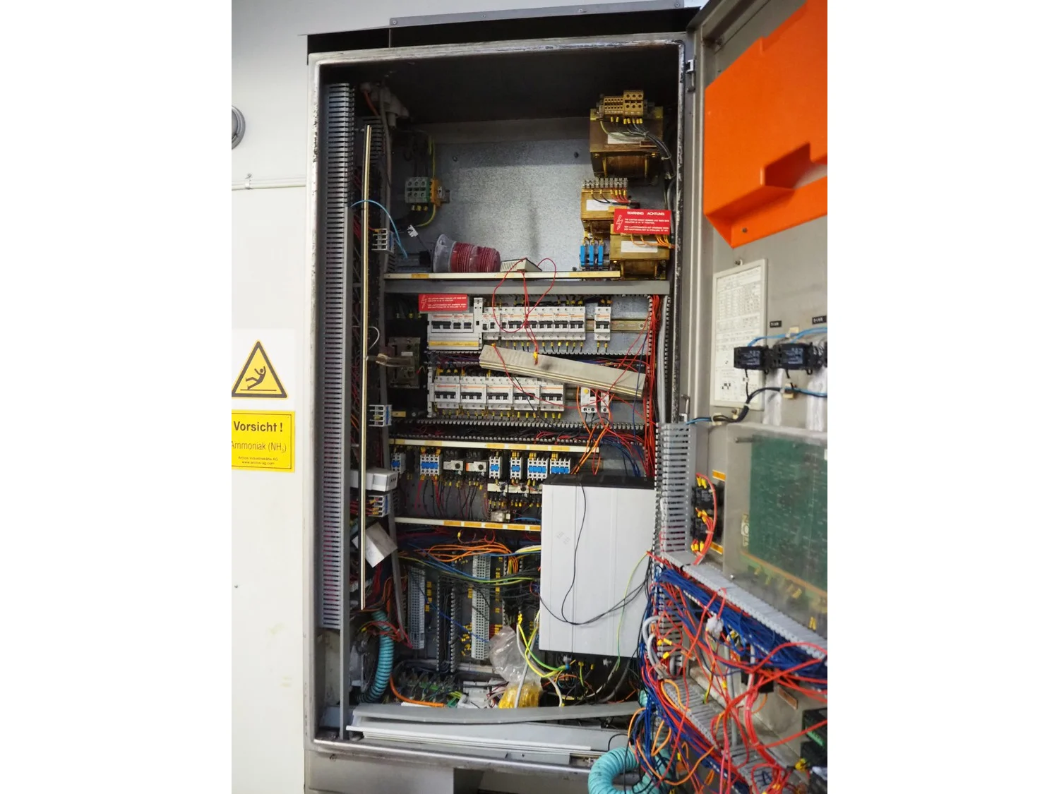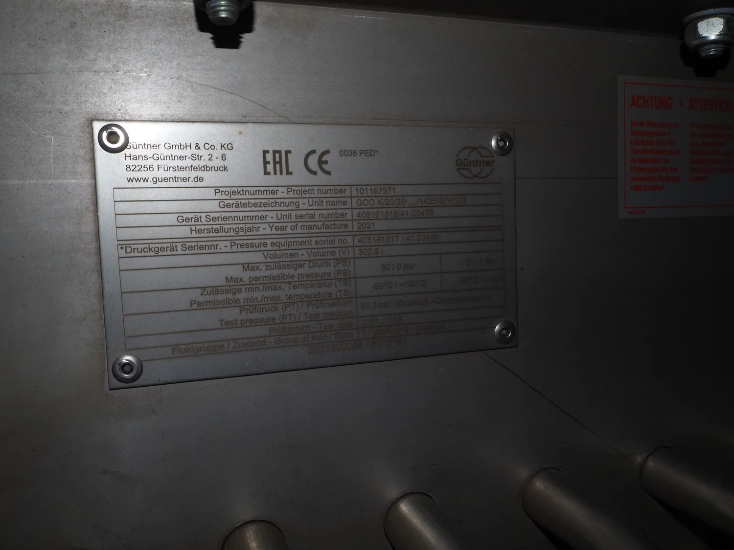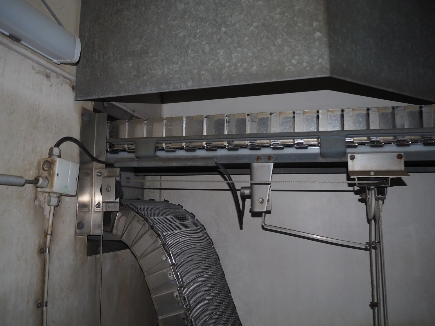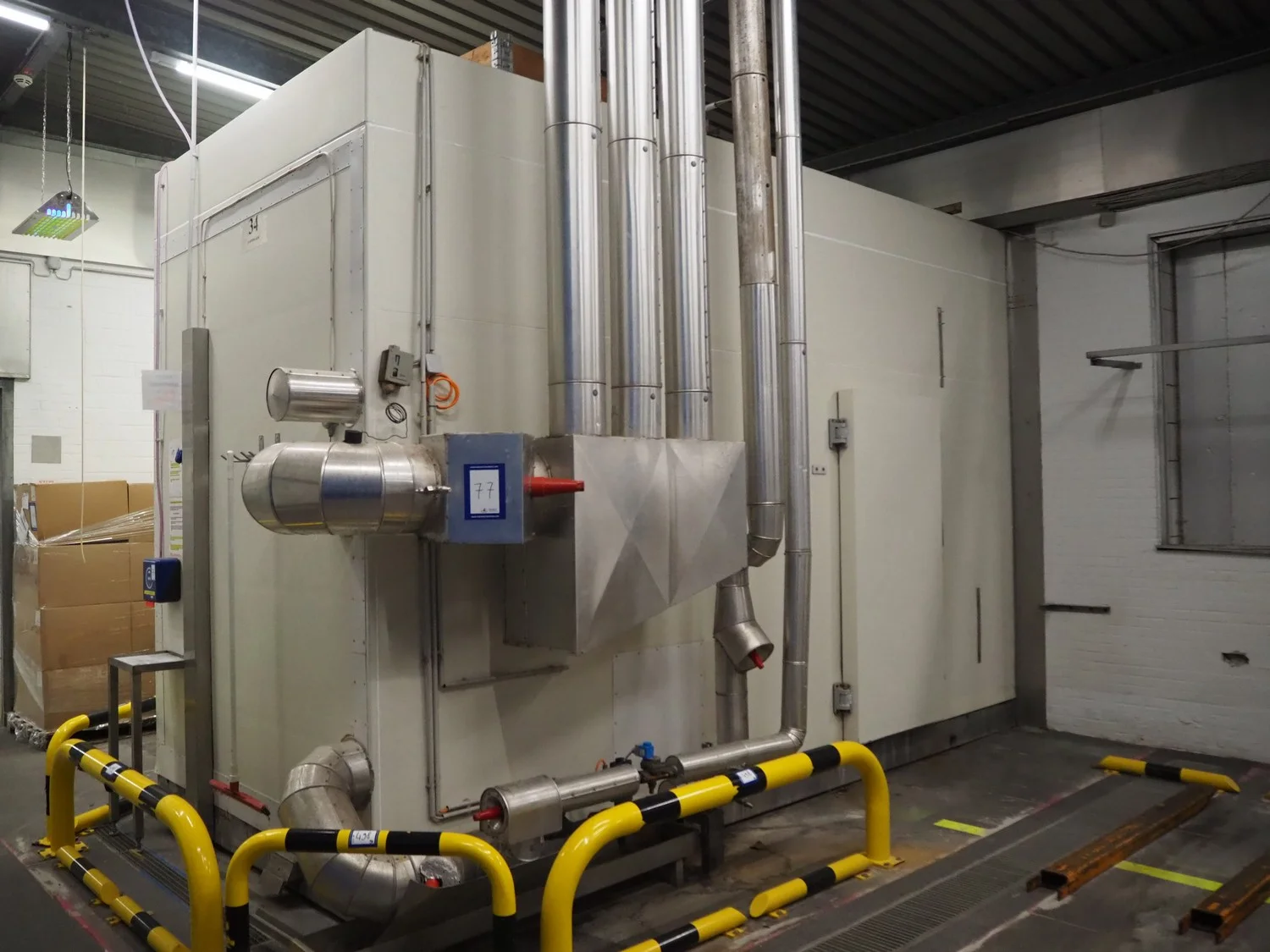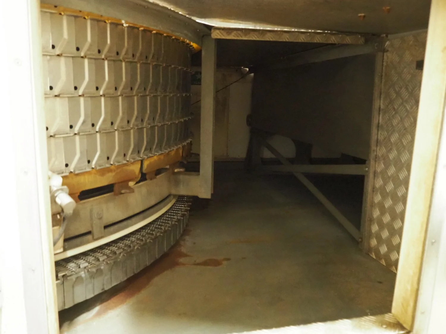 Frigoscandia Gyrocompact® spiral freezer, model: GC P 42-09-25-06, number: 470372, North-North, refrigerant: NH3, 25 floors, Frigobelt s/s mesh belt, total belt width: 420 mm, netto belt width: 375 mm, infeed height: 560 mm, outfeed height: 2900 mm, Güntner evaporator, number: 101167571, year of construction evaporator: 2021, volume: 300.9 liter, temperature range: -50/+150°C, total dimensions: 8000 mm x 2450 mm x 3500 mm.